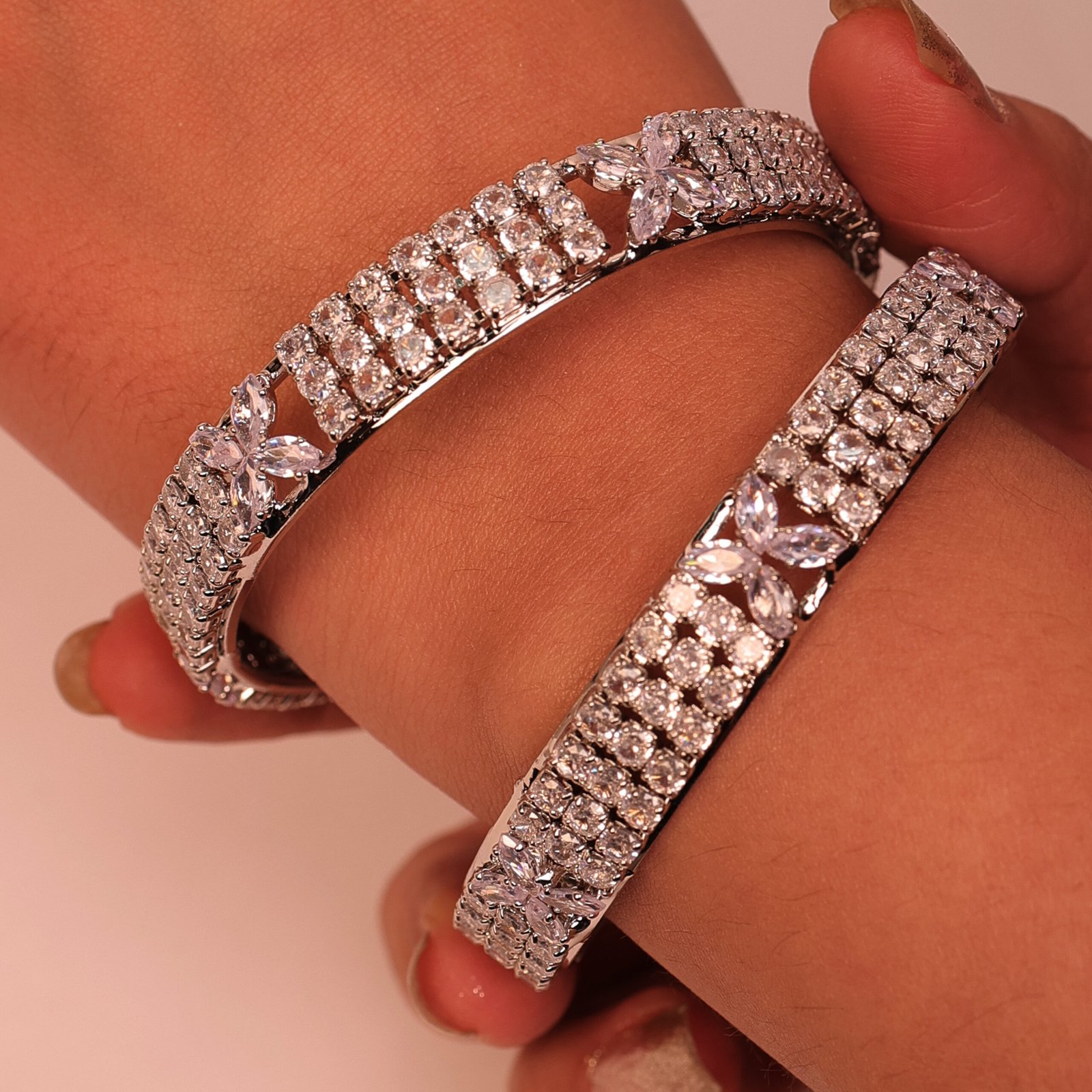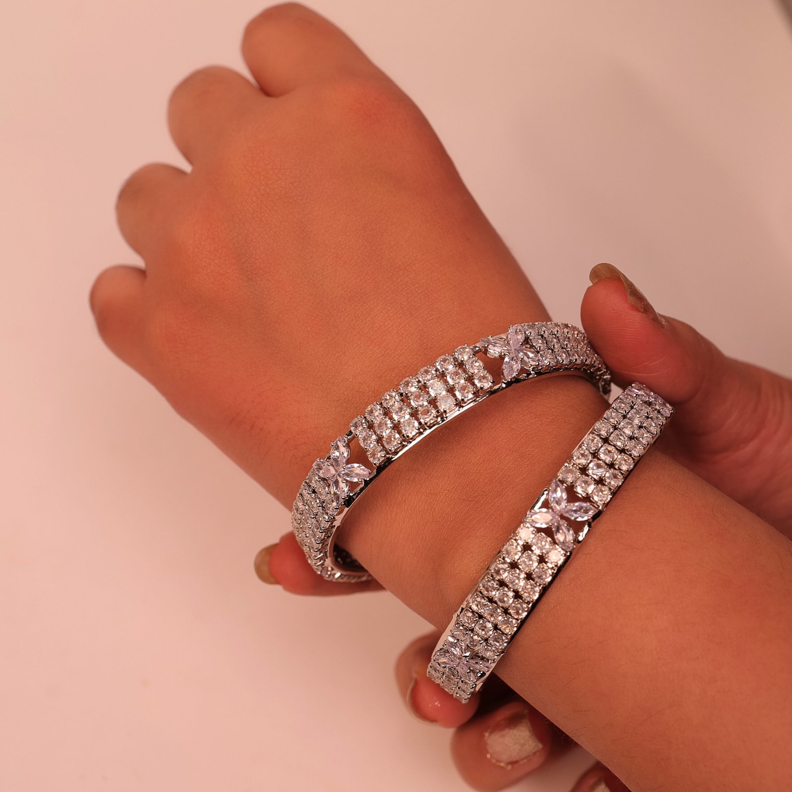 Add a touch of grace to your ethnic and festive outfits with this set of 4 American Diamond bangles. Silver-plated and studded with high-quality white AD stones, these bangles offer a refined and authentic traditional look. Suitable for women and girls, they combine classic Indian aesthetics with contemporary elegance. Ideal for special occasions like weddings, parties, and festivals, or even as a statement accessory for everyday ethnic wear. Crafted for comfort and style, this bangle set is a must-have addition to any jewellery collection.