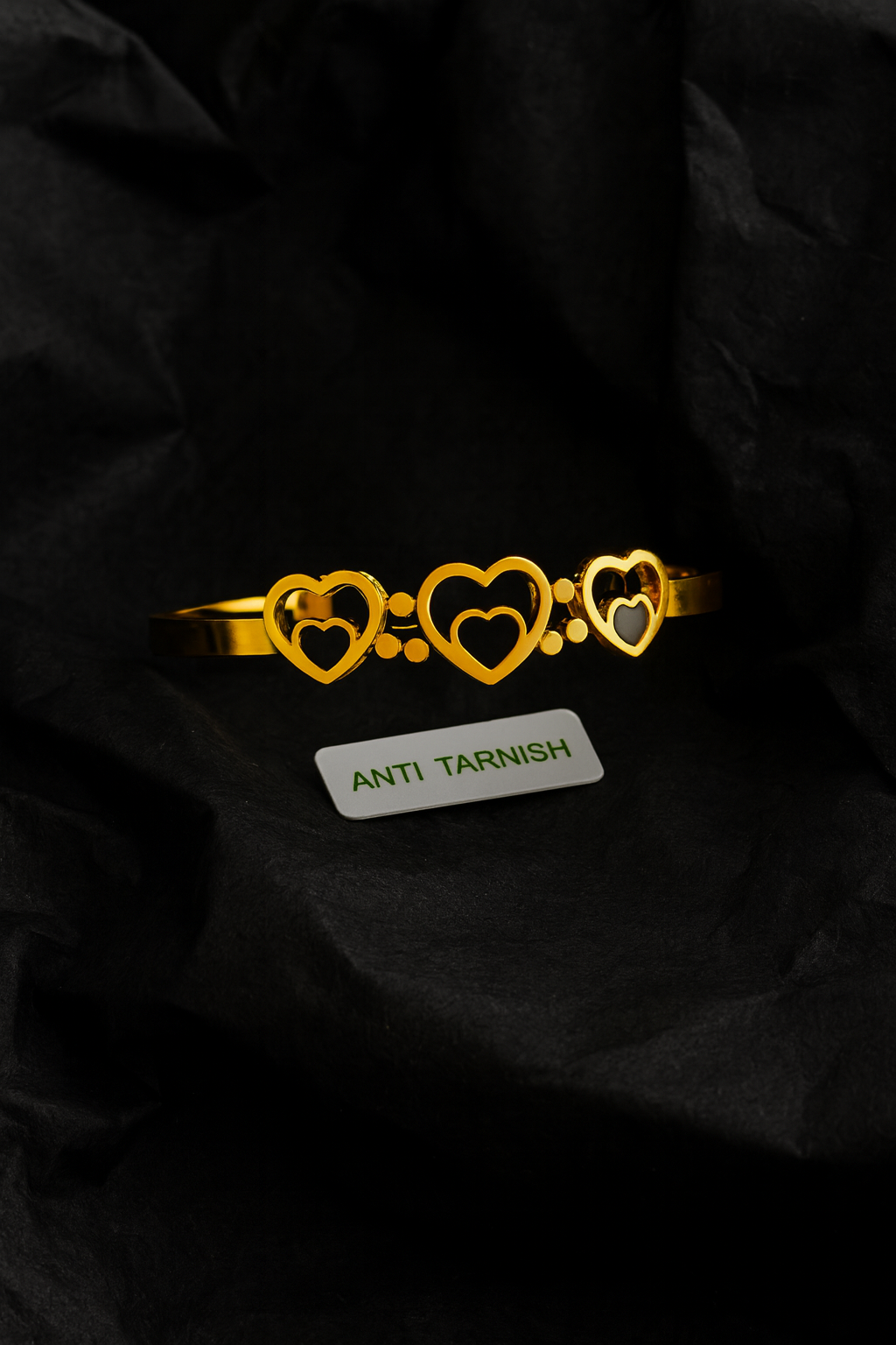 This stunning anti-tarnish bracelet is designed to shine for years without losing its luster. Featuring three interlinked gold-plated hearts with elegant black enamel accents, it perfectly blends modern charm with everyday durability. Lightweight and comfortable, this bracelet is ideal for daily wear, special occasions, or as a thoughtful gift. A timeless piece that stays as radiant as your style.