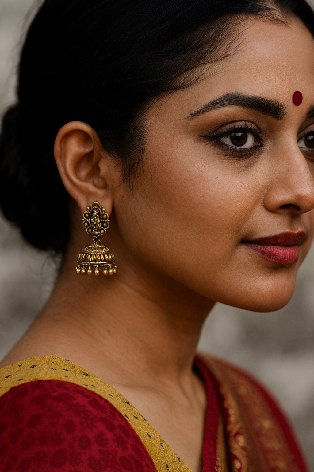 Exquisitely crafted antique gold-plated temple jhumkas featuring intricate detailing and a classic dome design. Embellished with delicate hanging beads, these earrings capture the timeless charm of South Indian heritage jewelry. Perfect for weddings, festive occasions, and traditional attire, they add elegance and grace to any look.