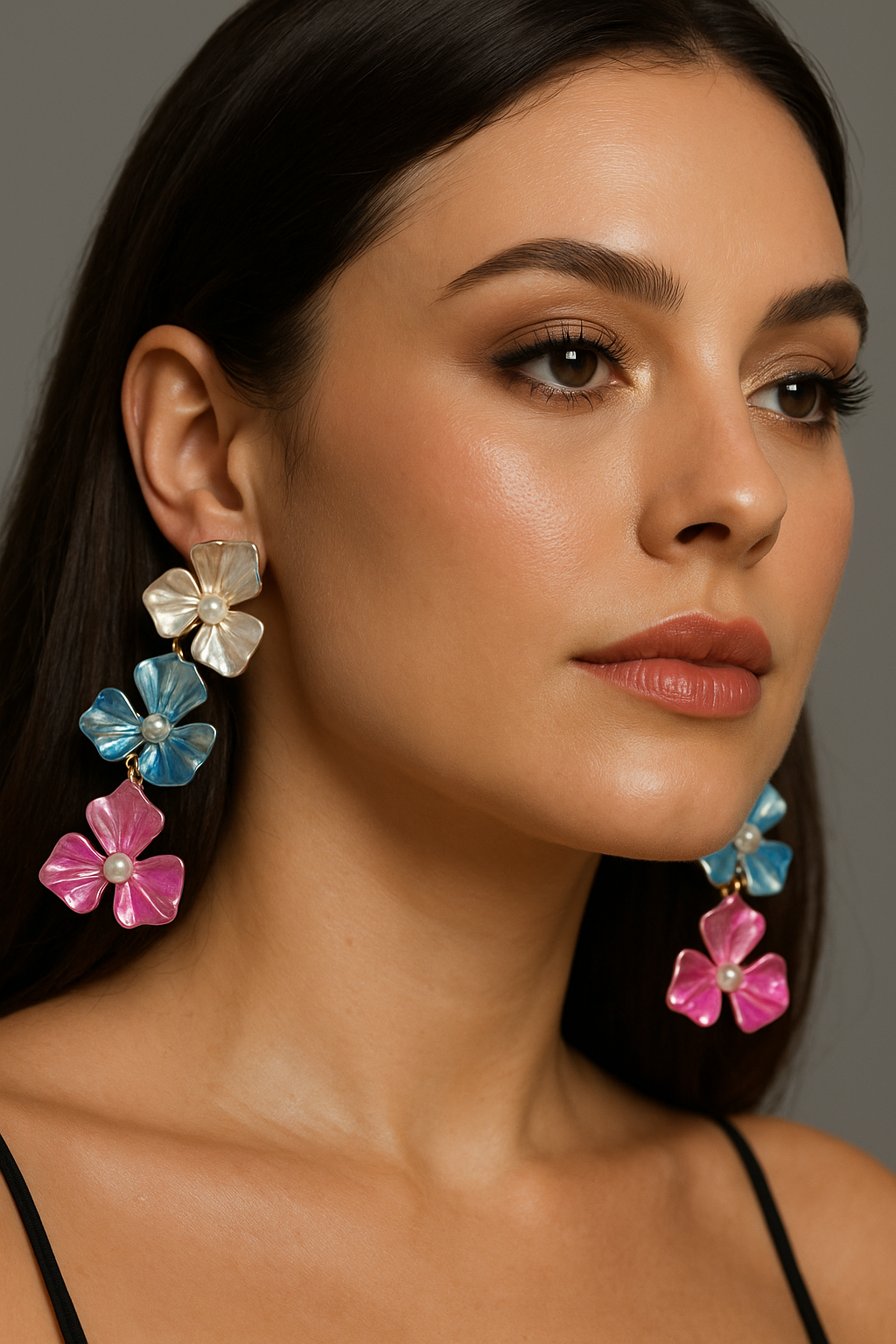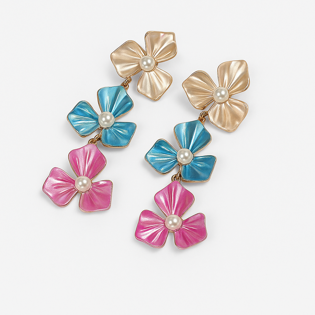 Turn heads with our statement Blooming Glam Earrings, crafted in a cascading three-flower design. Featuring iridescent petals in pearl white, ocean blue, and vibrant pink, each bloom is accented with a delicate pearl at its heart. Perfect for adding a pop of color and elegance, these earrings blend playful charm with glamorous sophistication — ideal for parties, festive occasions, or a bold everyday look.