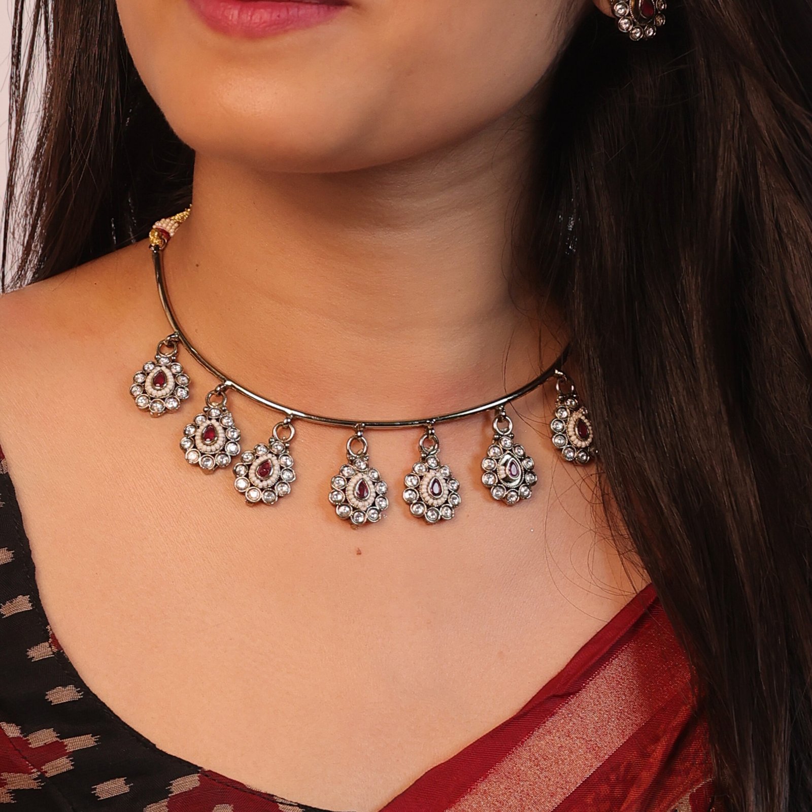 Elegance Polki Style Gold Plated hasli Necklace Mini Drop Earrings Jewellery Set Red