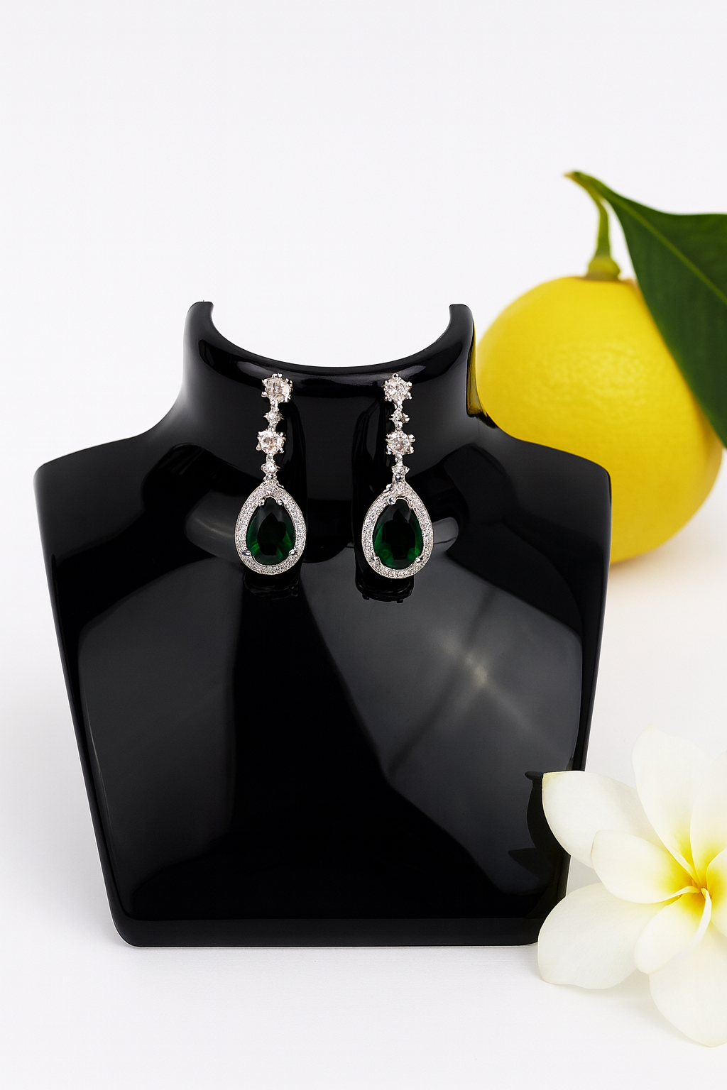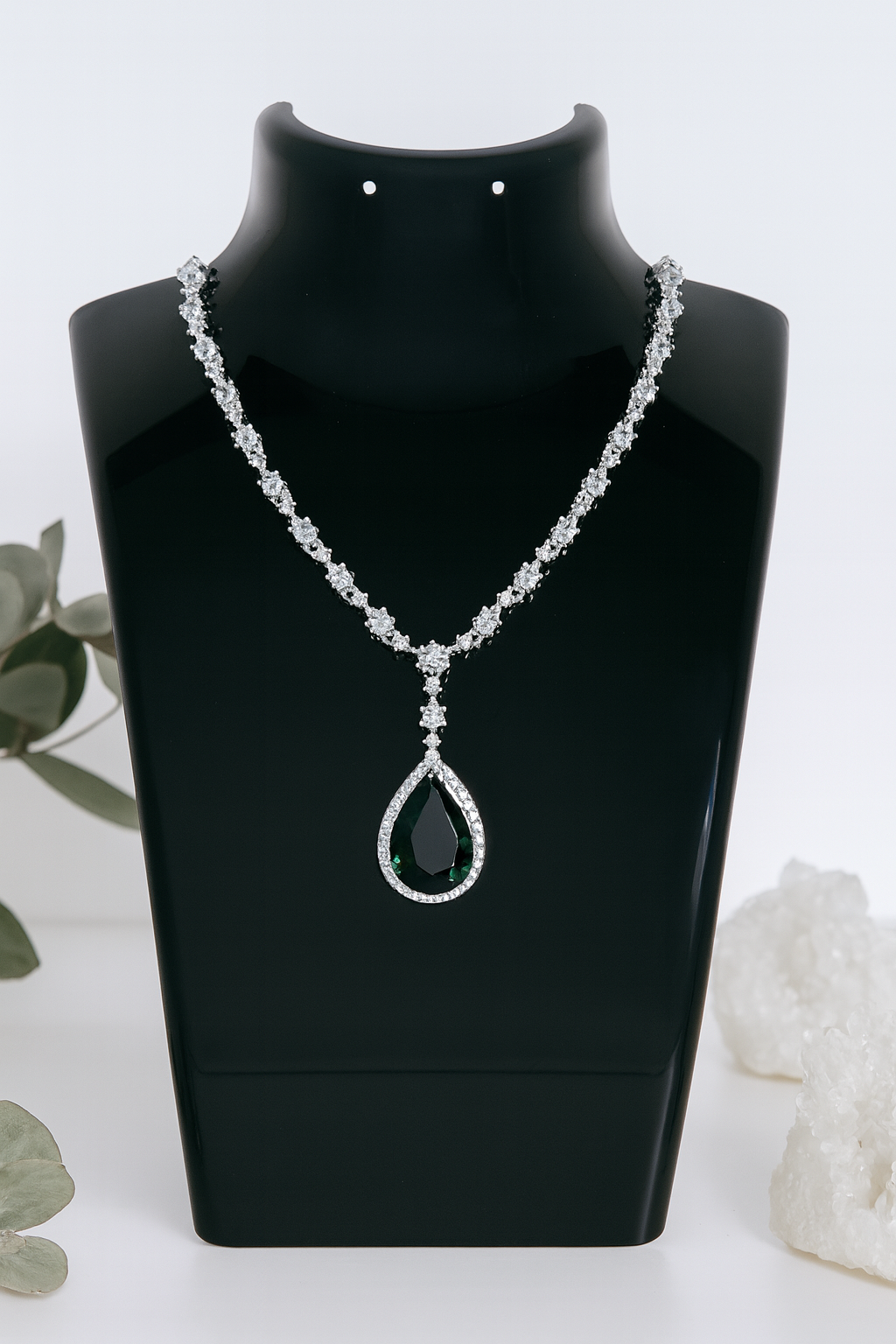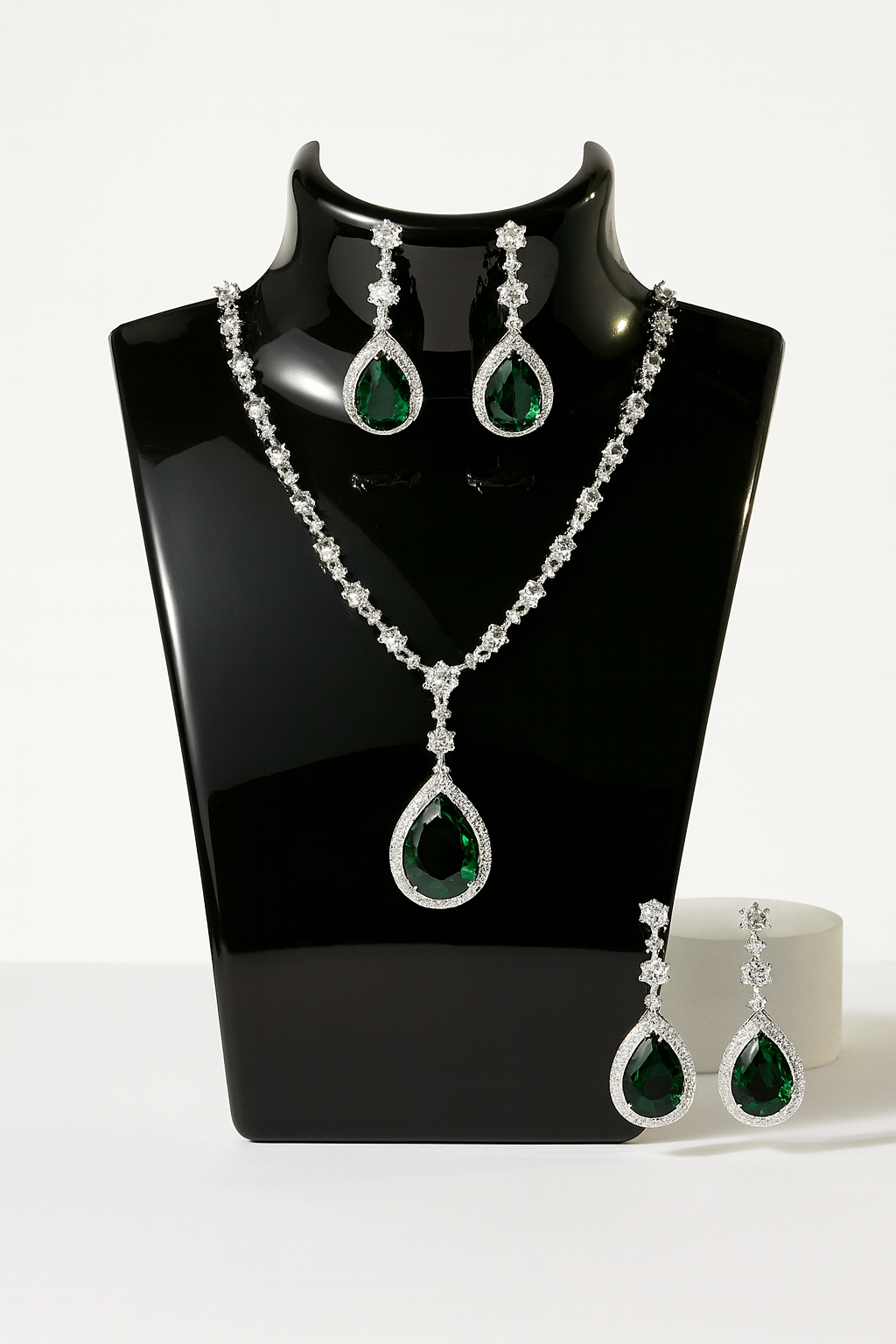 This exquisite jewelry set features a dazzling necklace and matching drop earrings adorned with stunning emerald-green teardrop stones. Surrounded by shimmering diamond-like accents, the intricate design radiates sophistication and timeless beauty. Perfect for weddings, evening galas, or special occasions, this set adds a touch of luxury and elegance to any look.
