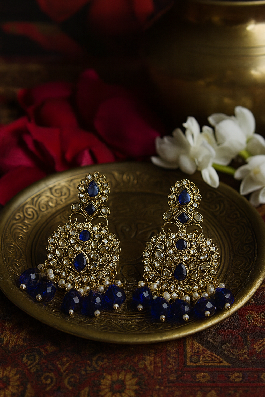 These exquisite traditional earrings feature intricate gold-plated filigree work adorned with sparkling kundan stones and deep blue gemstones. The design is enhanced with teardrop-shaped blue crystal drops and delicate pearl accents, creating a perfect balance of elegance and heritage. Ideal for weddings, festive occasions, or pairing with ethnic attire, these statement earrings embody timeless Indian craftsmanship with a modern royal touch.