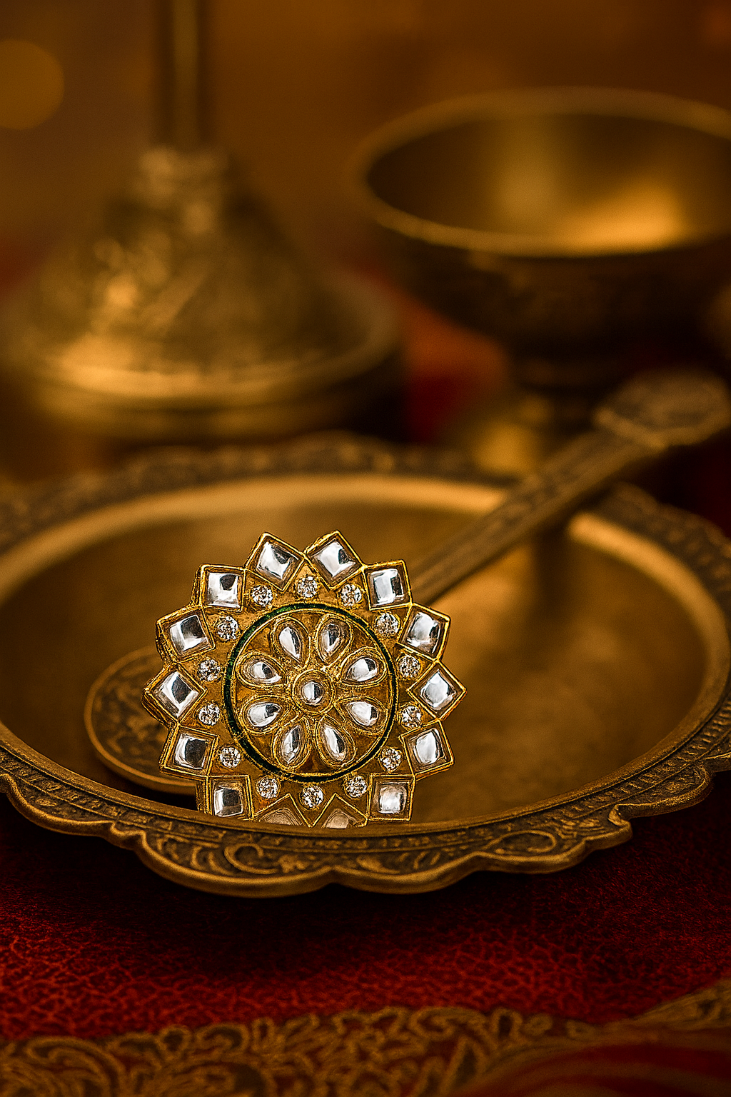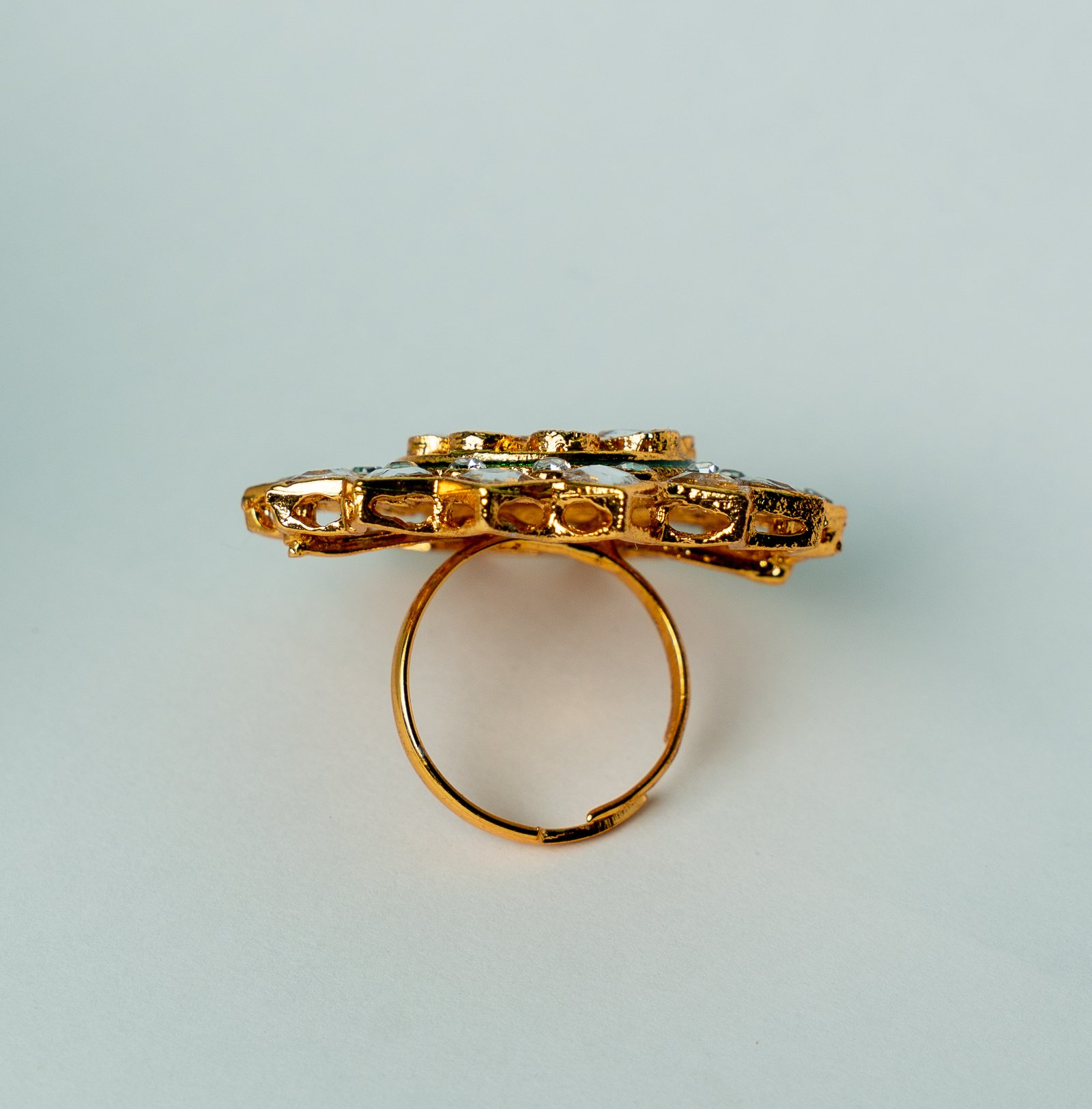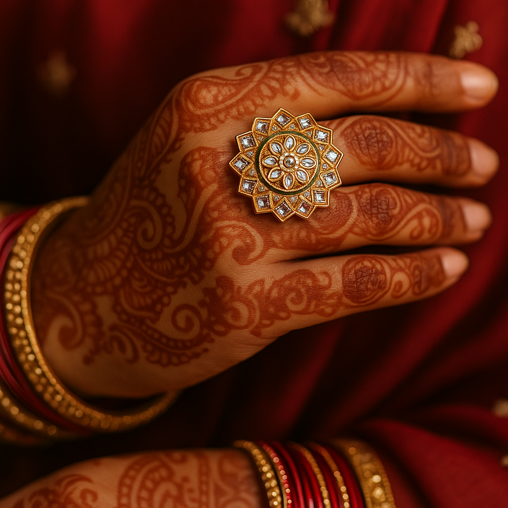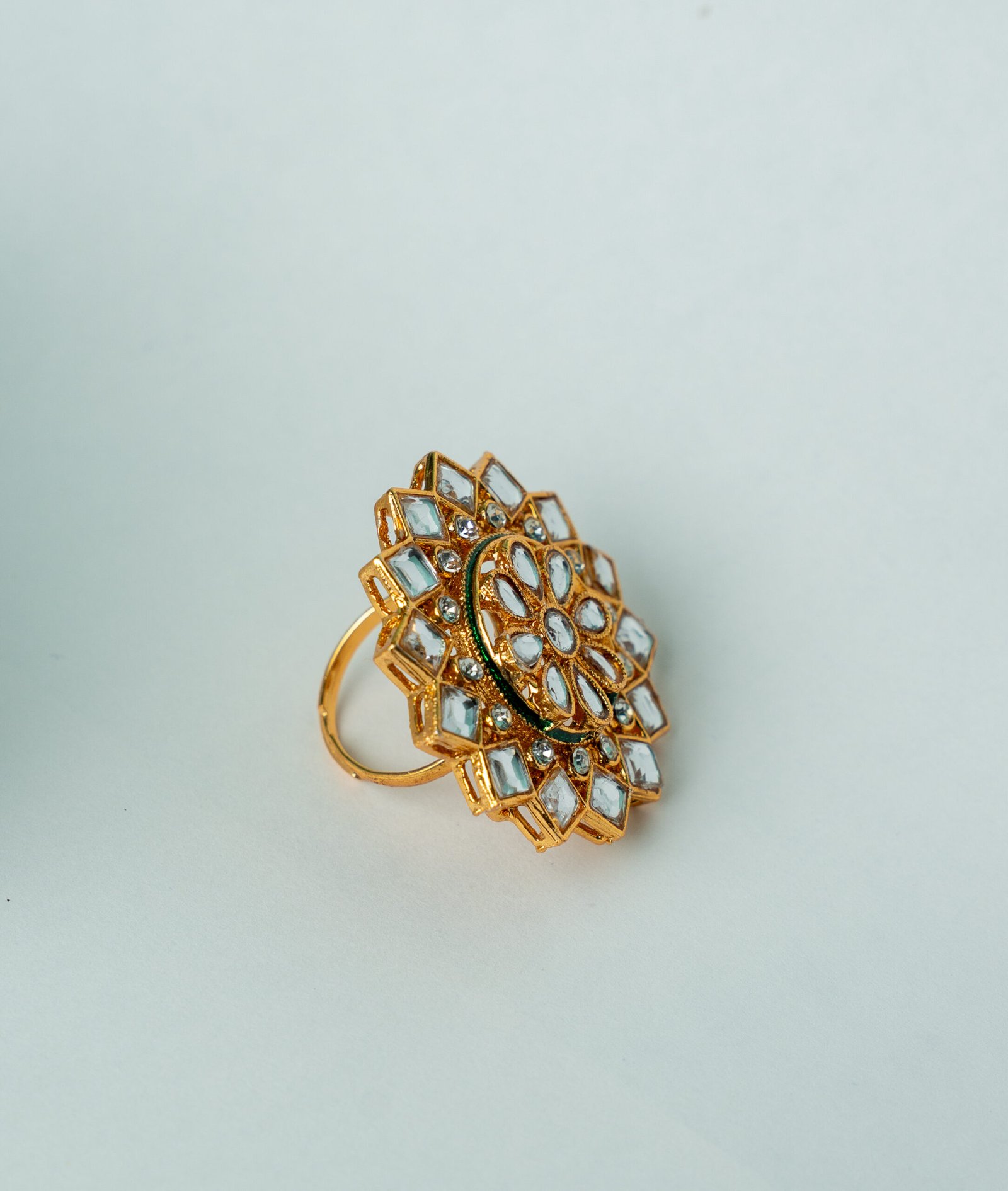 Add a royal touch to your look with this intricately designed gold-plated Kundan statement ring. Crafted with a floral motif at the center, surrounded by dazzling mirror-polished stones, this piece is perfect for weddings, festive occasions, and traditional celebrations. Its timeless design ensures it pairs beautifully with ethnic as well as fusion outfits, making it a must-have in your jewelry collection.