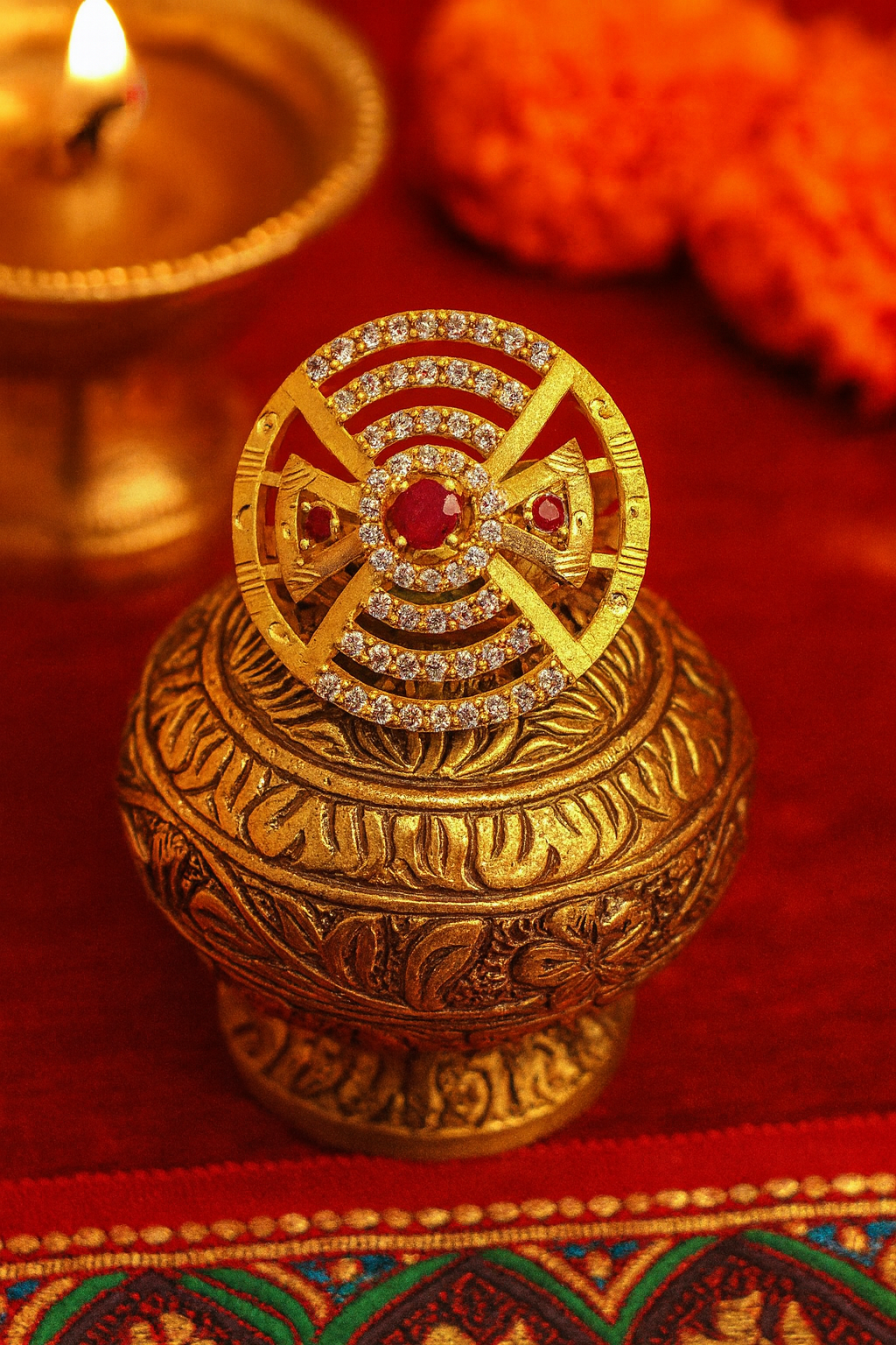 A stunning statement ring crafted in gold, featuring a bold geometric design adorned with sparkling diamonds and rich red rubies. The central ruby draws attention with its deep hue, while the surrounding diamonds add brilliance and elegance. Perfect for festive occasions, weddings, or adding a touch of luxury to any outfit.