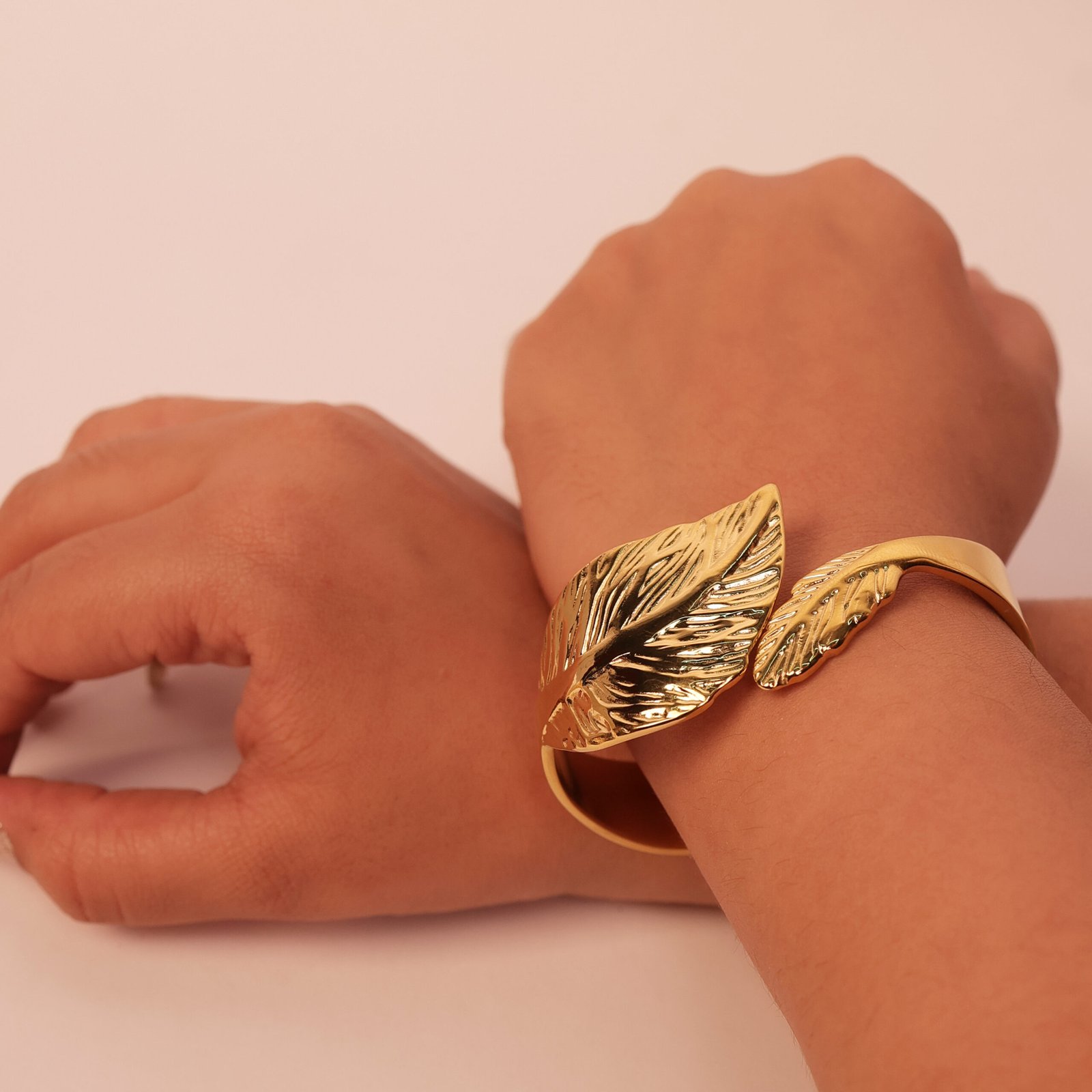 Add a touch of bohemian elegance to your jewellery collection with this stunning gold-tone feather wrap bangle. This beautifully crafted cuff bracelet features an intricate feather design with delicate etched details that catch the light wonderfully. The wrap-around style creates a unique, adjustable fit that gracefully adorns your wrist. Perfect for both casual and formal occasions, this versatile piece can be styled with traditional Indian wear or contemporary western outfits. The durable metal construction ensures long-lasting wear, while the polished finish adds a luxurious touch.