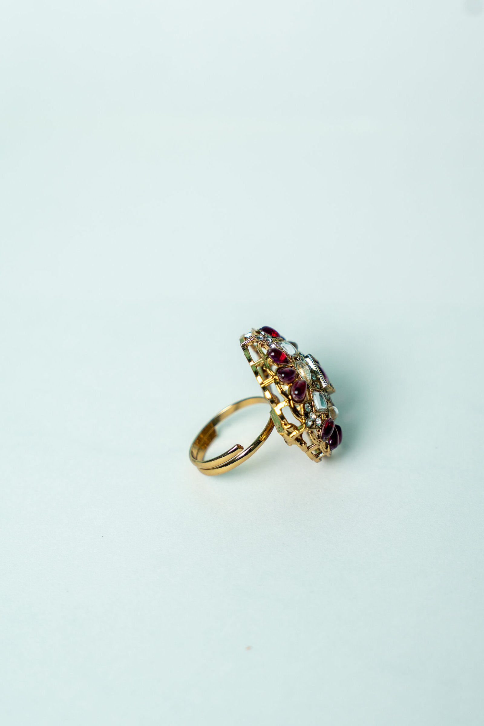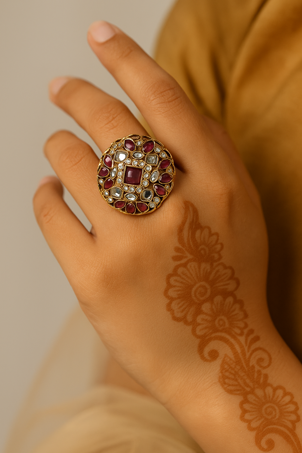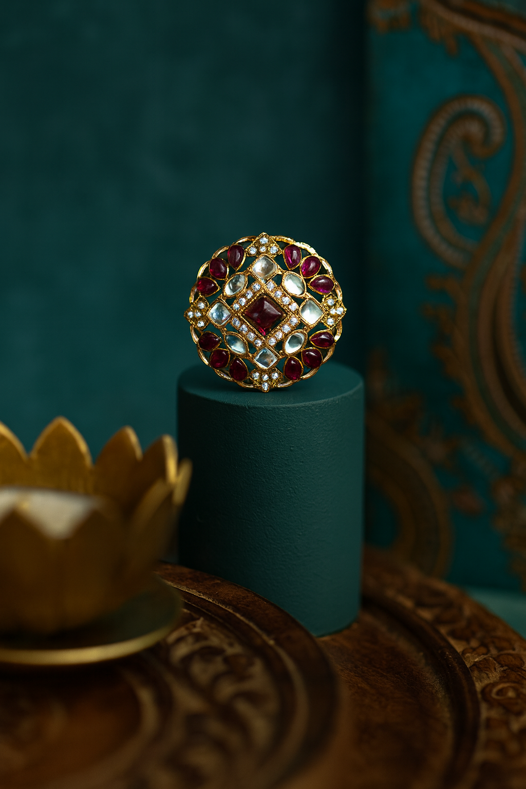 A statement-making cocktail ring crafted with traditional kundan work, embellished with deep red ruby stones and sparkling white crystals. The intricate circular design exudes regal charm, making it perfect for weddings, festive occasions, or pairing with ethnic outfits. This timeless piece blends classic artistry with modern elegance, adding a royal touch to your jewelry collection.