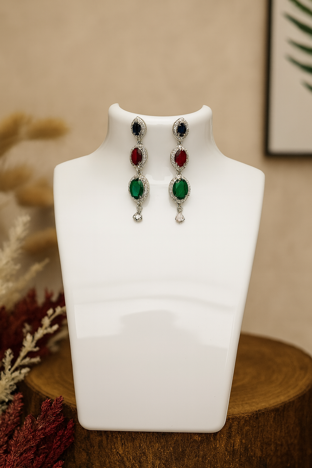 A dazzling jewelry set featuring a statement necklace and matching earrings, adorned with vibrant multicolored gemstones in rich hues of blue, green, red, and pink. Each stone is delicately framed with shimmering cubic zirconia, enhancing its brilliance and elegance. Perfect for weddings, parties, or festive occasions, this set adds a regal charm to any outfit.