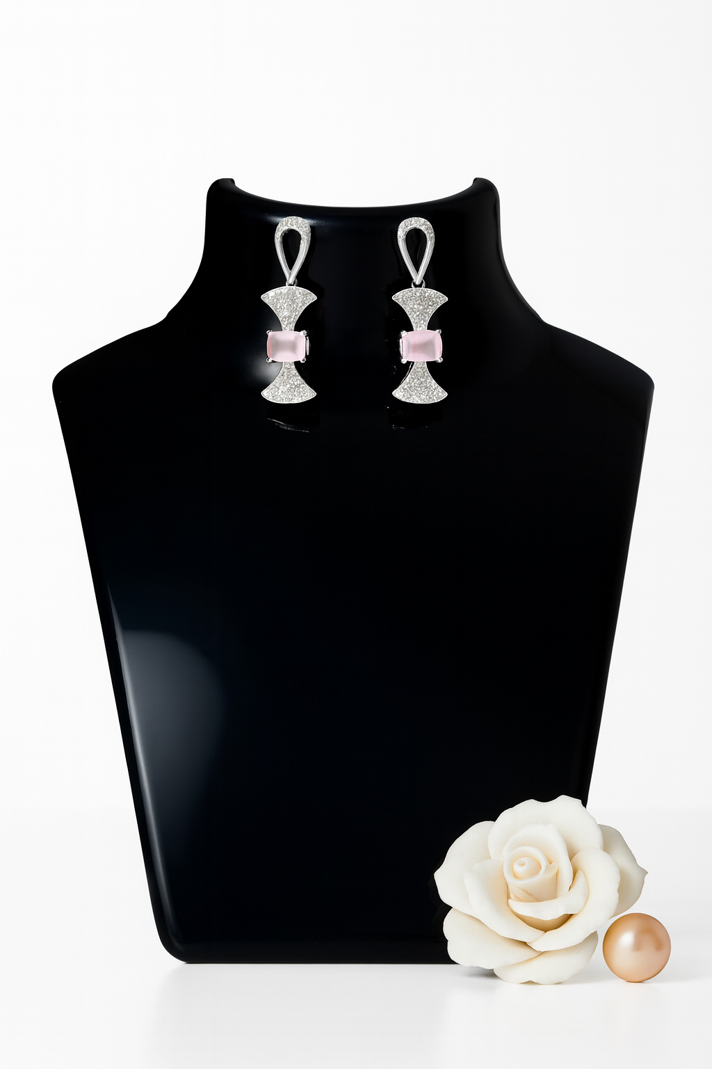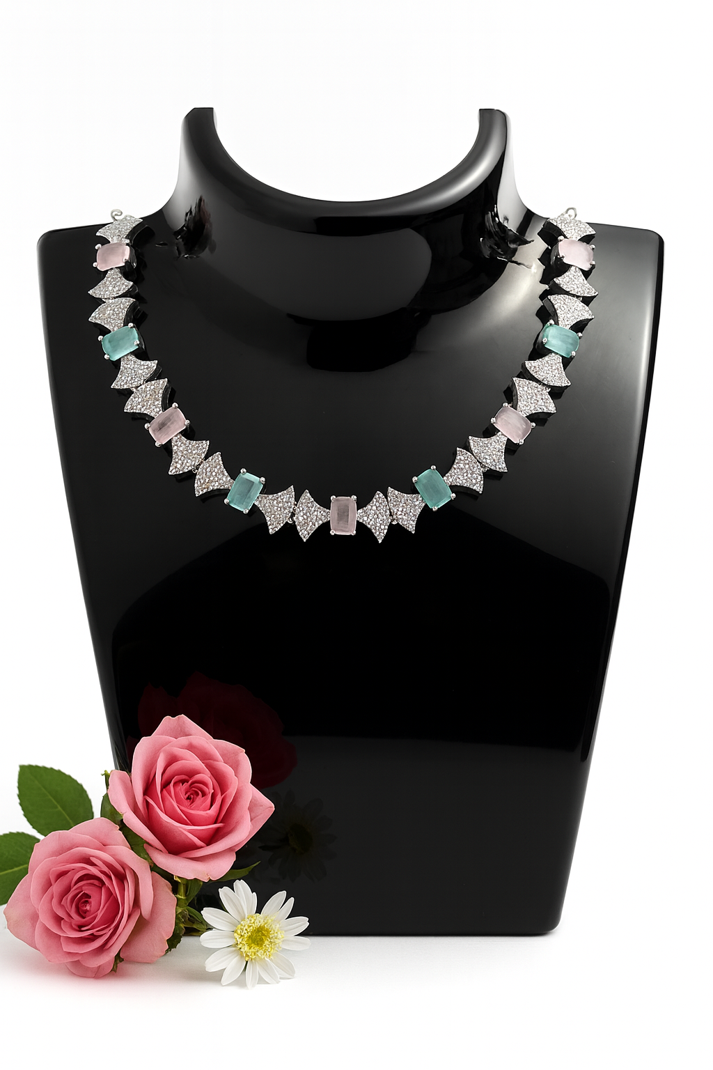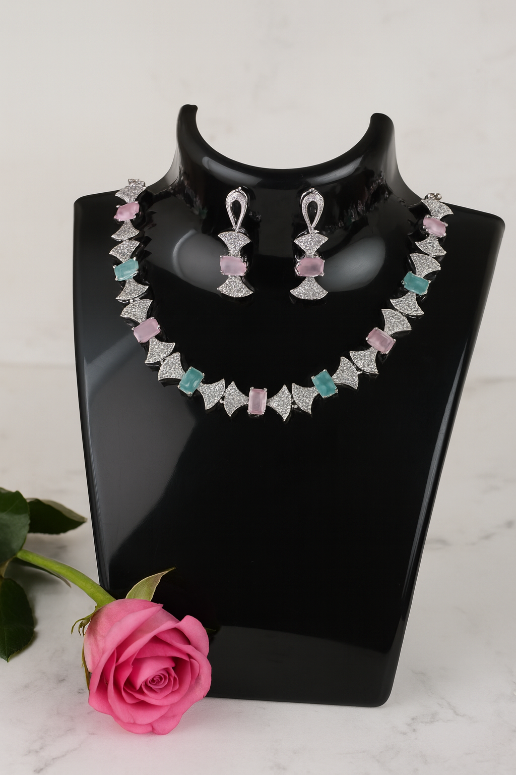 A luxurious jewelry set featuring a stunning necklace and matching earrings, adorned with alternating pastel pink and green gemstones. Each stone is beautifully framed with shimmering crystal-studded silver motifs, creating a dazzling yet graceful design. Perfect for weddings, evening soirées, or special occasions, this set embodies timeless elegance and refined sophistication.