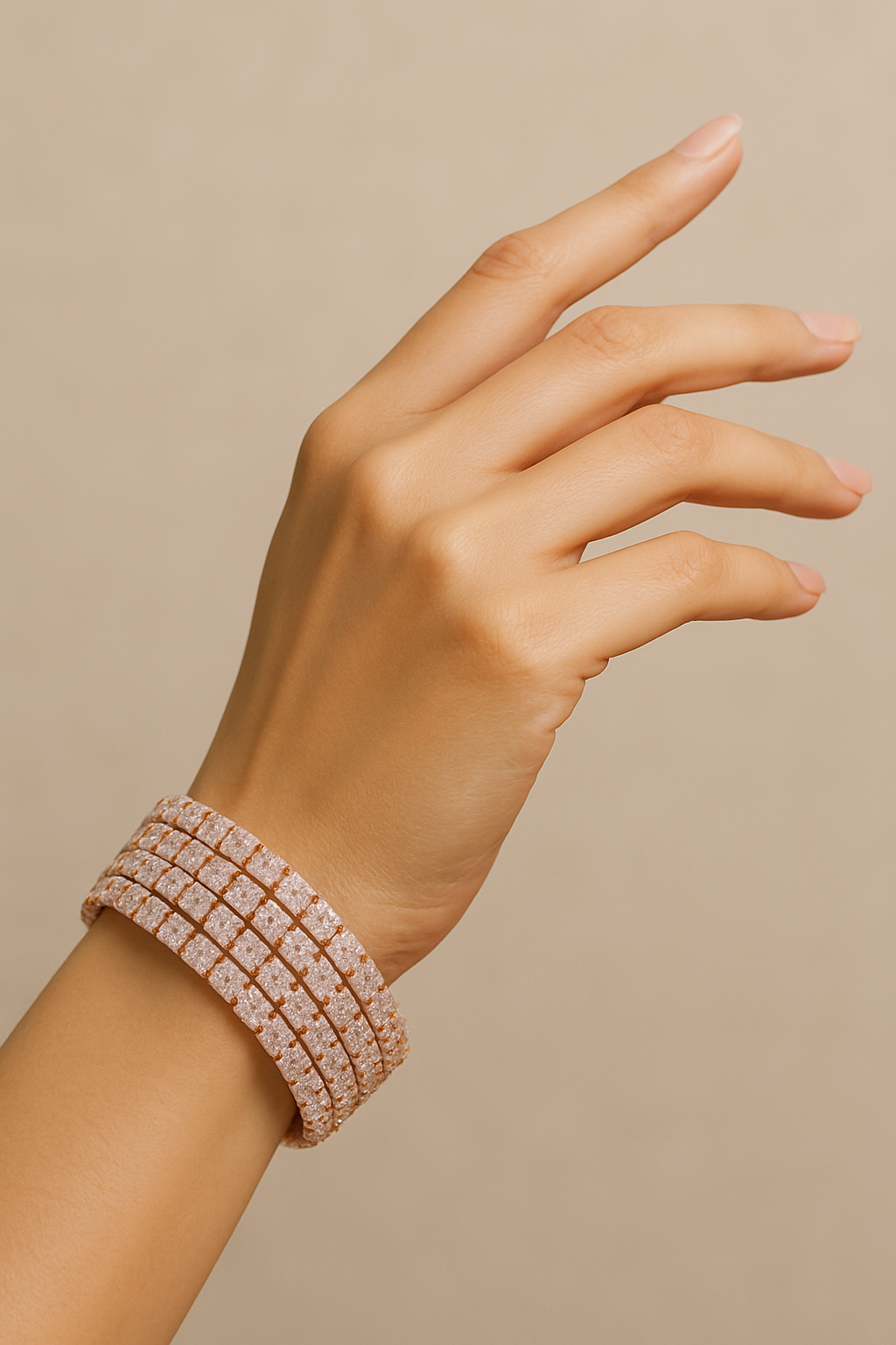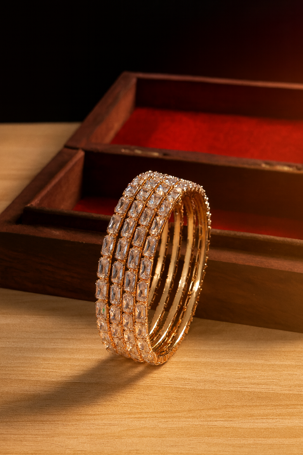 Add a touch of modern elegance to your look with this stunning set of four rose gold bangles. Each bangle is intricately crafted and embellished with sparkling zirconia stones, designed to catch the light from every angle. Perfect for both everyday sophistication and special occasions, these versatile bangles pair beautifully with both Western and traditional outfits.