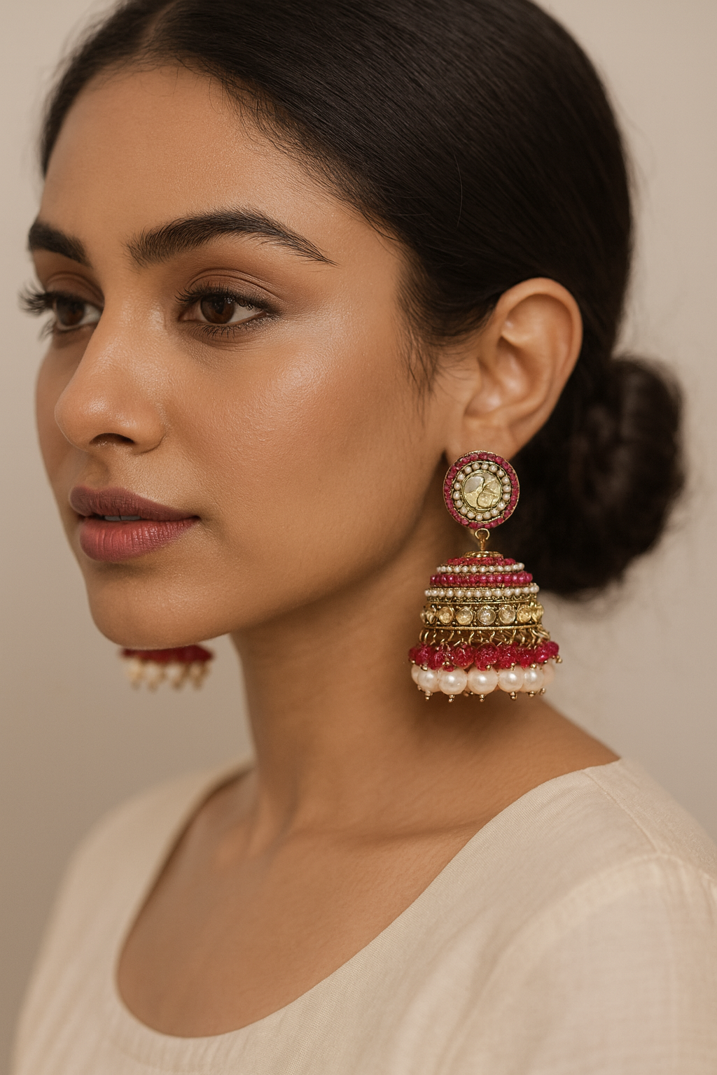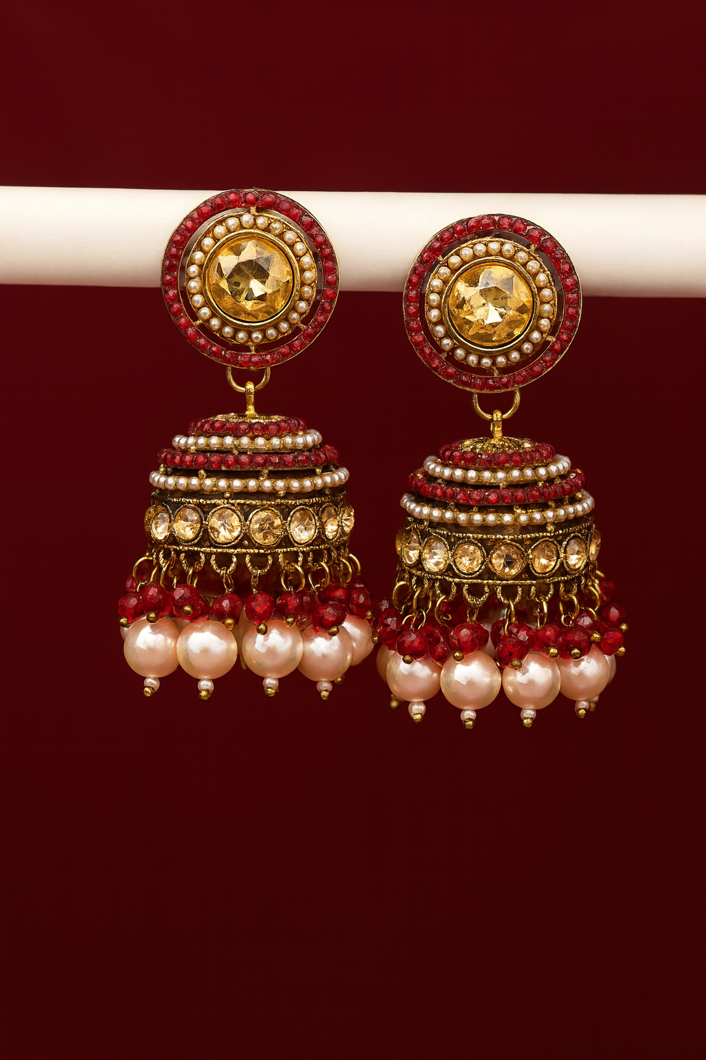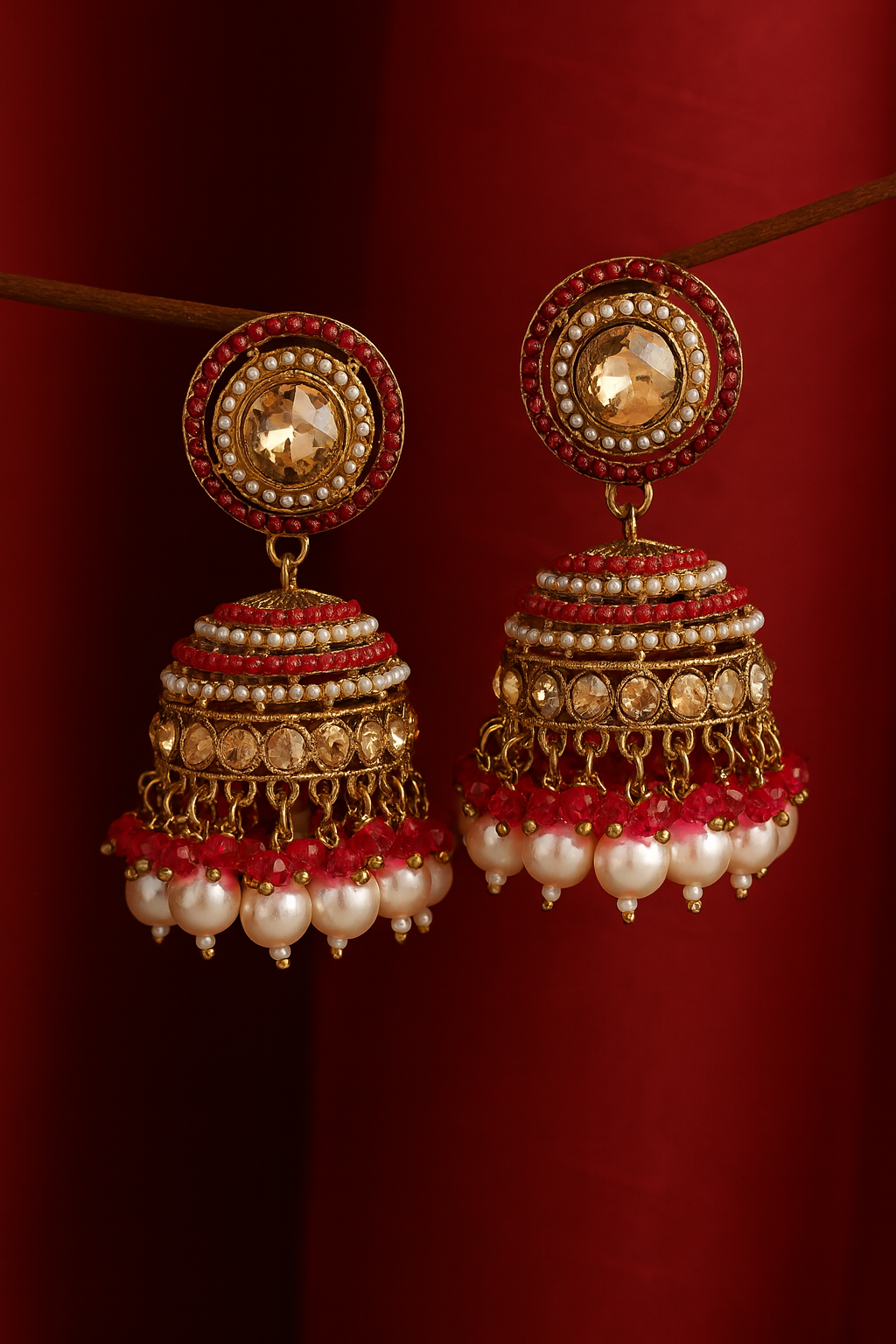 A stunning pair of handcrafted jhumka earrings, designed with intricate detailing in gold, red, and pearl accents. The earrings feature a circular stud embellished with a central stone, followed by layered domes adorned with sparkling stones, red beads, and dangling pearl drops. Perfect for weddings, festive occasions, and traditional attire, these earrings combine timeless charm with a regal touch.