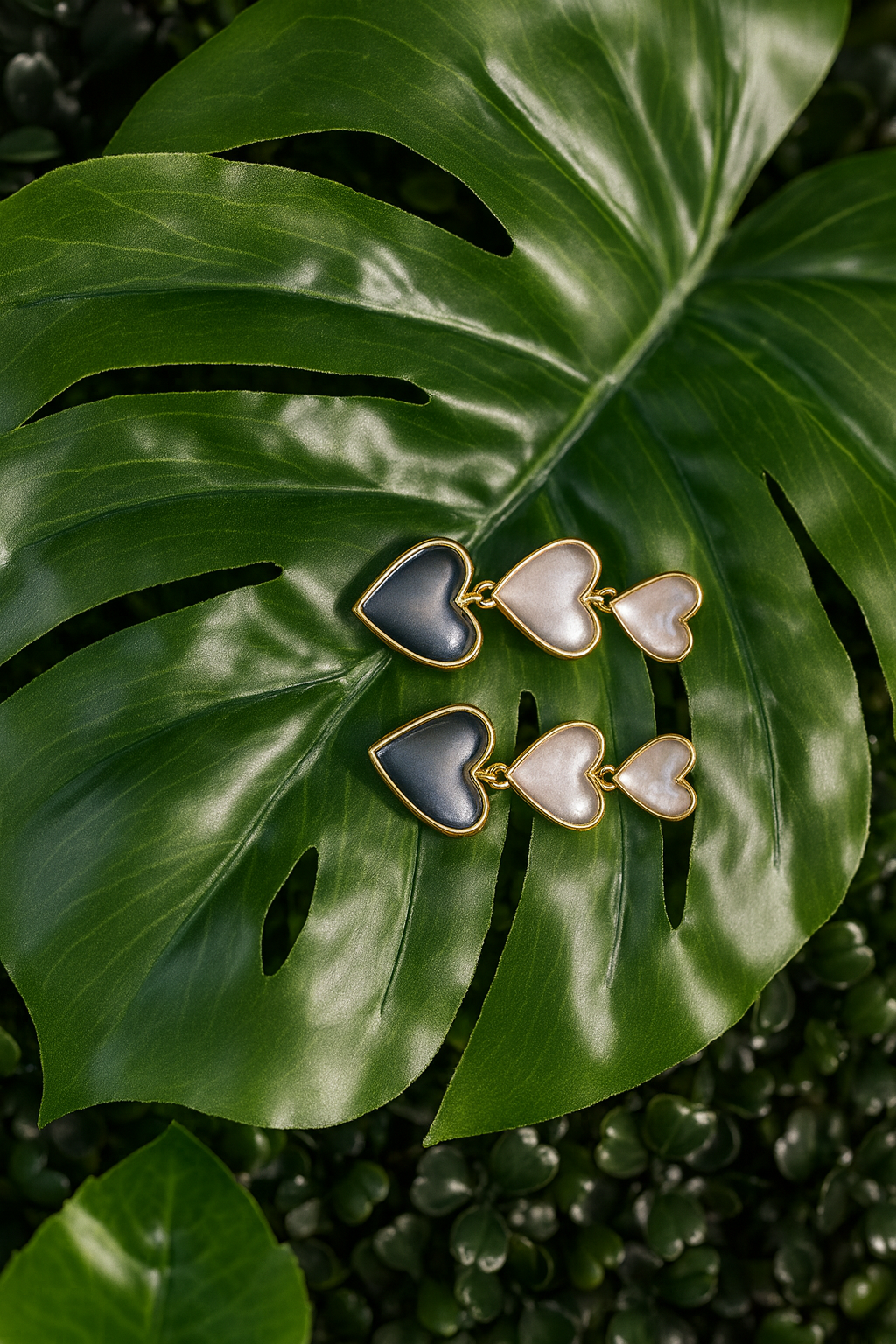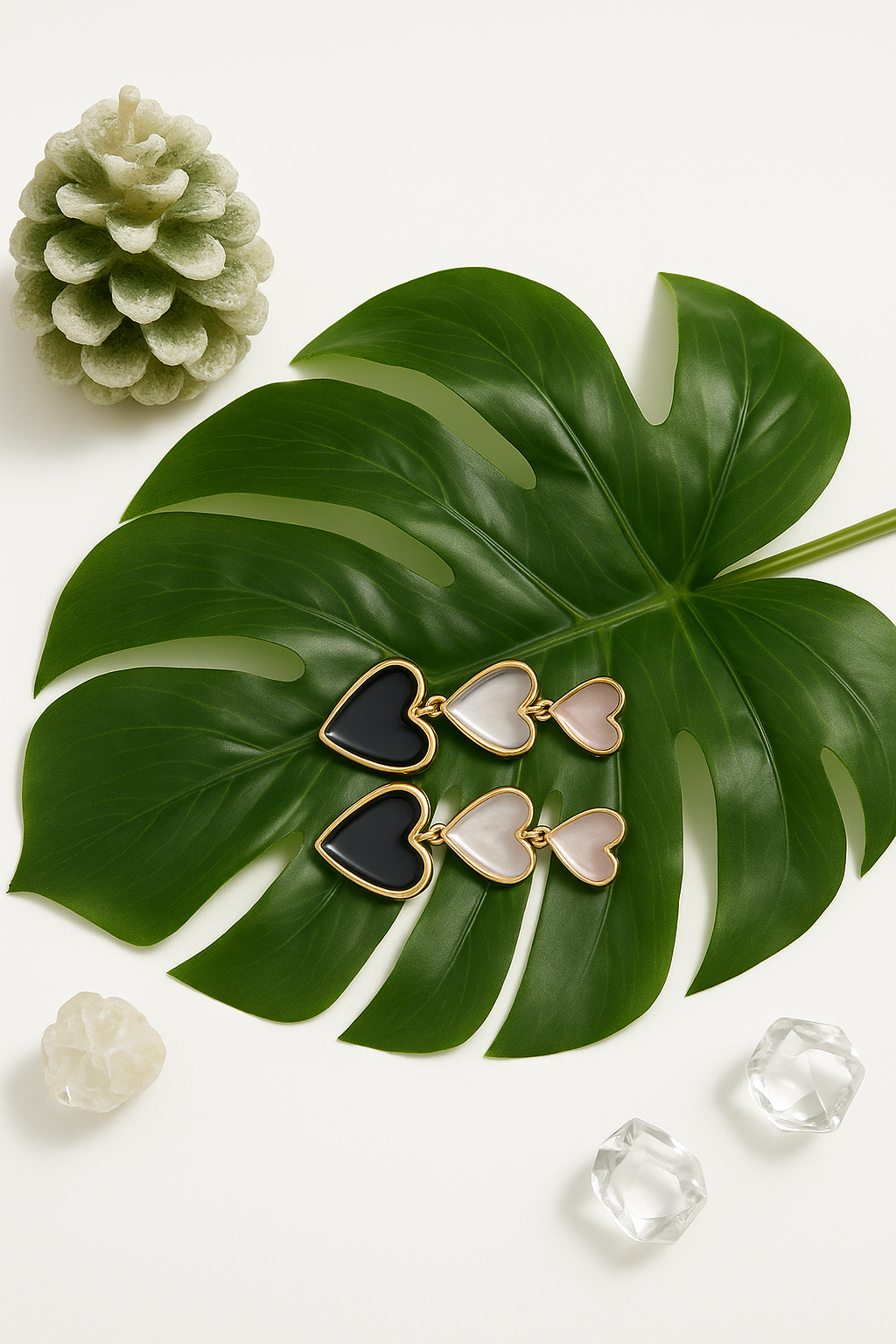 Add a touch of romance and sophistication with our triple heart dangle earrings. Featuring black, pearl, and blush-toned enamel hearts framed in gold, these earrings are the perfect blend of modern chic and timeless elegance. Lightweight yet striking, they effortlessly complement both casual and festive looks. Ideal for gifting or adding a stylish statement to your own collection.
