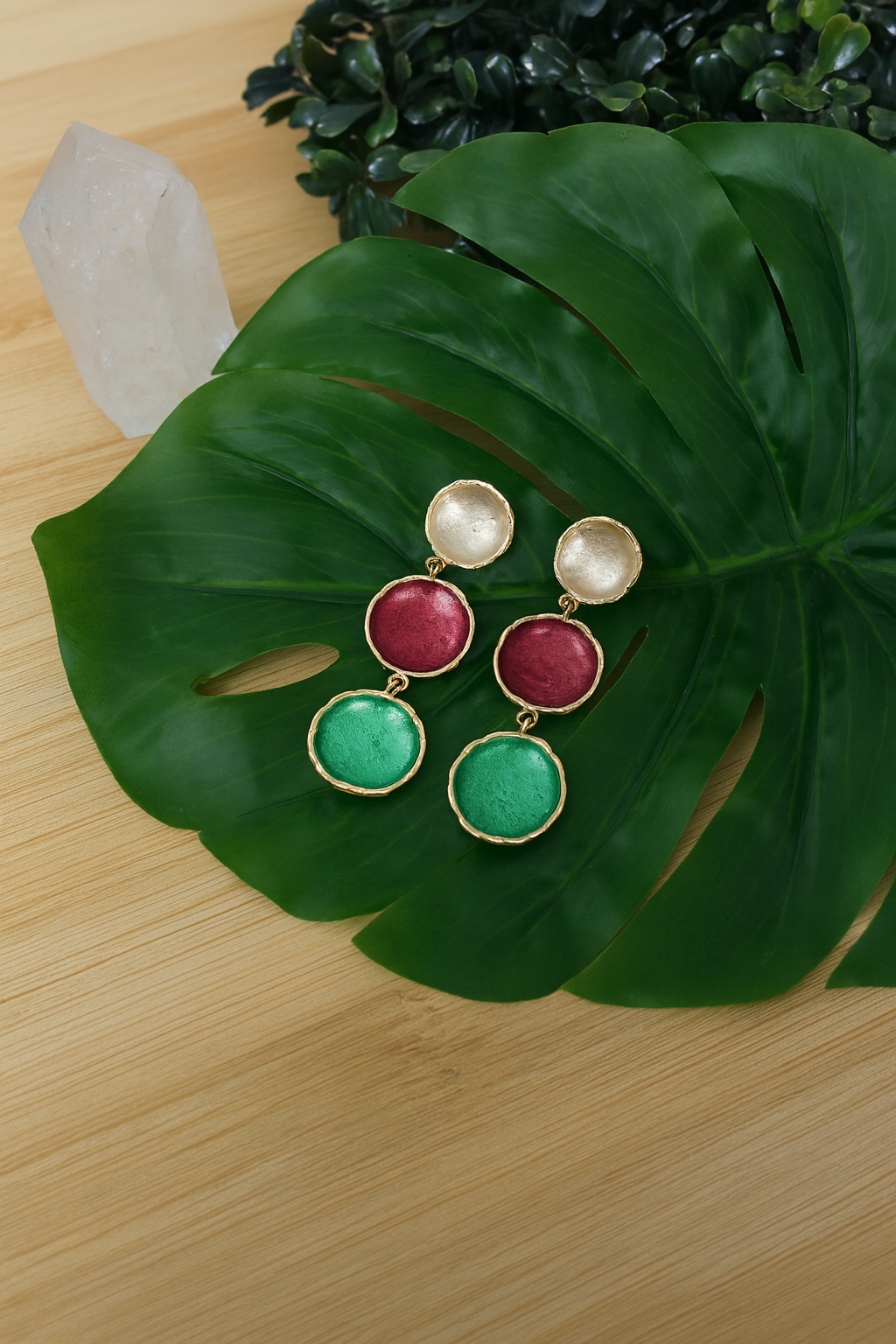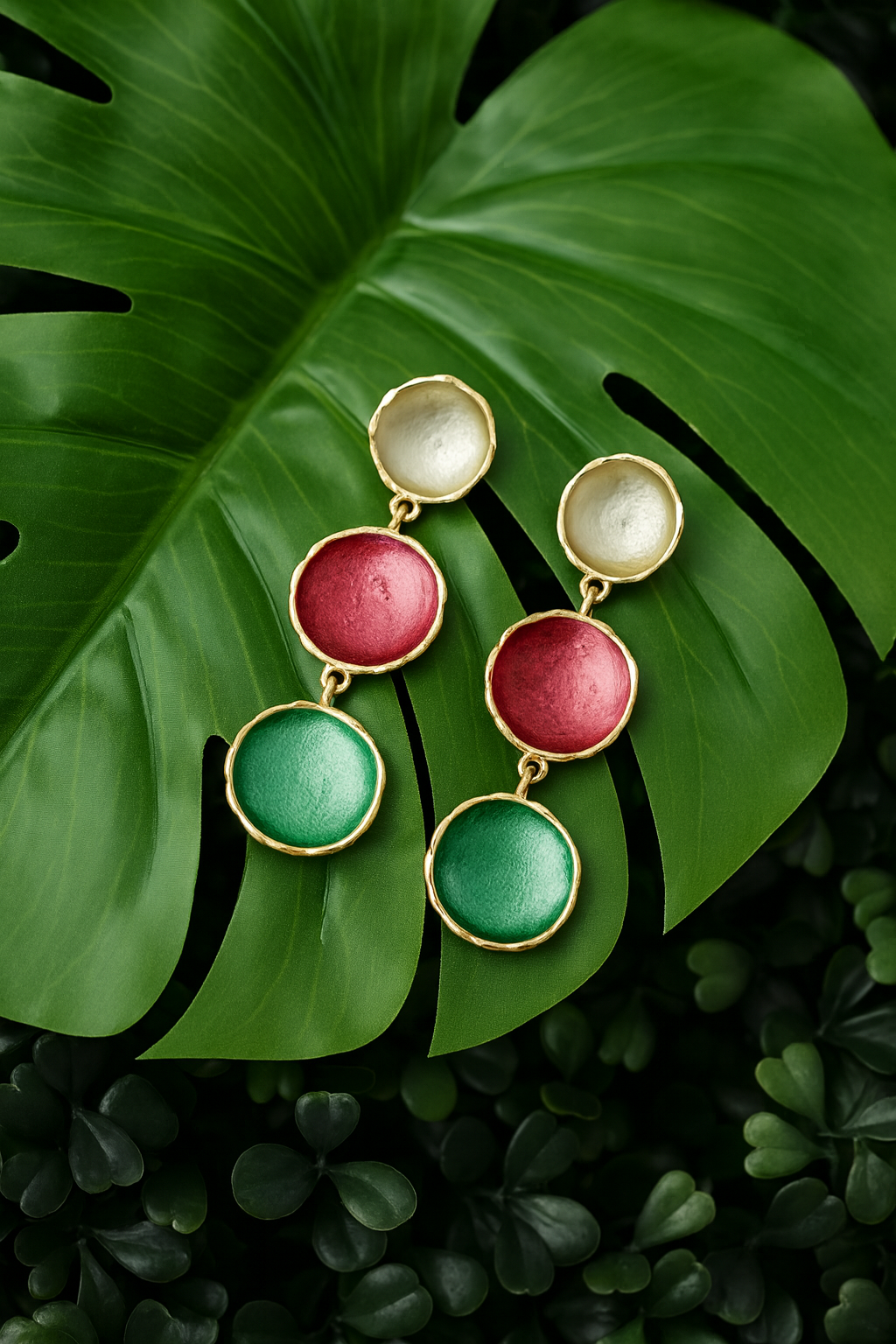 A bold yet graceful pair of handcrafted earrings featuring a unique triple-tone design in pearl white, deep burgundy, and rich emerald. Set in a textured gold-plated frame, these earrings bring a touch of sophistication and vibrance to any look — perfect for festive occasions, evening wear, or adding a pop of color to your everyday style.