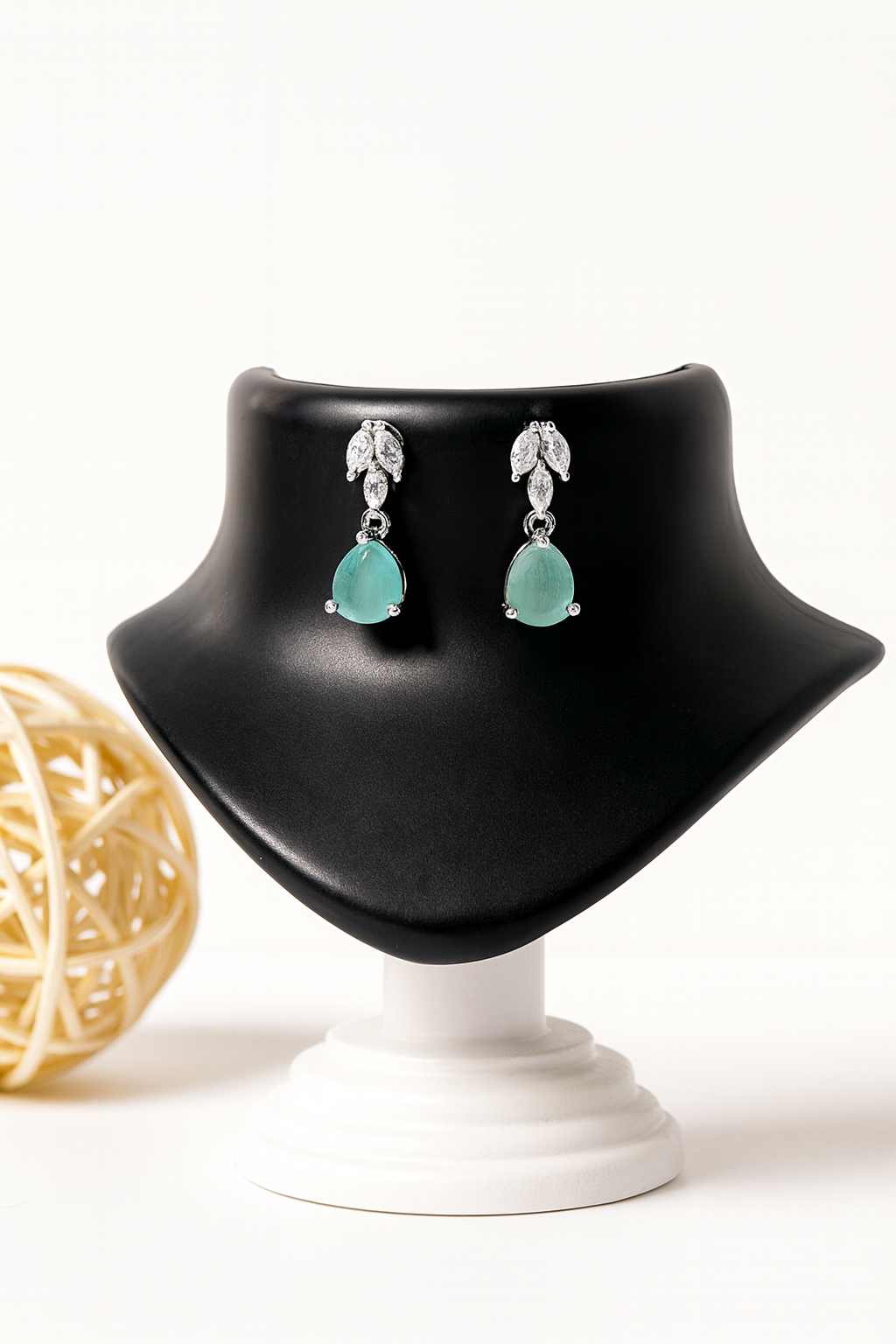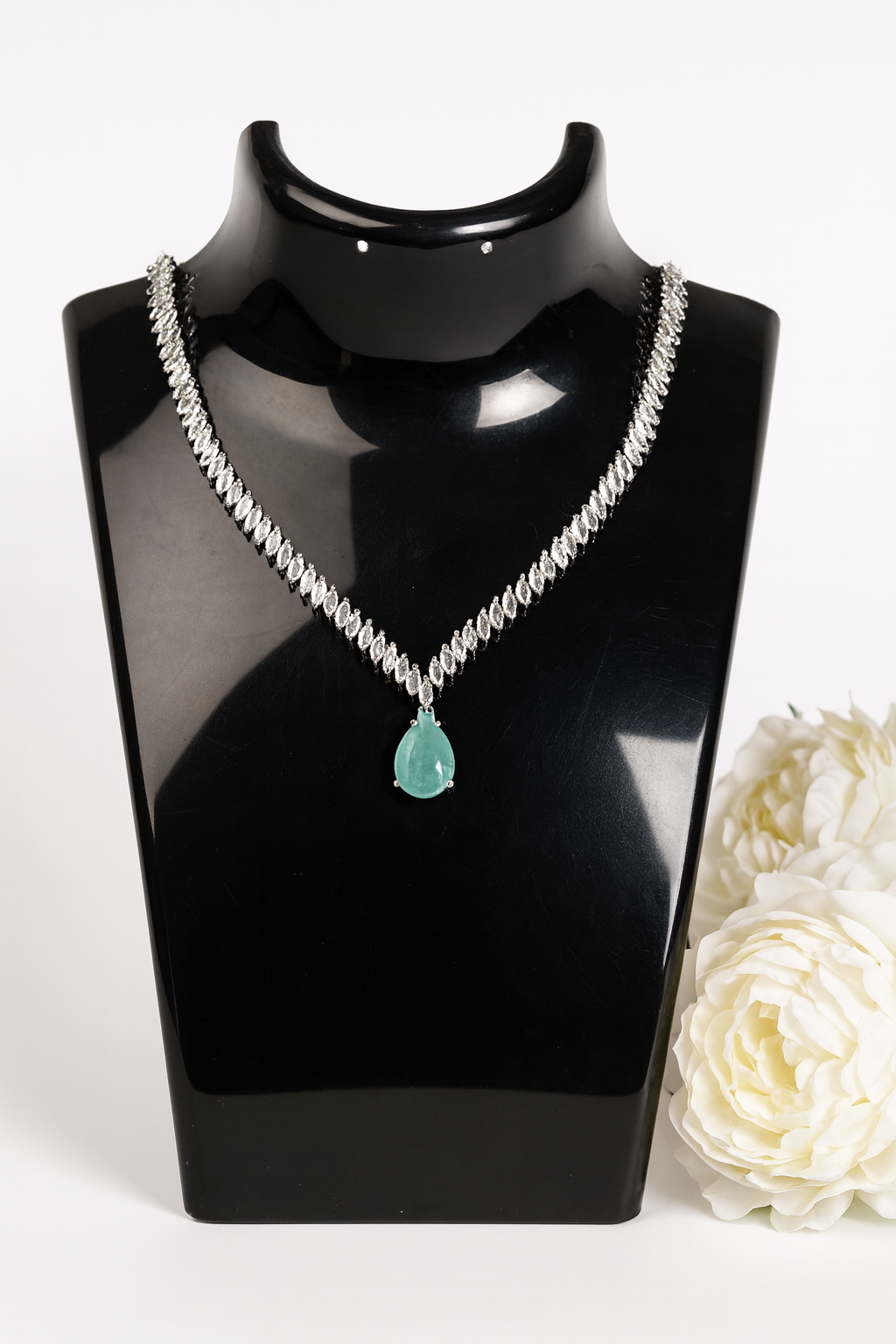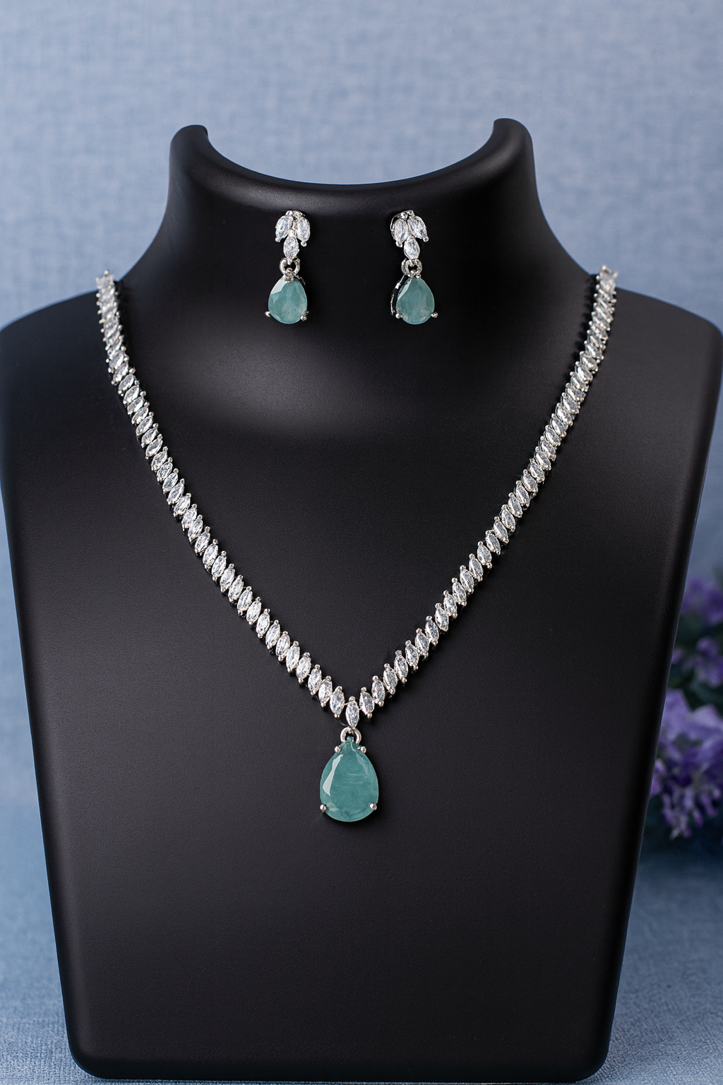 This exquisite jewelry set features a radiant turquoise teardrop gemstone centerpiece, beautifully complemented by sparkling diamond-cut stones along the necklace and matching earrings. The vibrant turquoise adds a refreshing pop of color, symbolizing protection and serenity, while the intricate design ensures timeless elegance. Perfect for weddings, festive occasions, or evening wear, this set is a luxurious statement piece for any collection.