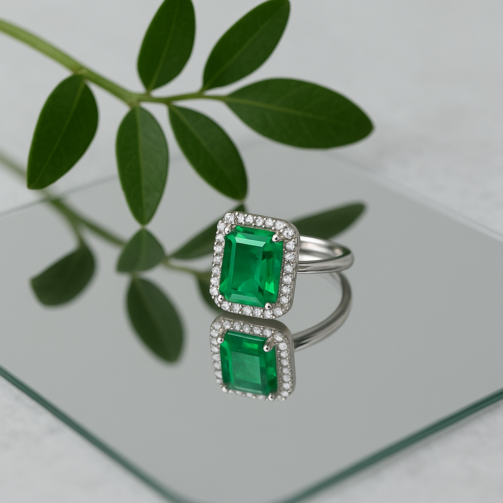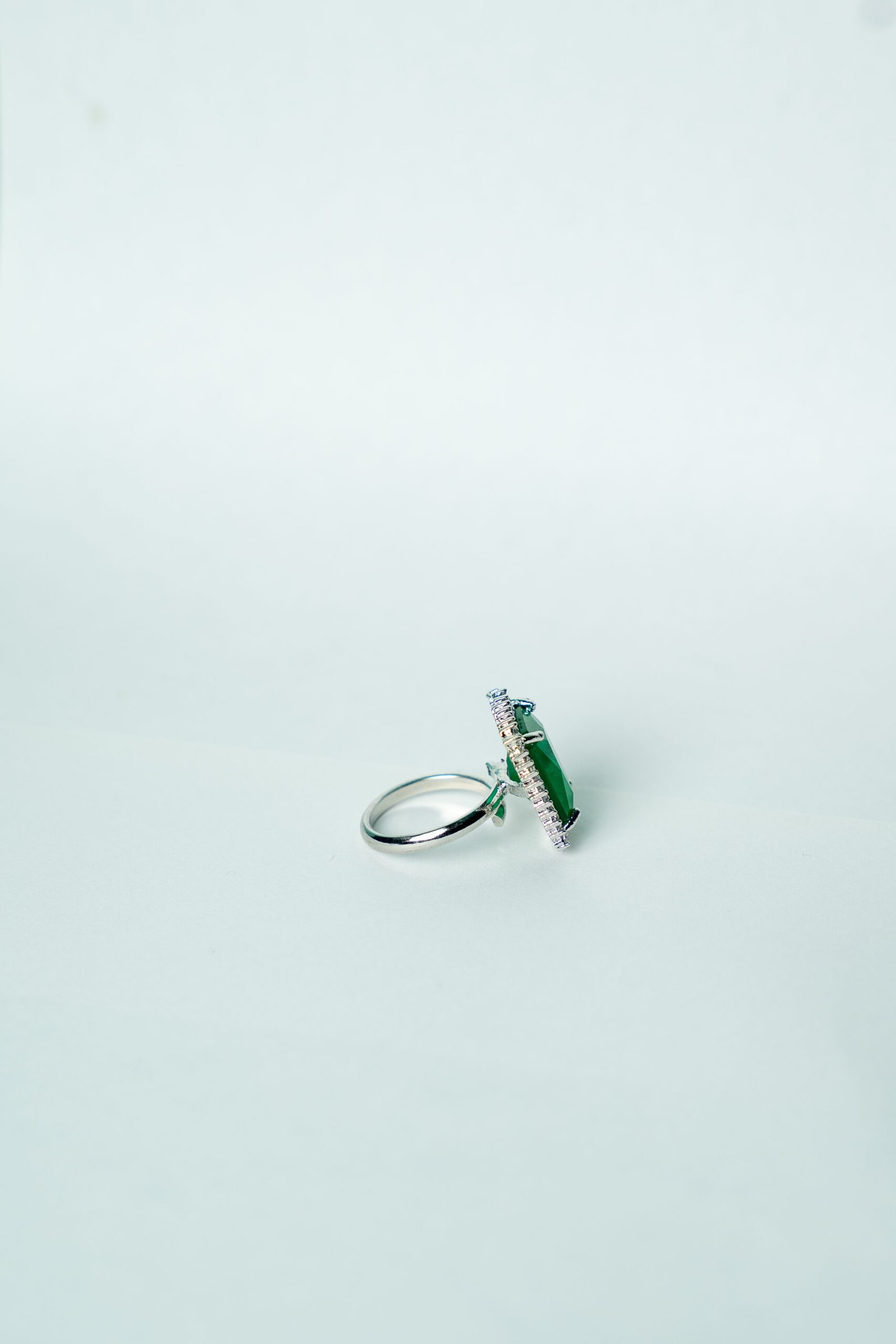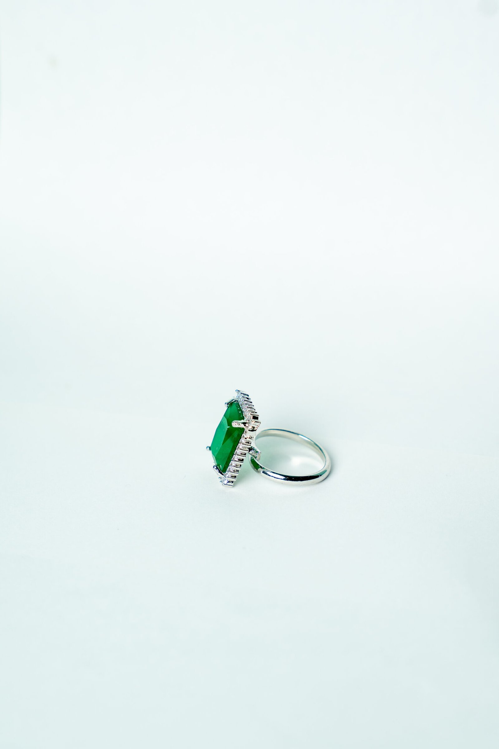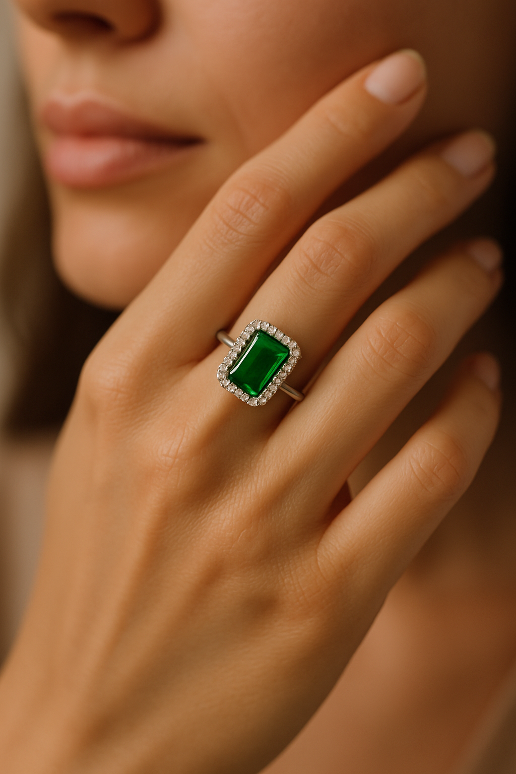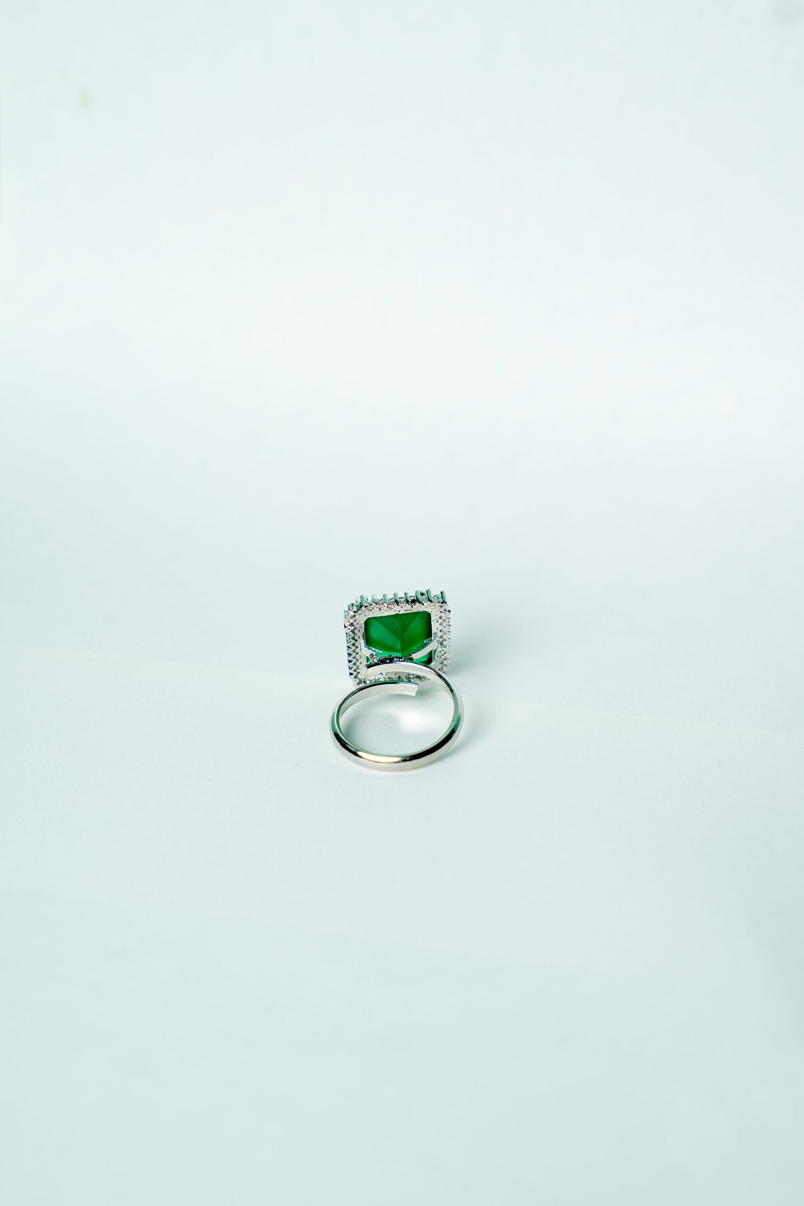 This sophisticated halo ring features a bold emerald-cut green gemstone as its centerpiece, framed by a delicate border of sparkling white crystals. The sleek silver-toned band enhances its modern elegance, while the rectangular cut lends a refined, contemporary appeal. Perfect for evening wear, cocktail parties, and formal occasions, this statement ring combines timeless beauty with a touch of luxury.
