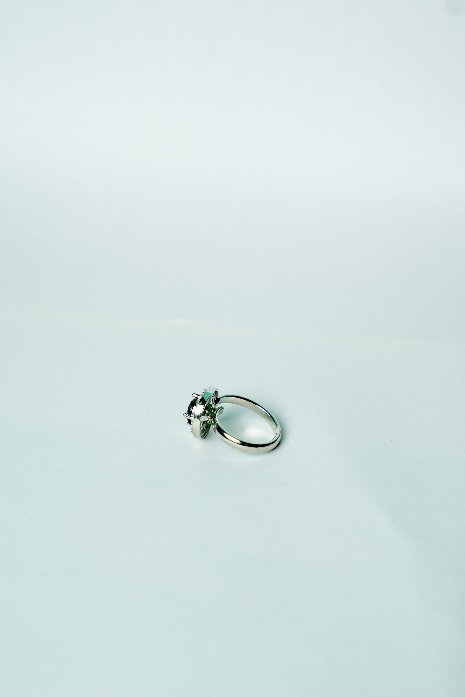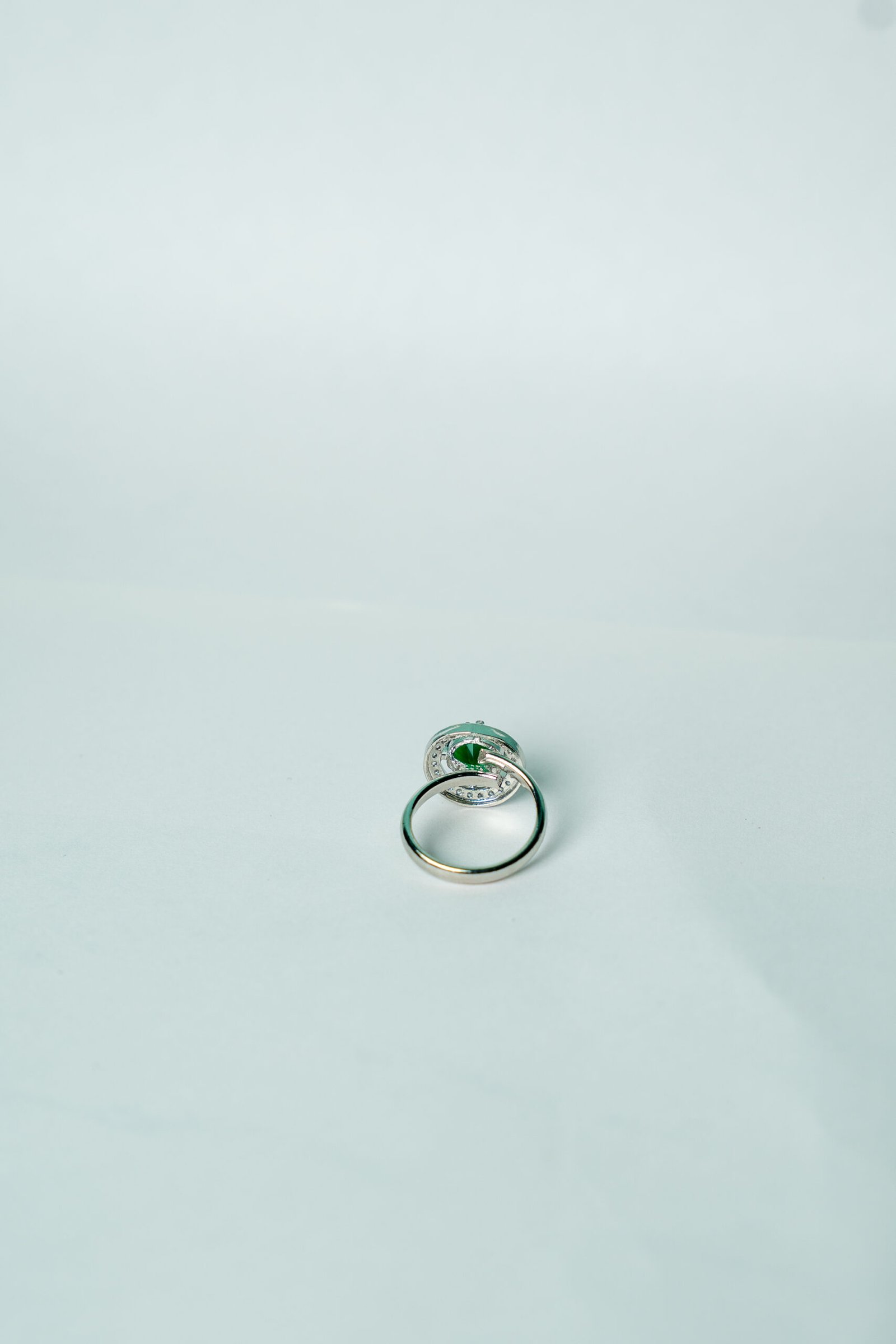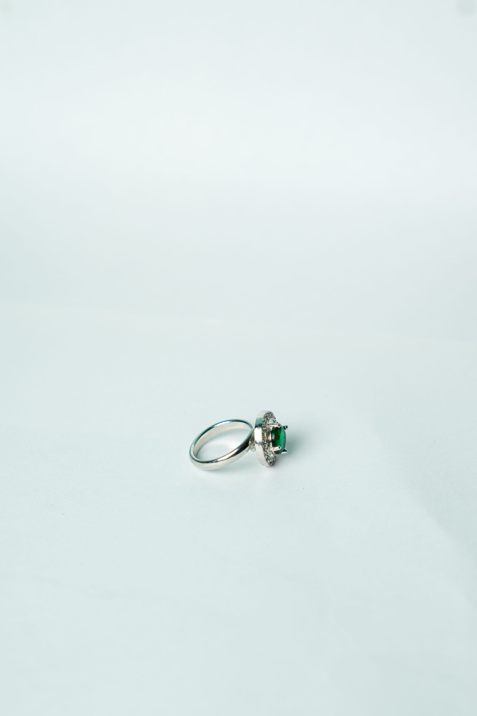 This elegant halo ring features a brilliant round-cut emerald green stone at its center, encircled by a delicate border of sparkling white crystals. Set in a sleek silver-toned band, the design combines timeless elegance with a touch of modern sophistication. Perfect for both everyday wear and special occasions, this versatile ring adds a refined pop of color to any look.