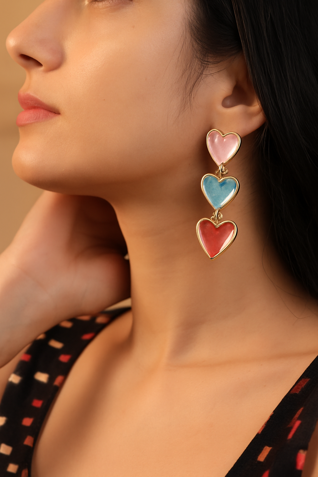 Add a playful pop of color to your look with these dreamy enamel heart cascade earrings. Featuring a trio of hearts in soft pink and sky blue shades outlined in gold, these earrings are the perfect mix of chic and fun. Lightweight yet statement-making, they’re perfect for casual days, brunch dates, or a night out.