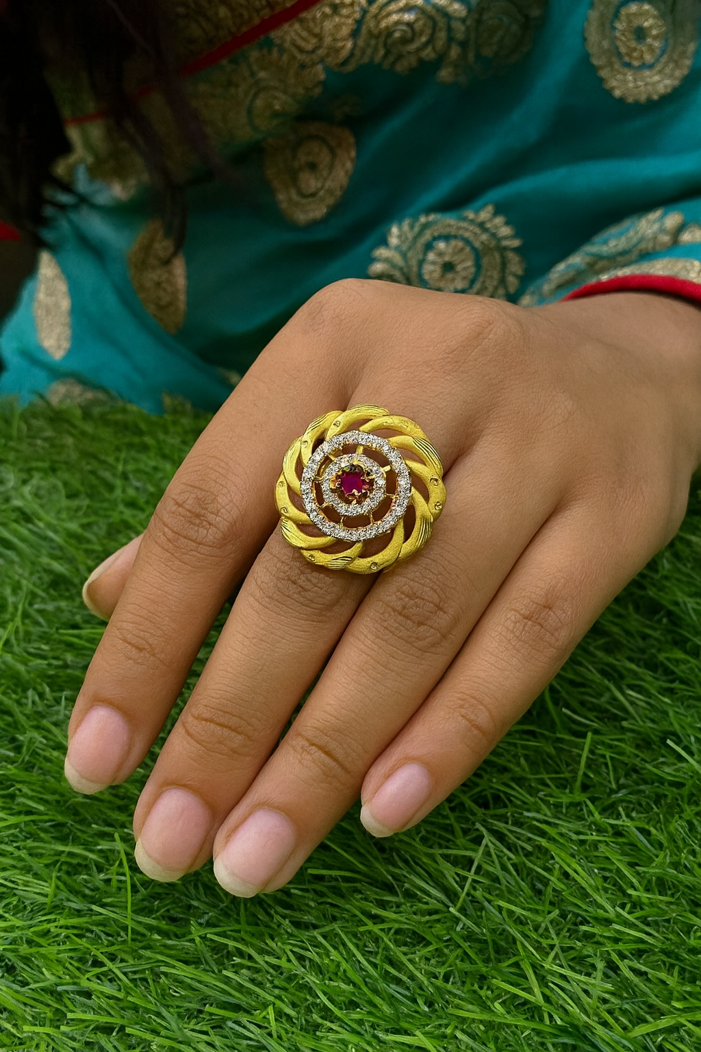 A statement ring crafted in radiant gold, featuring a floral-inspired design. At its heart lies a striking ruby, beautifully surrounded by sparkling diamonds, making it a perfect blend of tradition and elegance. Ideal for weddings, festive occasions, or adding a regal touch to any outfit.