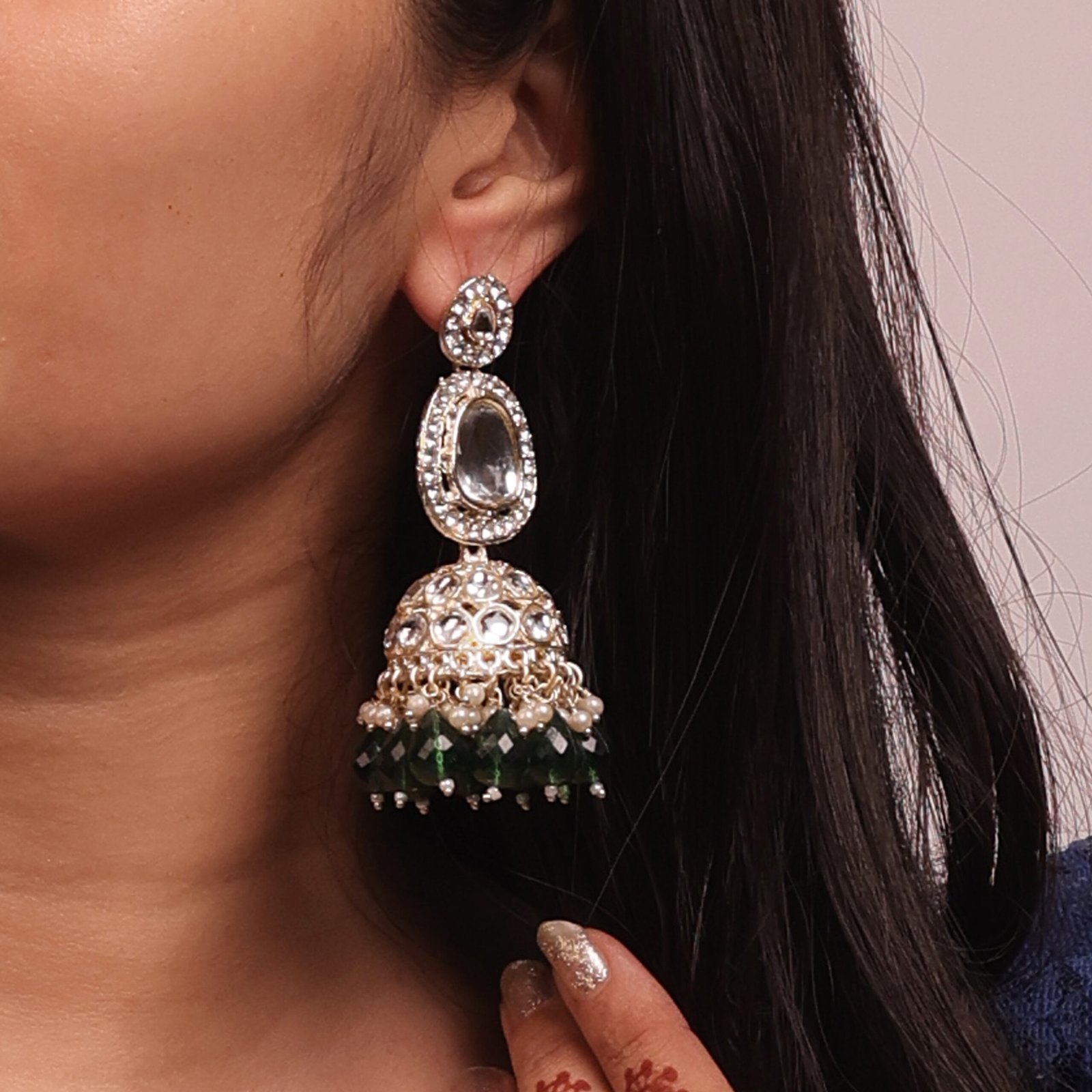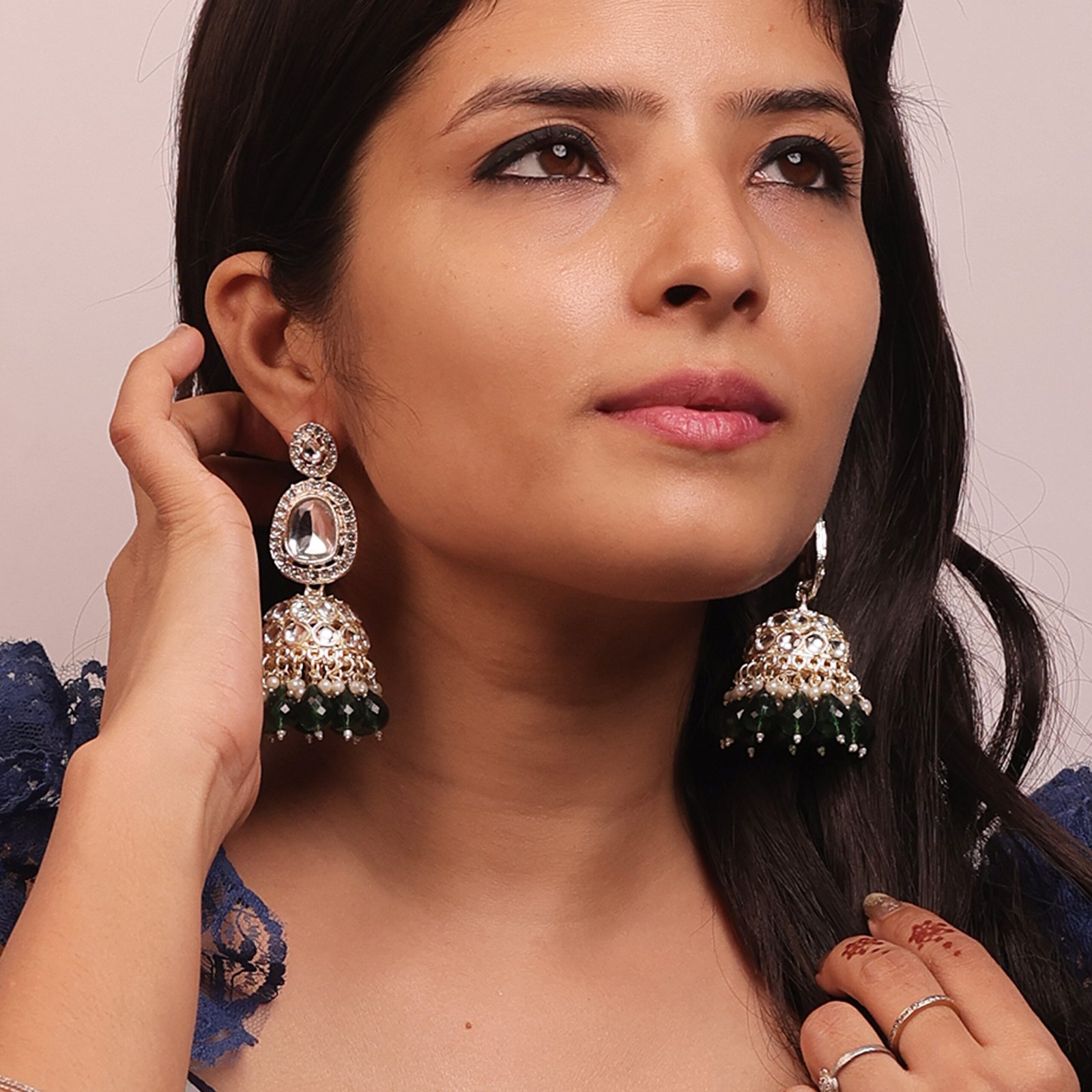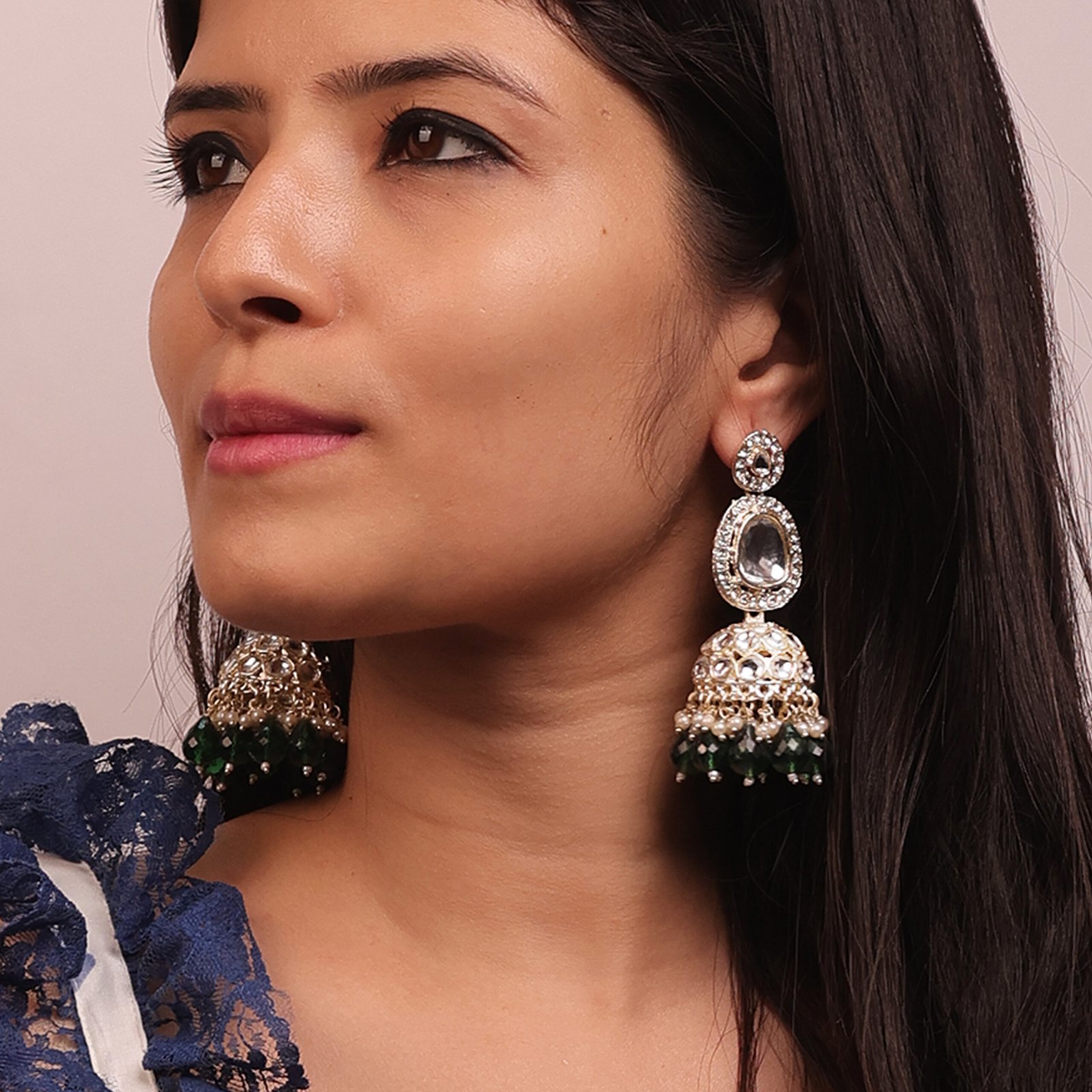 Gold Plated Green Stone Studded Kundan Jhumki Earrings for Women