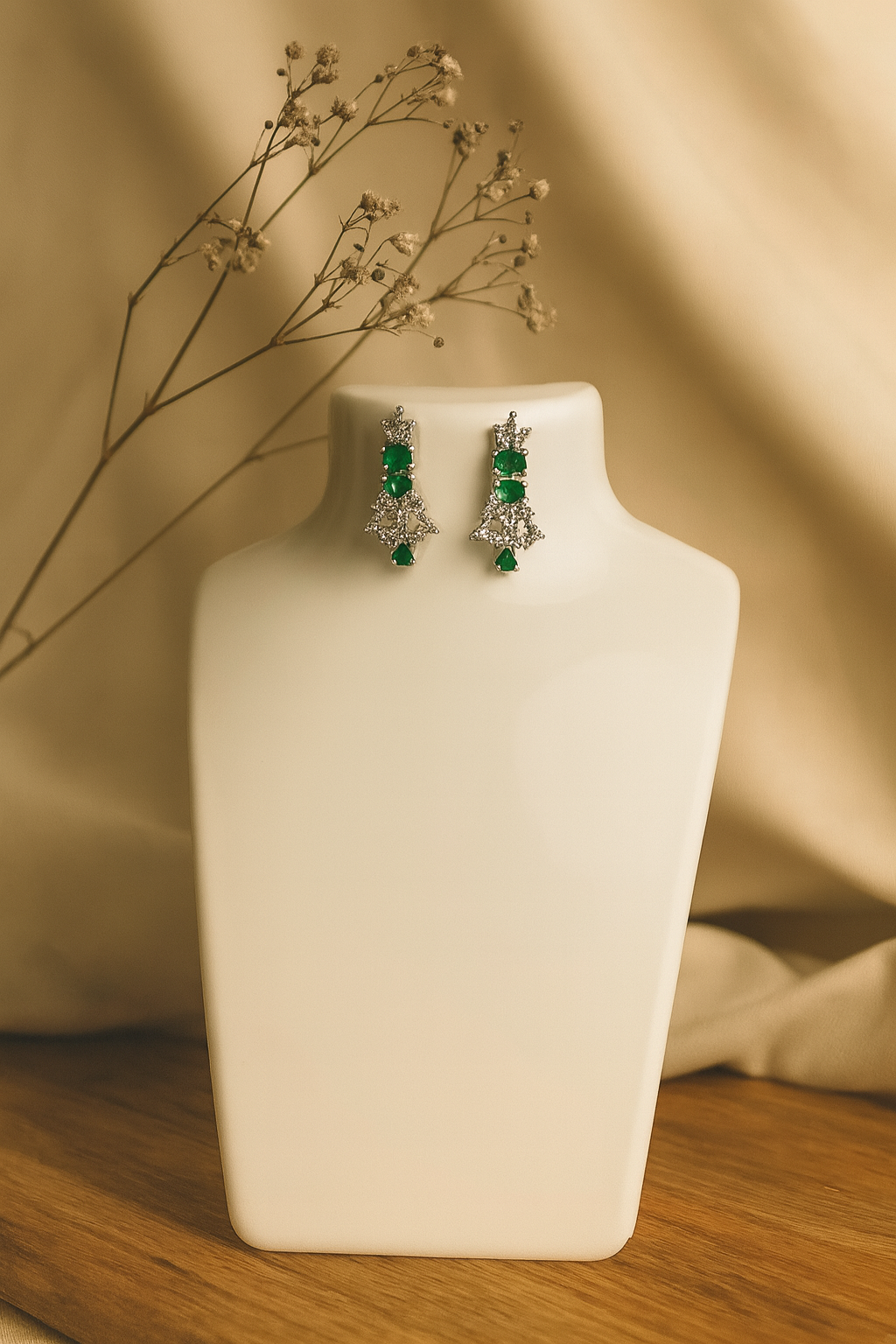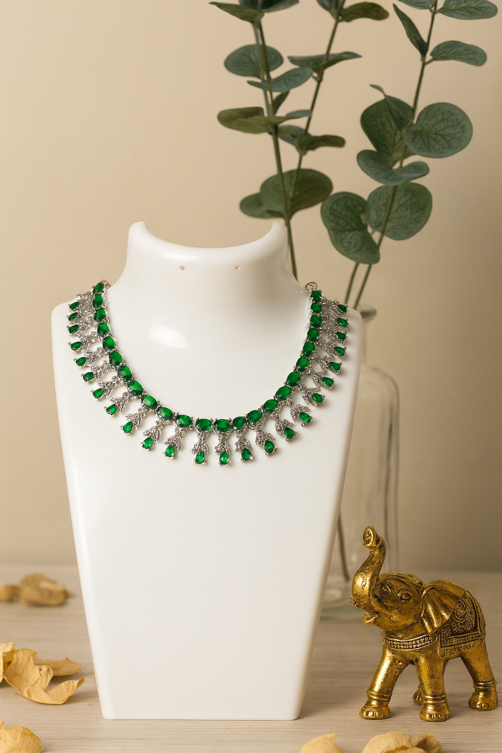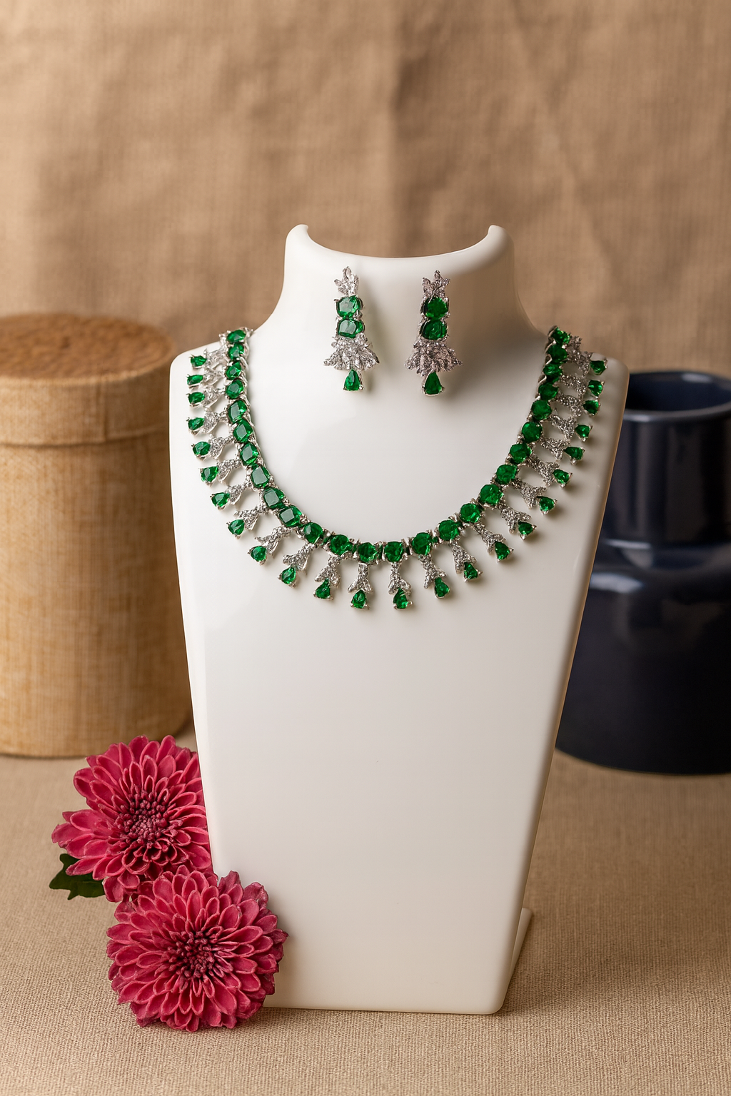 A timeless masterpiece featuring radiant green emeralds paired with sparkling diamond accents, set in a sleek silver finish. This exquisite necklace comes with matching earrings, making it the perfect choice for weddings, festive occasions, or evening soirées. Designed to add a regal charm to your look, this set beautifully blends luxury with elegance.
