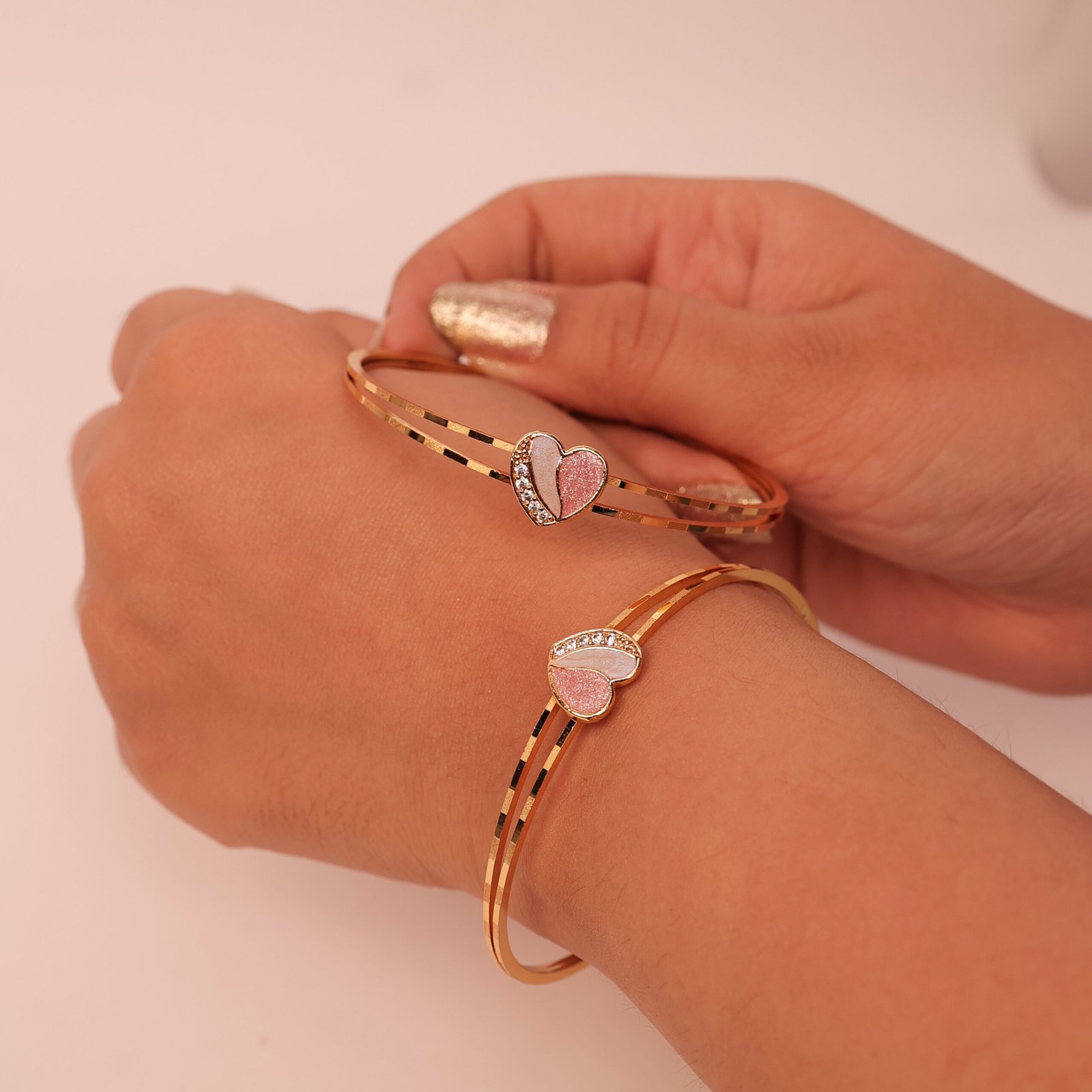 Heart Design Gold Plated Bracelet with Pink Crystal and Rhinestones for Women, Double Band Style