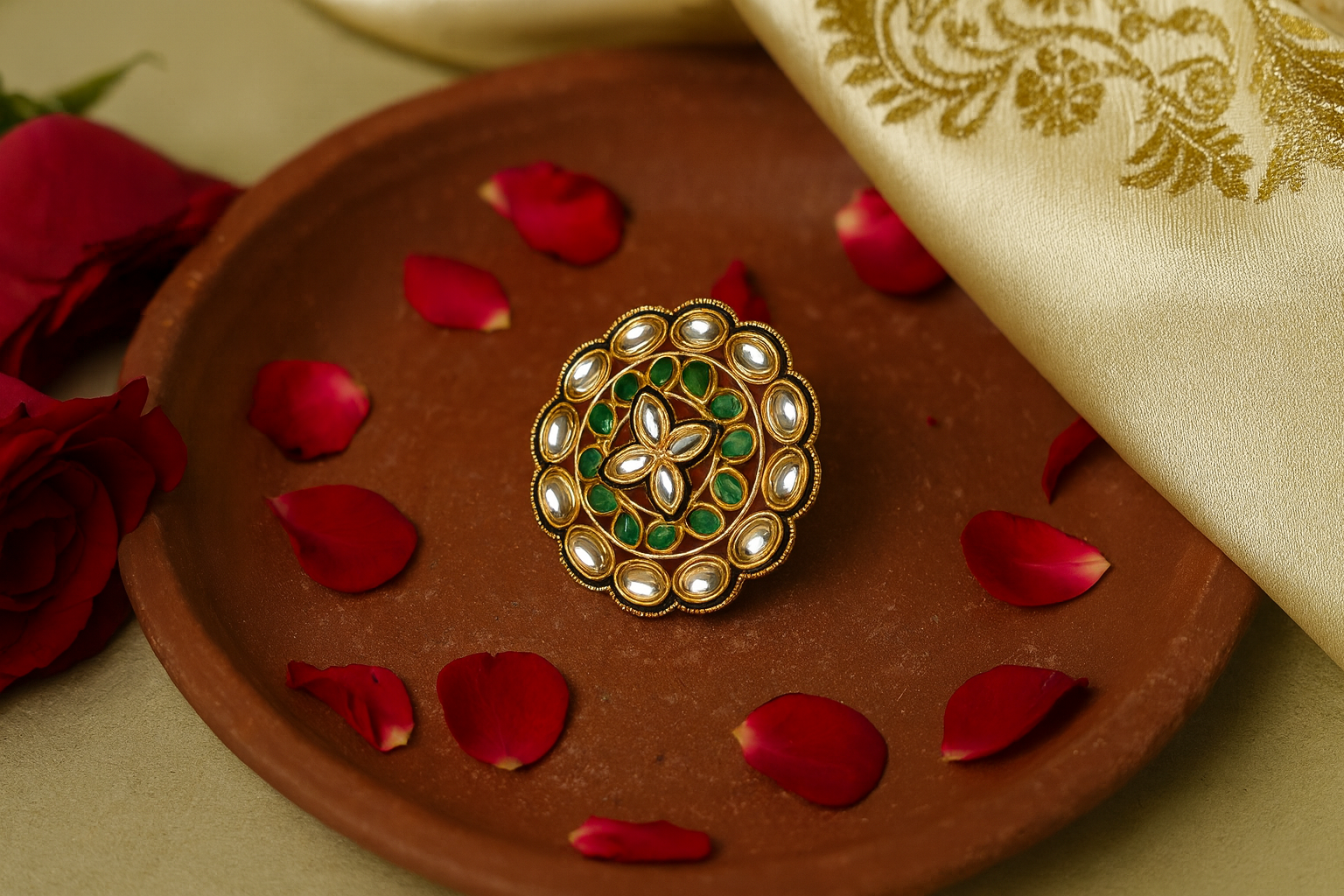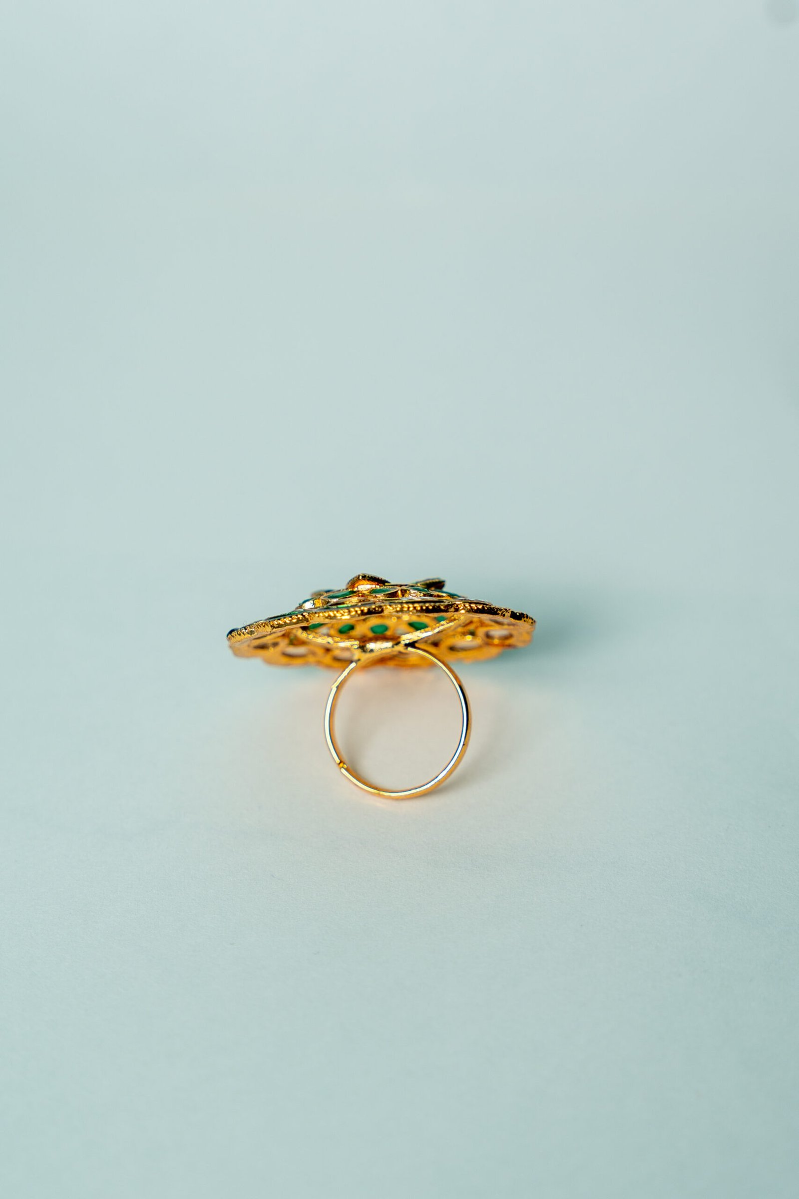 This ornate round Kundan ring features a floral centerpiece crafted with shimmering white stones and surrounded by vivid green teardrop gems. The outer scalloped border of reflective white Kundan stones adds a regal touch, while the intricate golden framework enhances its traditional charm. A perfect statement accessory for weddings, festive occasions, and cultural celebrations, this ring beautifully captures the essence of royal heritage.