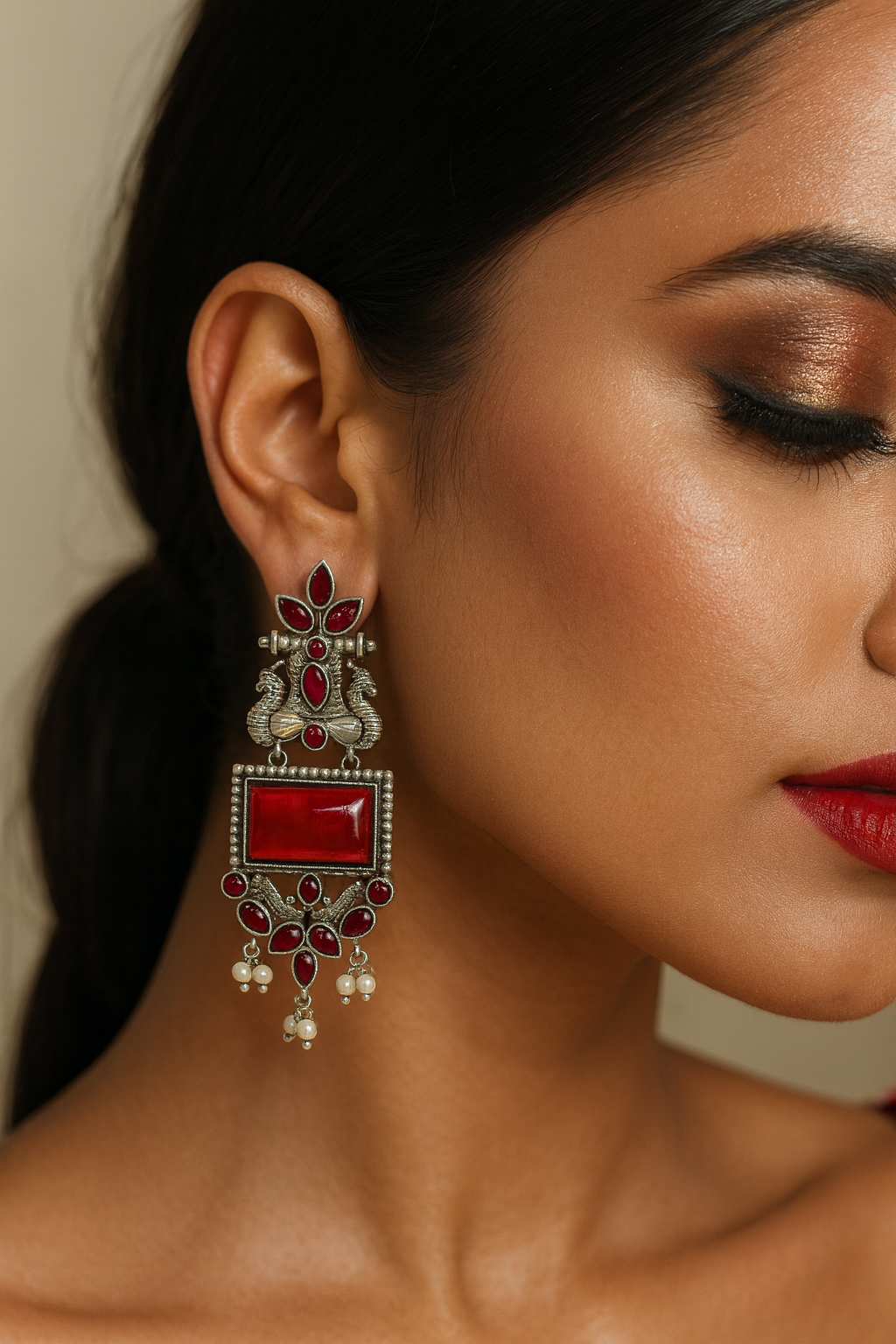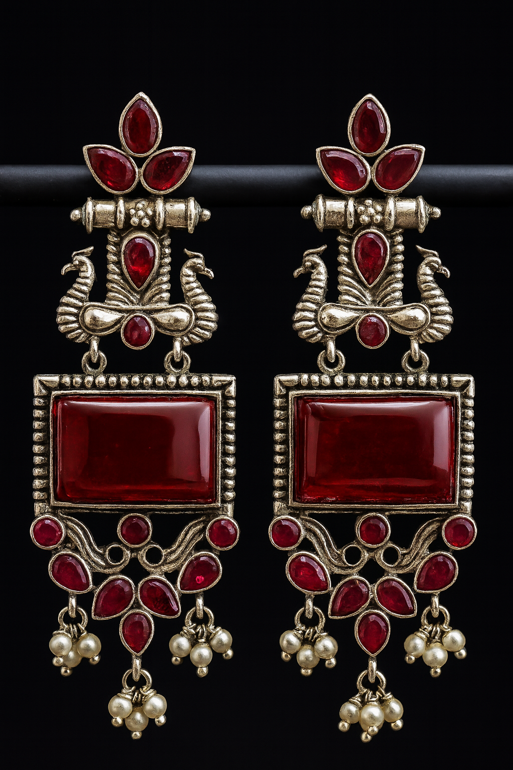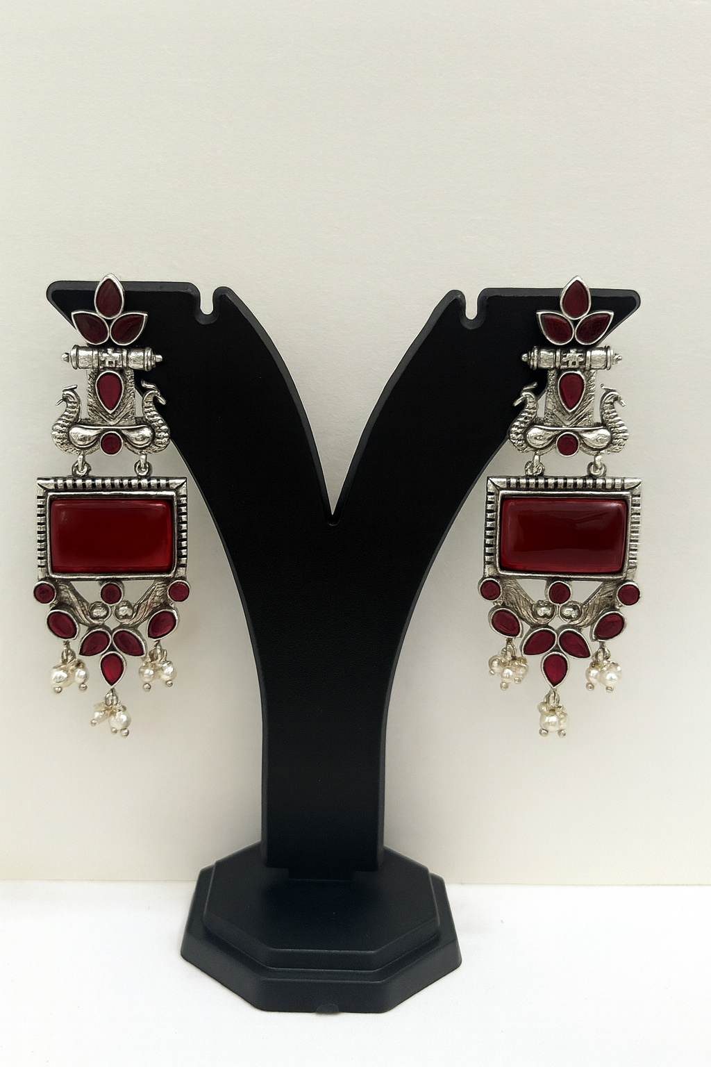 Look Alike Dangler Earrings! Crafted with silver oxidized metal, they feature a traditional and ethnic look with a hint of colour from stunning colored stones and precious pearl work. Shine like a queen at any occasion!