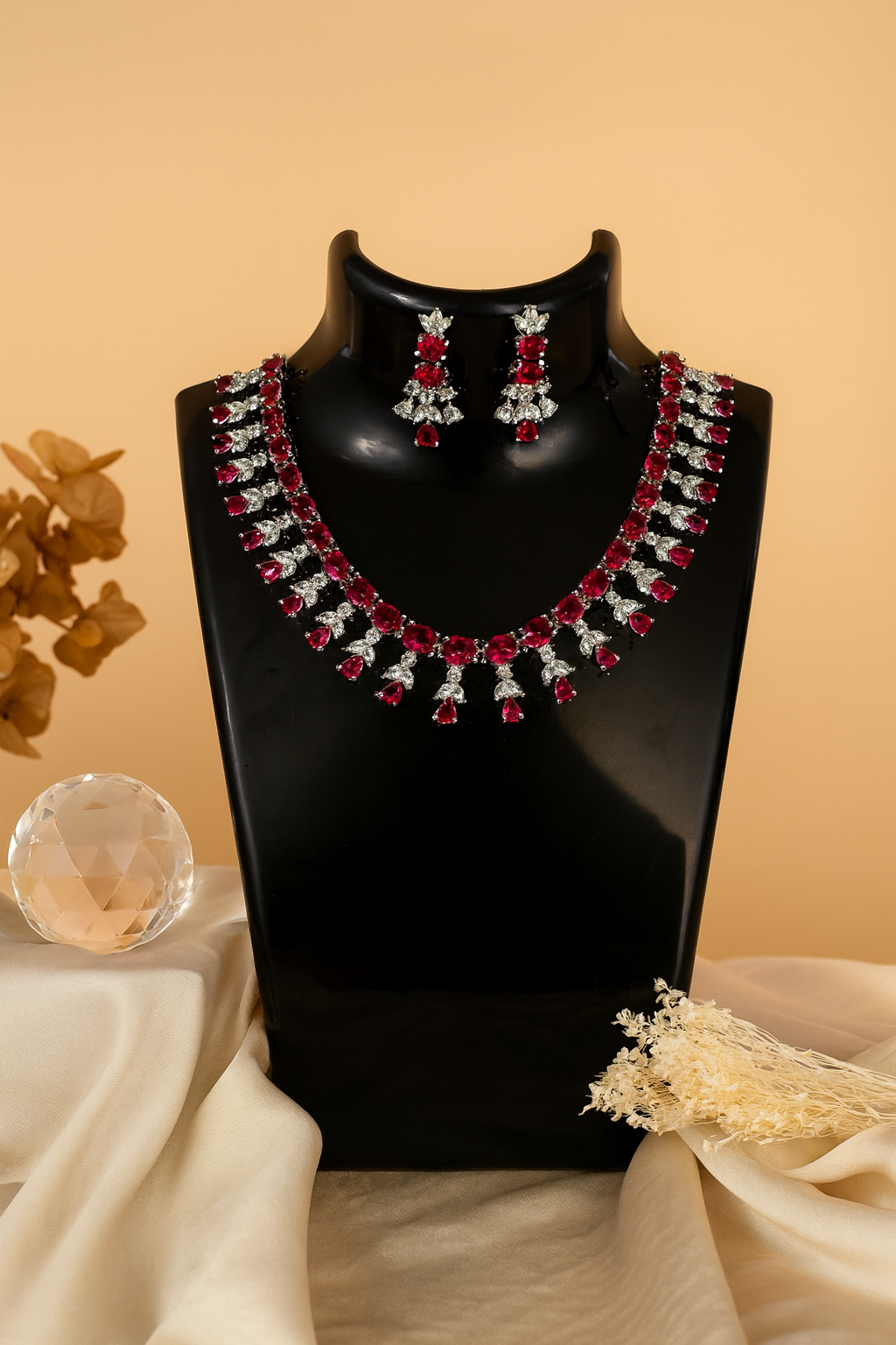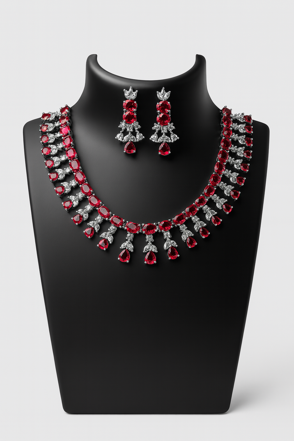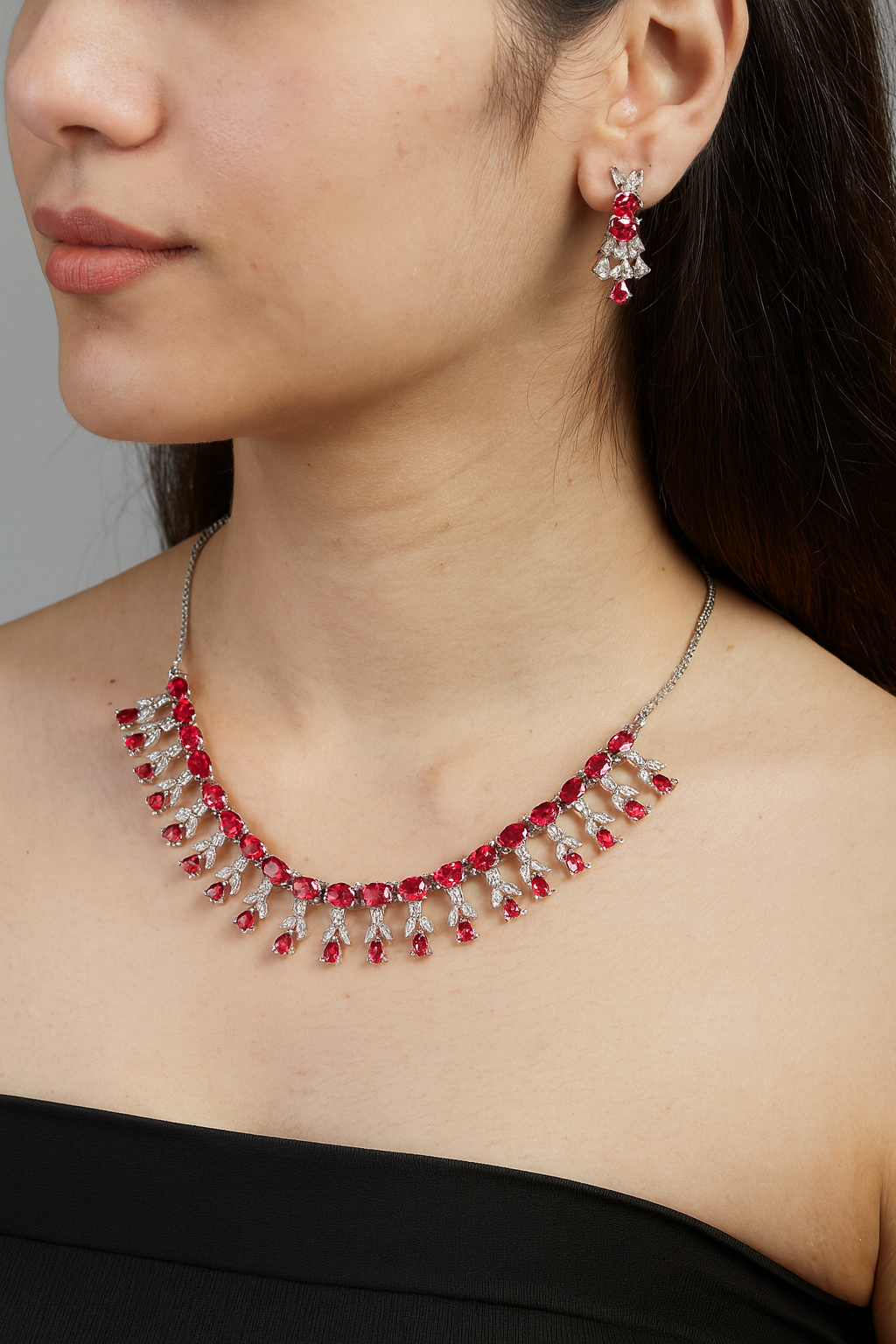 Elevate your elegance with this exquisite jewelry set featuring a stunning choker-style necklace adorned with radiant ruby-red gemstones and sparkling diamond-like stones. The intricate craftsmanship highlights oval and teardrop-shaped rubies framed with shimmering accents, creating a timeless statement piece. Paired with matching chandelier earrings, this set is perfect for weddings, parties, and grand occasions, adding sophistication and glamour to any outfit.