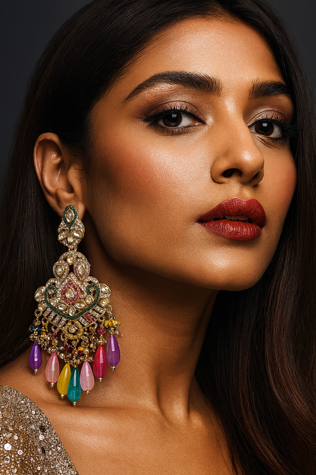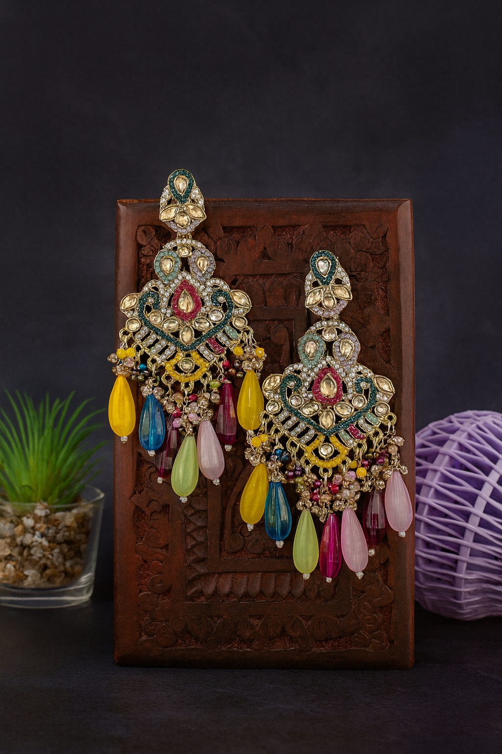 Add a vibrant touch to your festive and wedding look with these exquisite multicolor chandbali earrings. Handcrafted with dazzling kundan work, sparkling crystals, and bold teardrop beads in hues of pink, yellow, green, blue, and purple, these earrings are a true statement piece. Perfectly blending traditional craftsmanship with contemporary charm, they pair beautifully with sarees, lehengas, or Indo-western outfits. Lightweight yet striking, they are designed to make heads turn at any occasion.
