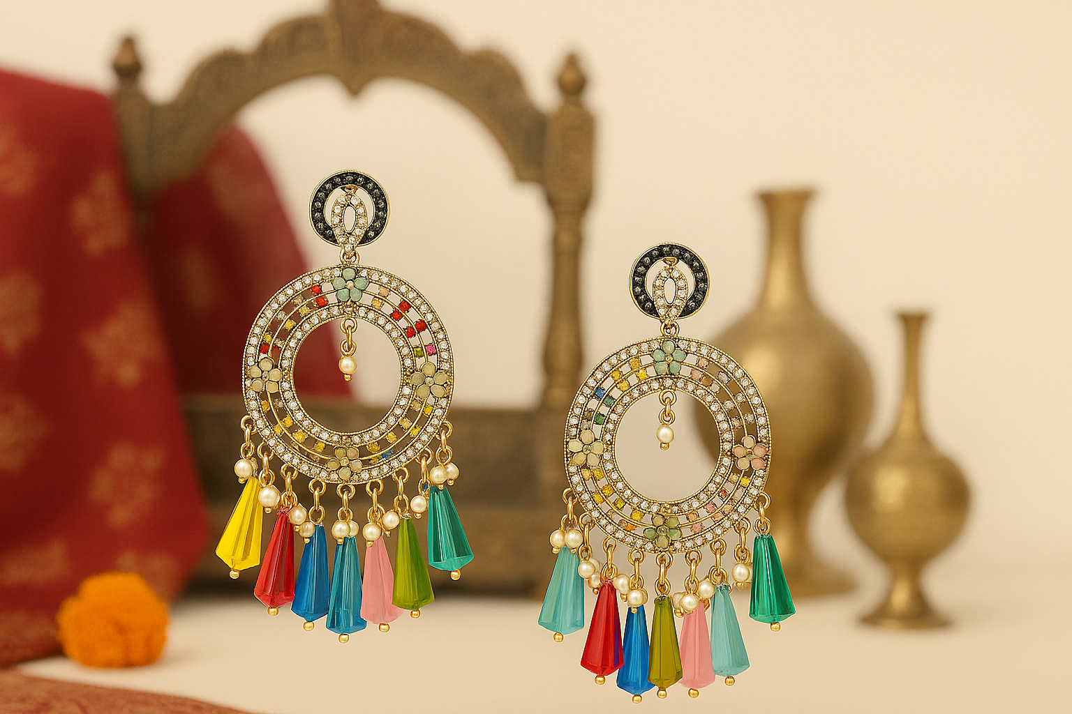 Add a touch of timeless elegance to your look with these exquisite multicolor Chandbali earrings. Crafted with intricate kundan work, delicate pearls, and vibrant glass bead hangings in shades of red, green, blue, yellow, and pink, these earrings perfectly blend tradition with contemporary charm. Lightweight yet statement-making, they are ideal for weddings, festive occasions, or pairing with ethnic outfits to elevate your style.
