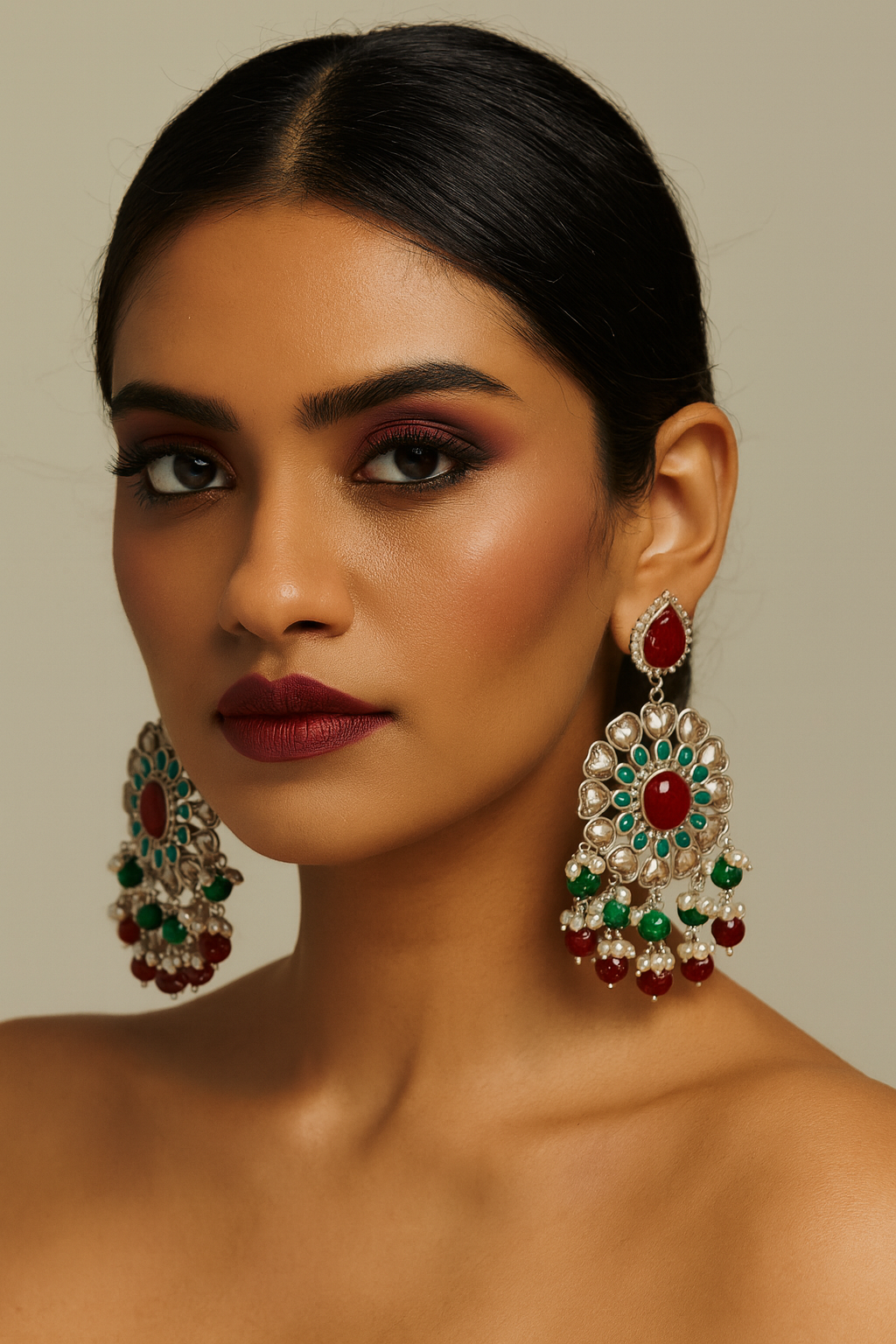 these Dangler Earrings feature a delicate flower pattern adorned with vibrant stones and beads, accented with tiny white pearls. The oxidized finish adds a touch of sophistication to these colorful statement earrings. Elevate any outfit with these handcrafted beauties