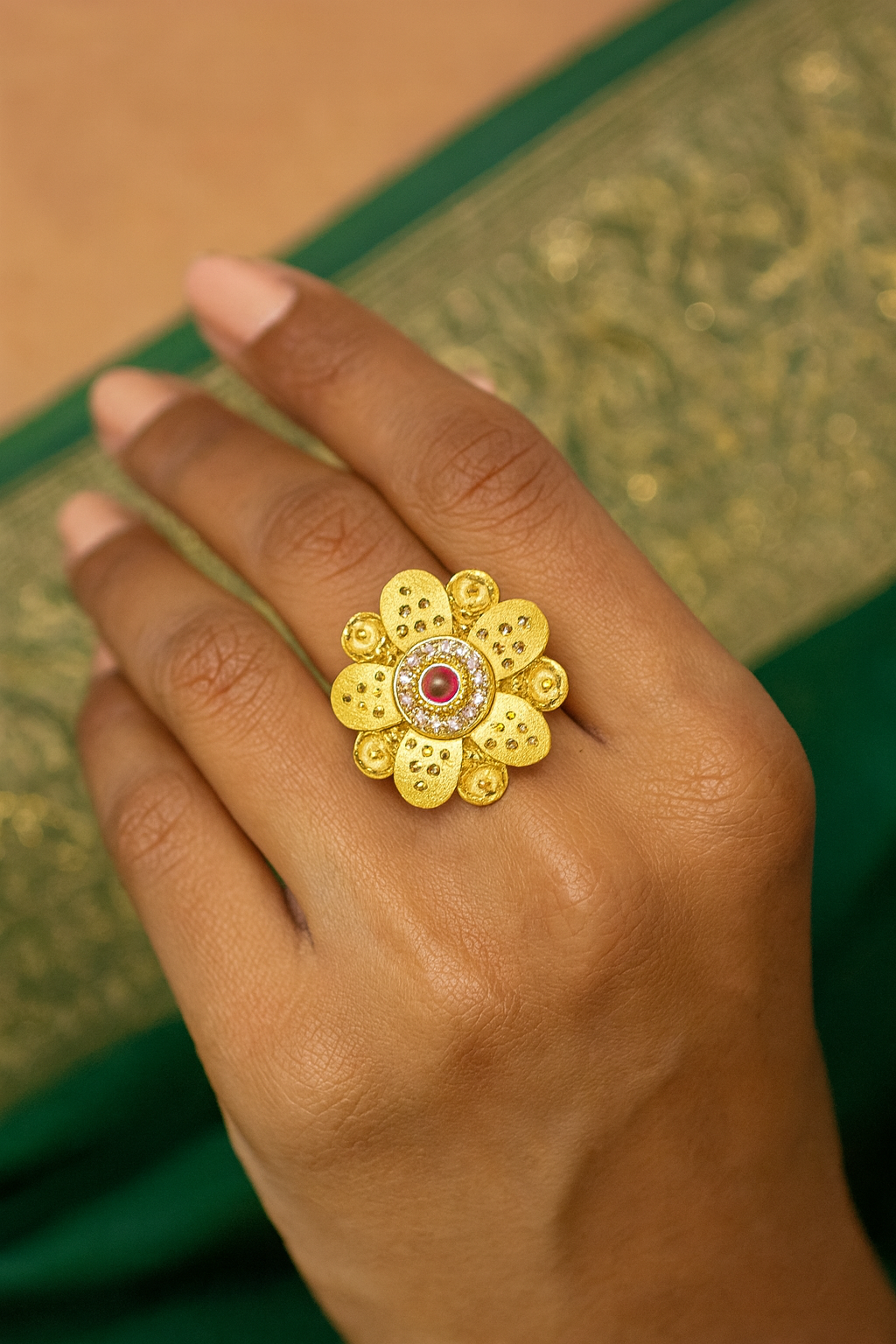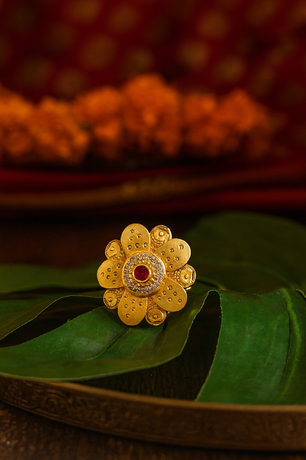 A statement flower ring crafted in radiant gold, featuring delicate petal motifs adorned with intricate detailing. At its heart lies a vivid ruby, encircled by shimmering diamonds, symbolizing elegance and timeless beauty. Perfect for festive occasions, weddings, or as a treasured gift.