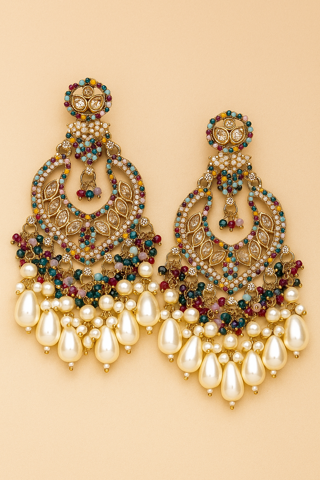 Royal Kundan & Pearl Chandbali Earrings with Multicolor Beads