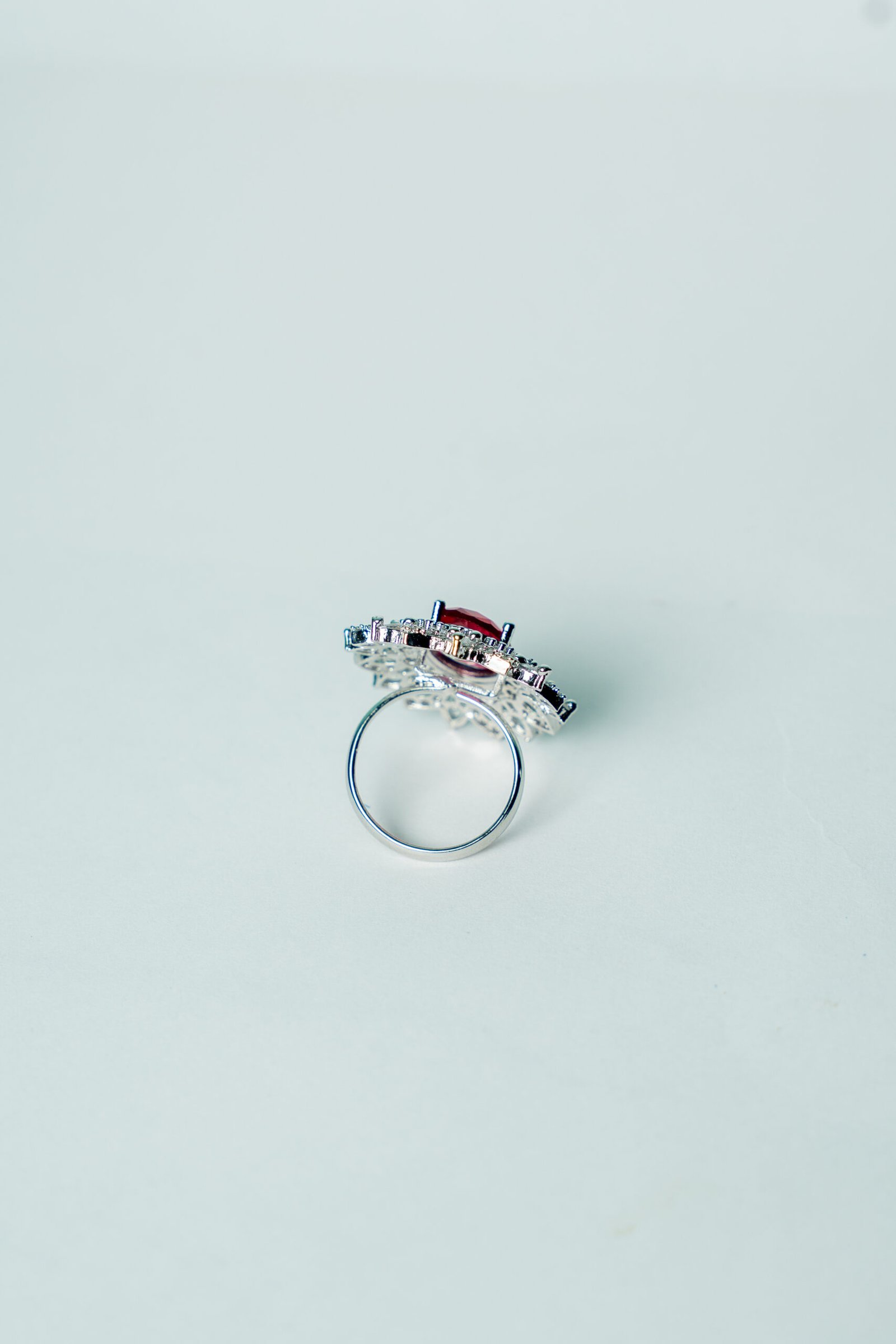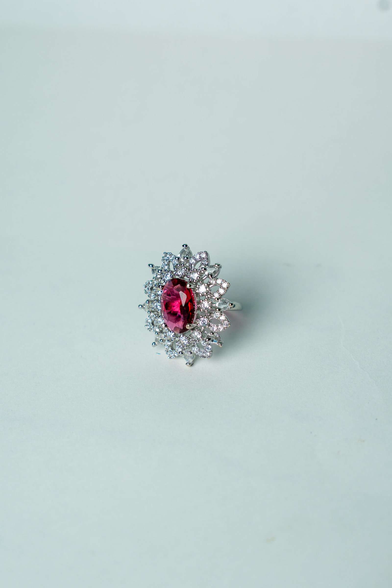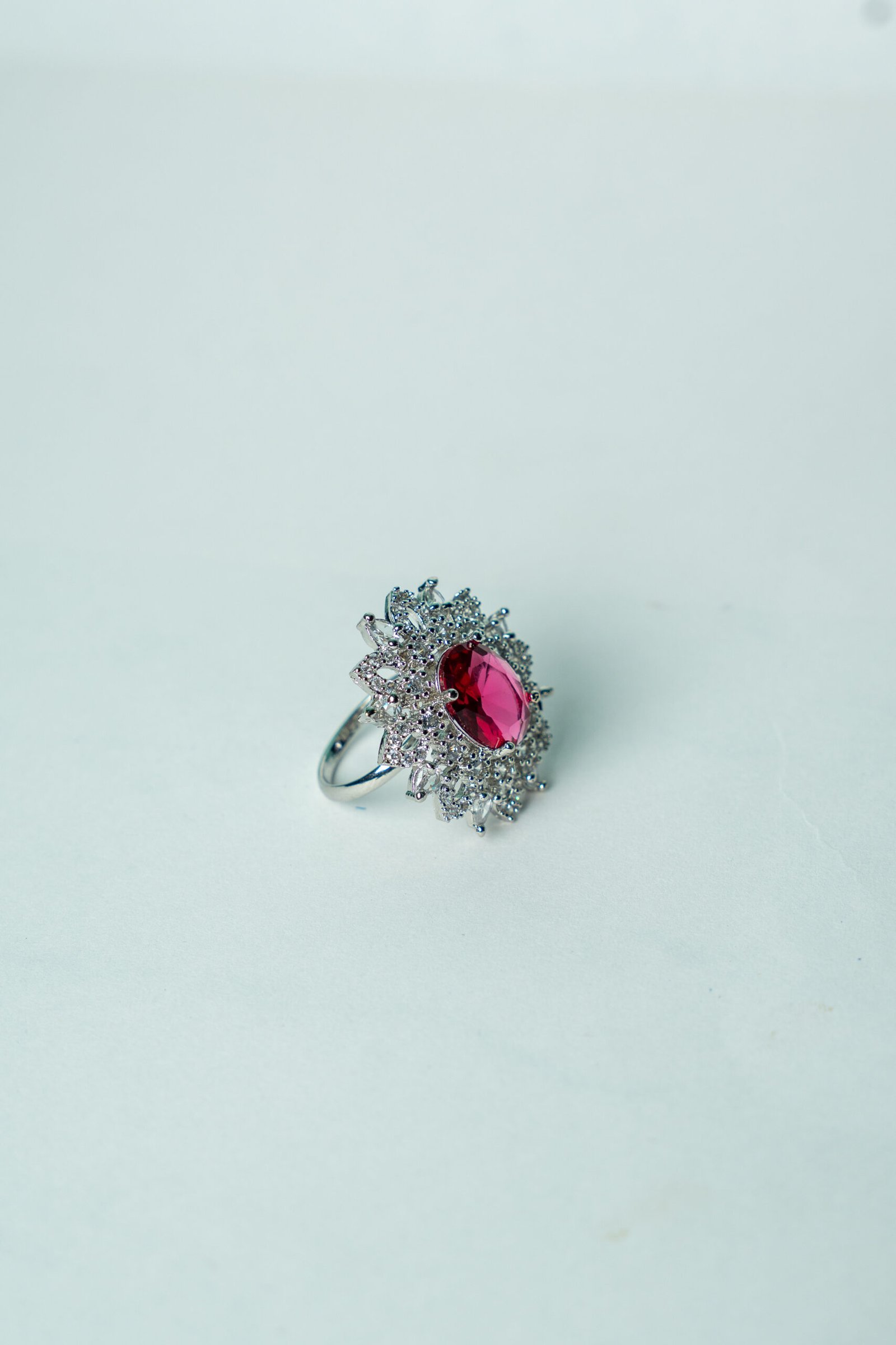 This stunning cocktail ring features a vibrant oval-cut ruby red gemstone at its center, surrounded by a dazzling sunburst halo of marquise and round-cut white crystals. The intricate design sparkles with brilliance, while the silver-toned band adds a touch of modern refinement. Perfect for grand occasions, evening parties, or festive gatherings, this ring is a bold and timeless statement of luxury.