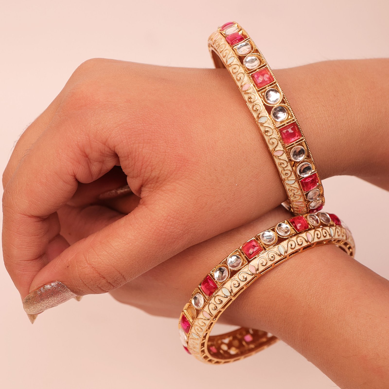 Set of 2 22K Gold-Plated Ruby Pink & White Cubic Studded Premium Bangles