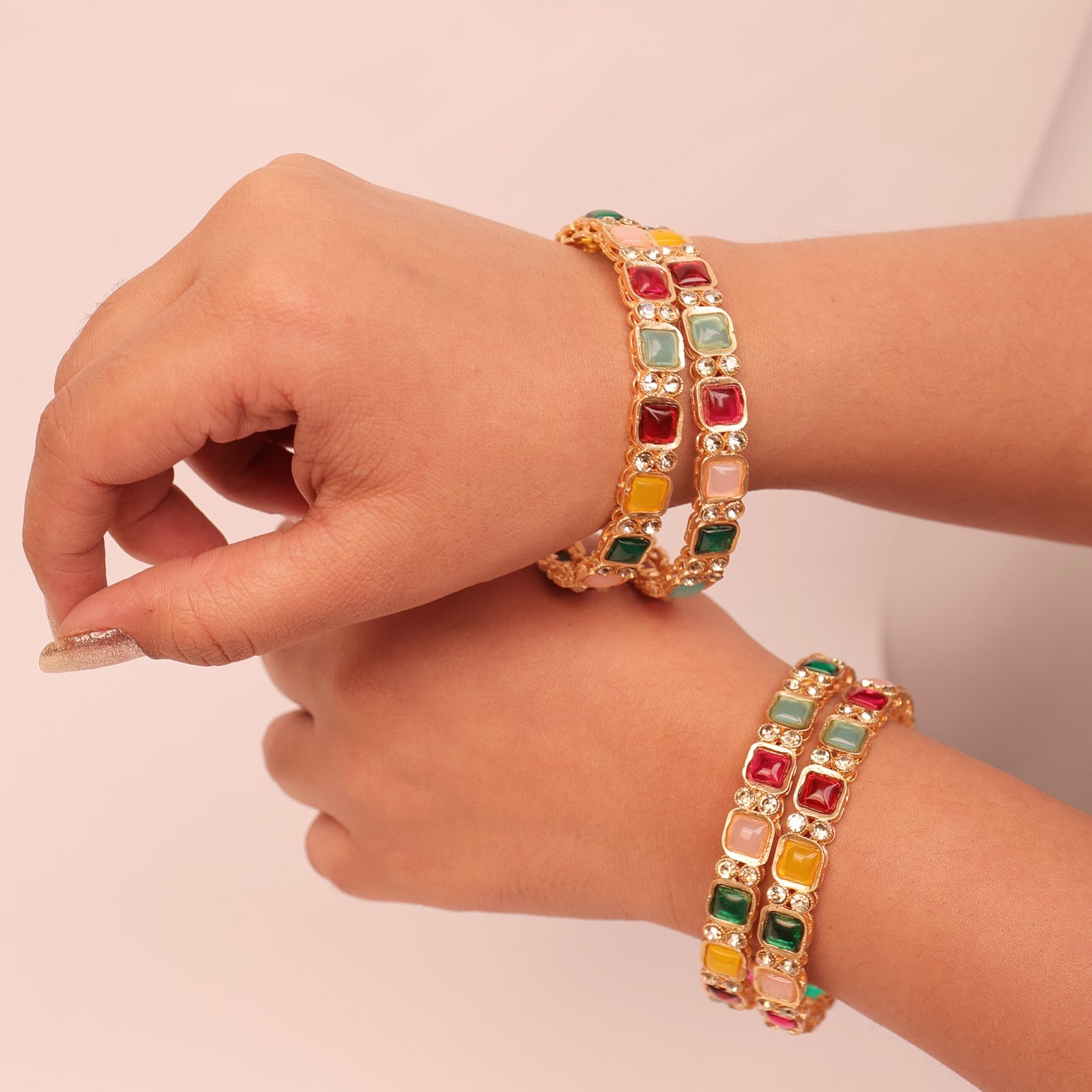 Set of 4 18K Gold-Plated Multi-Coloured Oval Stone Studded Designer Bangles