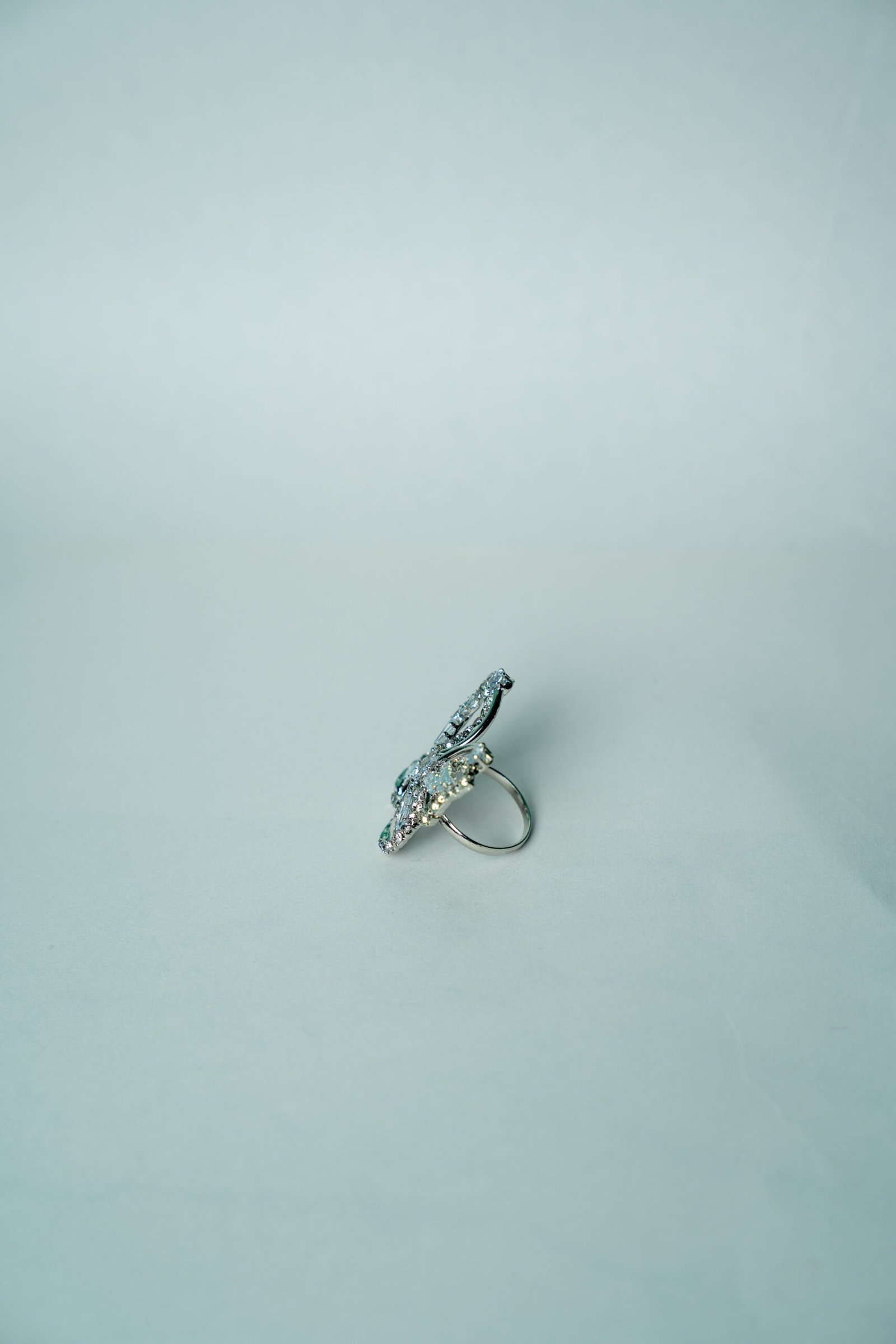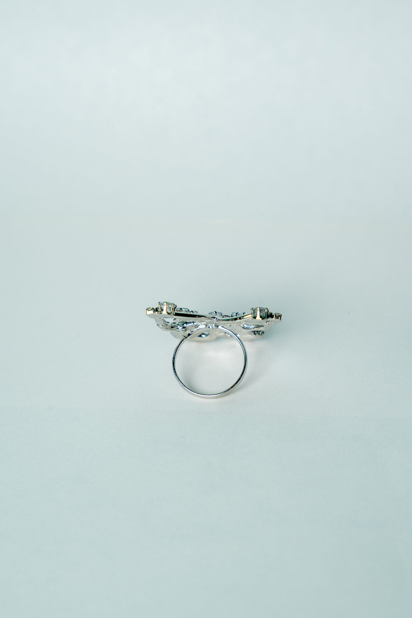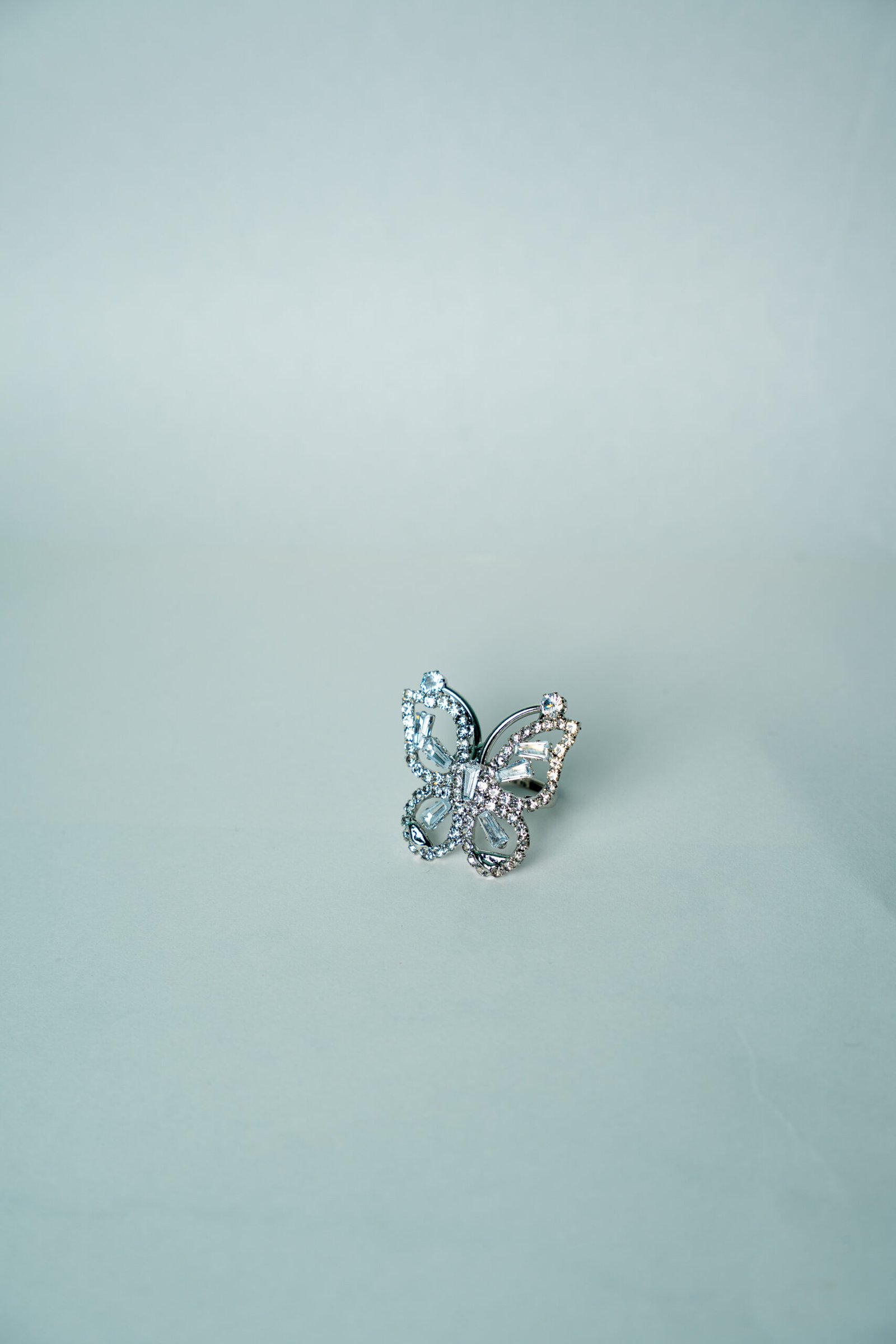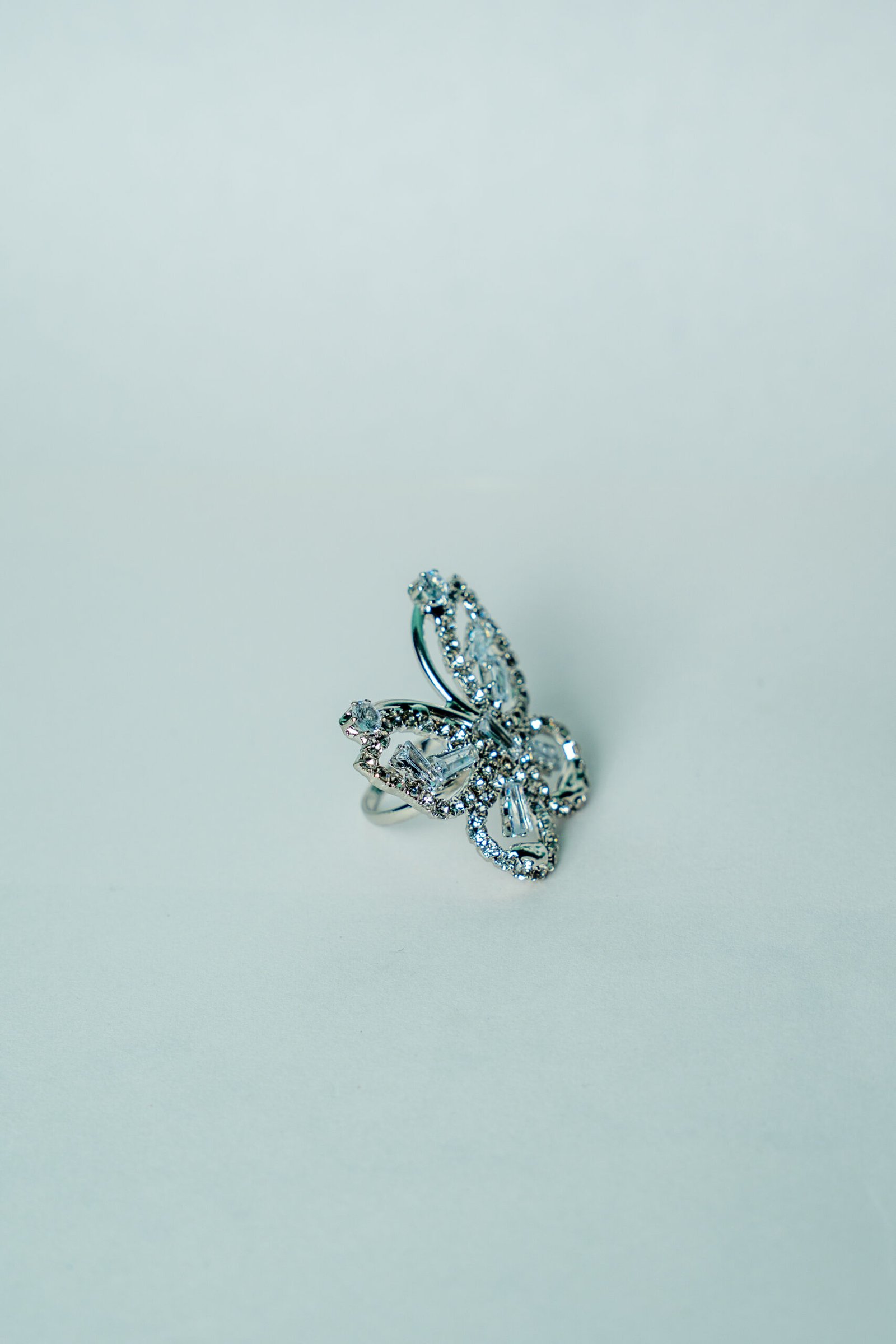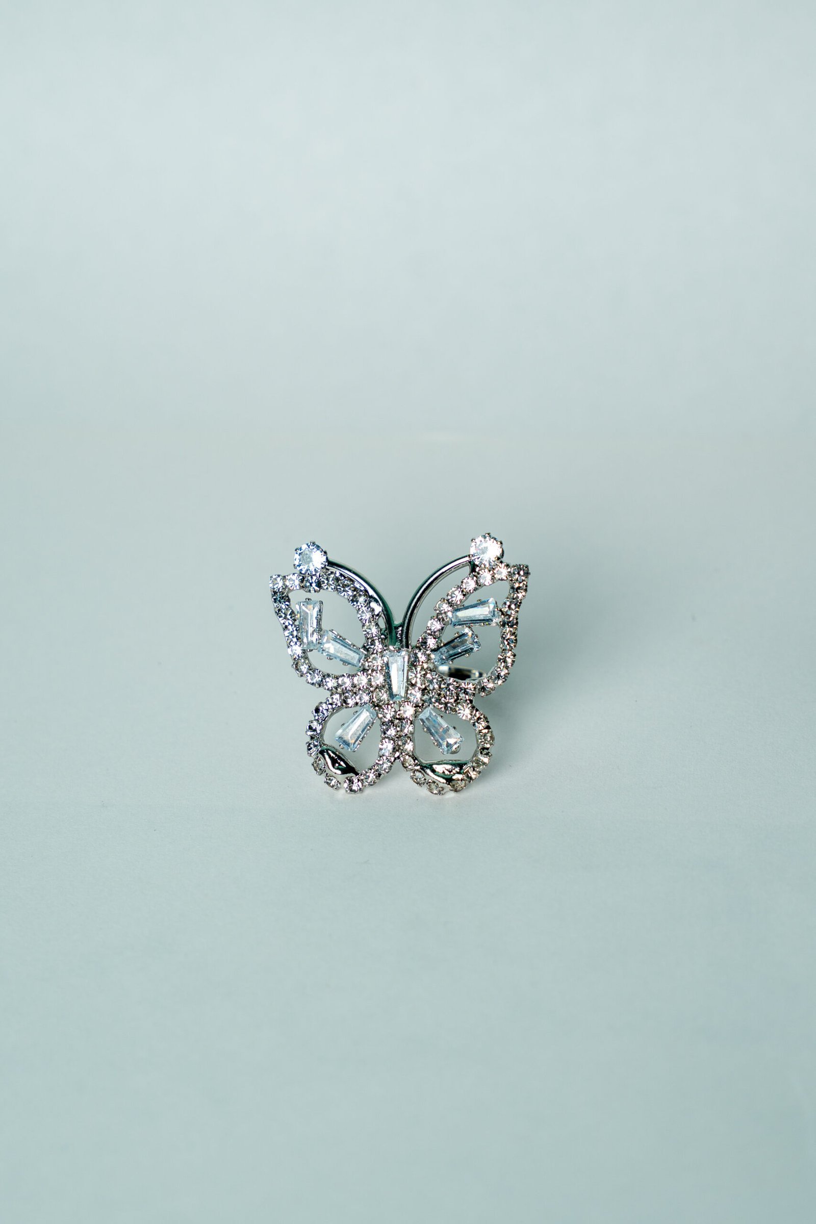 A delicate butterfly brought to life in radiant silver tones, this ring is adorned with sparkling pear-cut and baguette crystals that form ethereal wings. Outlined with a halo of round-cut stones, the design captures light beautifully, creating a luminous fluttering effect. Symbolizing transformation and freedom, this enchanting ring is perfect for adding a whimsical yet luxurious touch to any look.