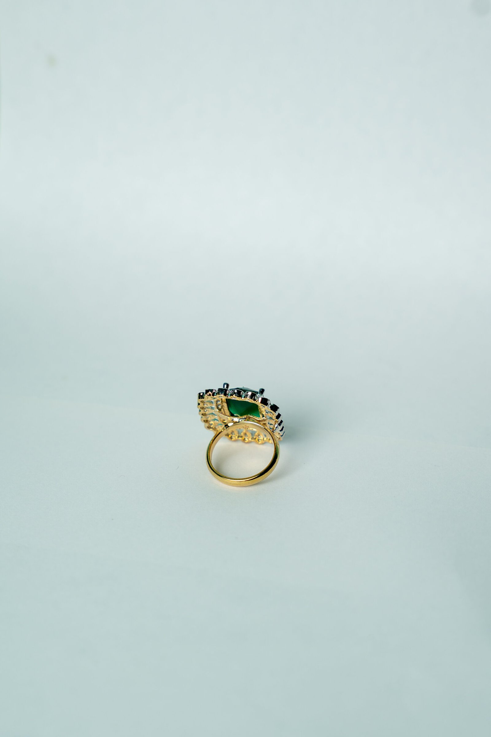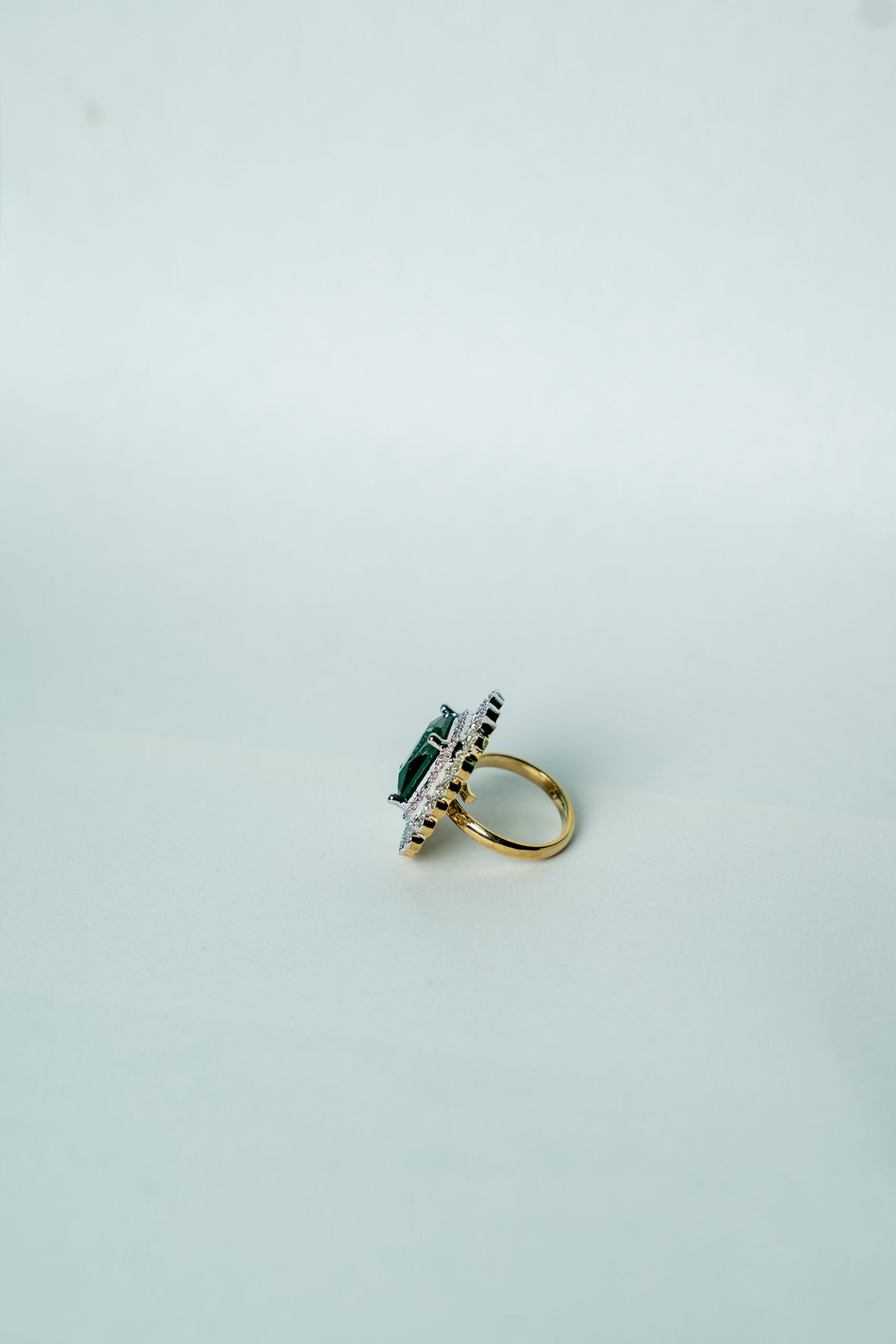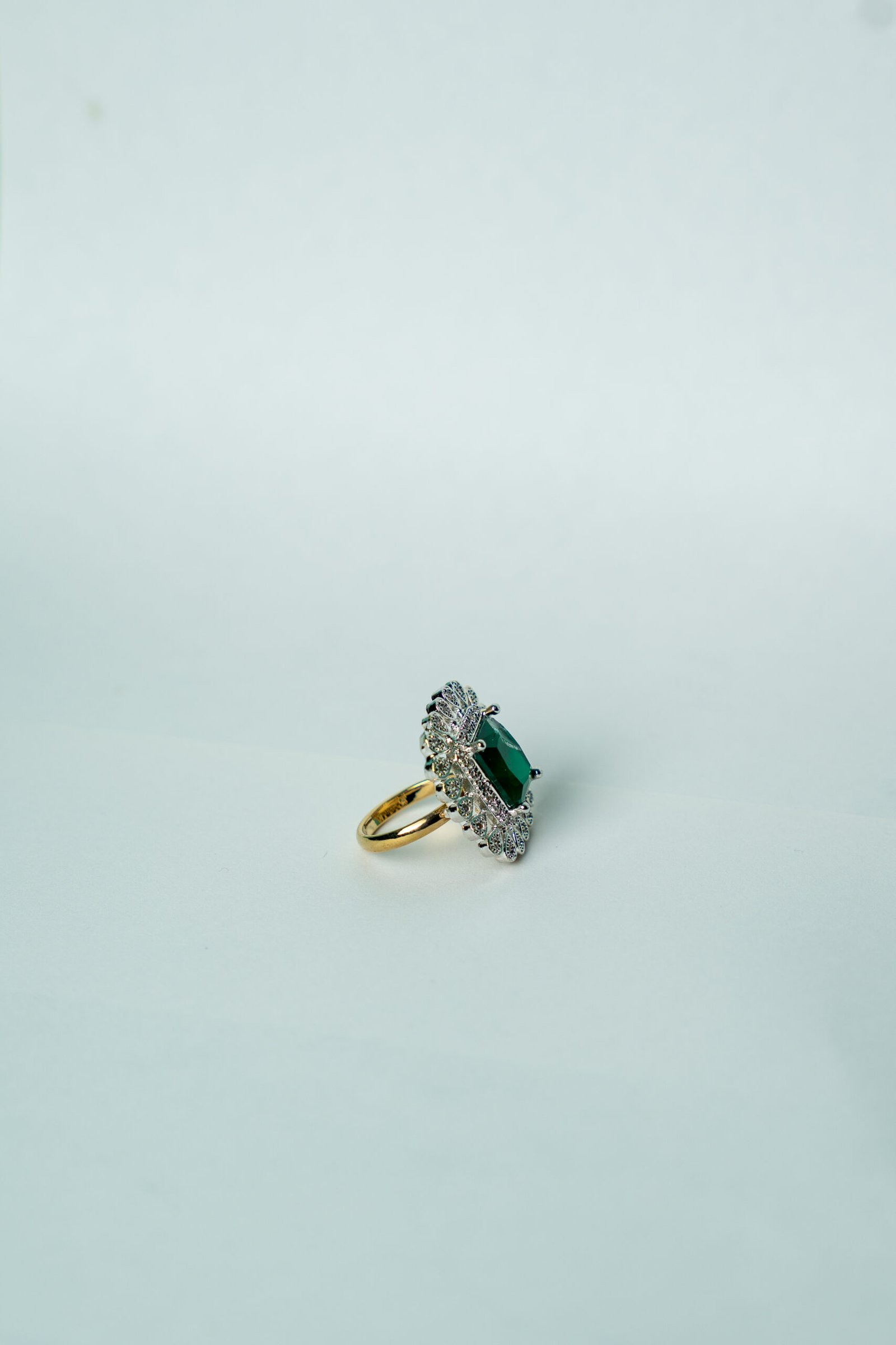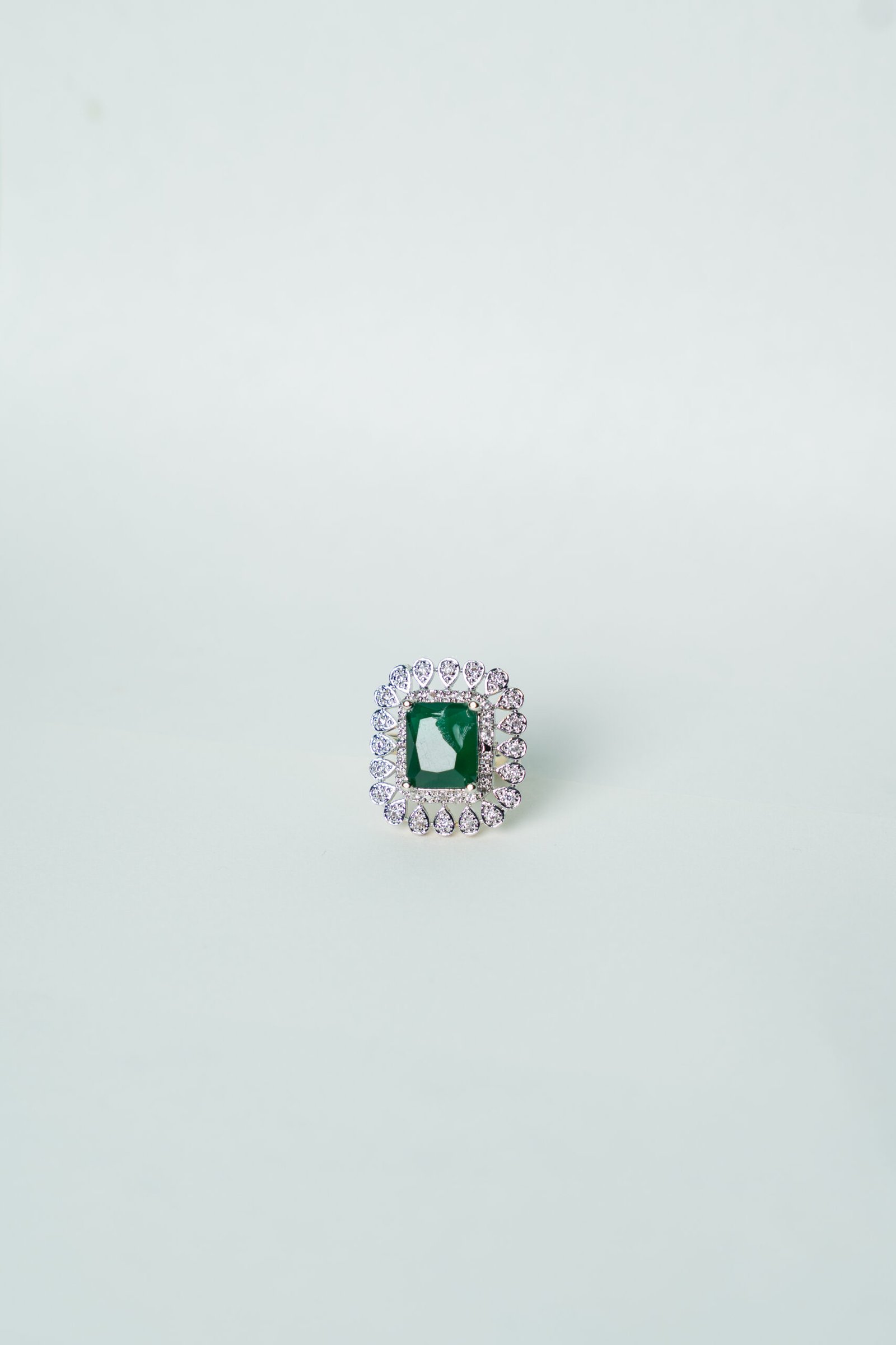 This bold and elegant statement ring features a striking square-cut emerald green gemstone, framed by a halo of sparkling teardrop-shaped white crystals. The unique blend of sharp edges and soft curves in the design creates a luxurious, modern appeal. Perfect for cocktail parties, evening gatherings, or formal occasions, this ring is a true symbol of sophistication and timeless style.