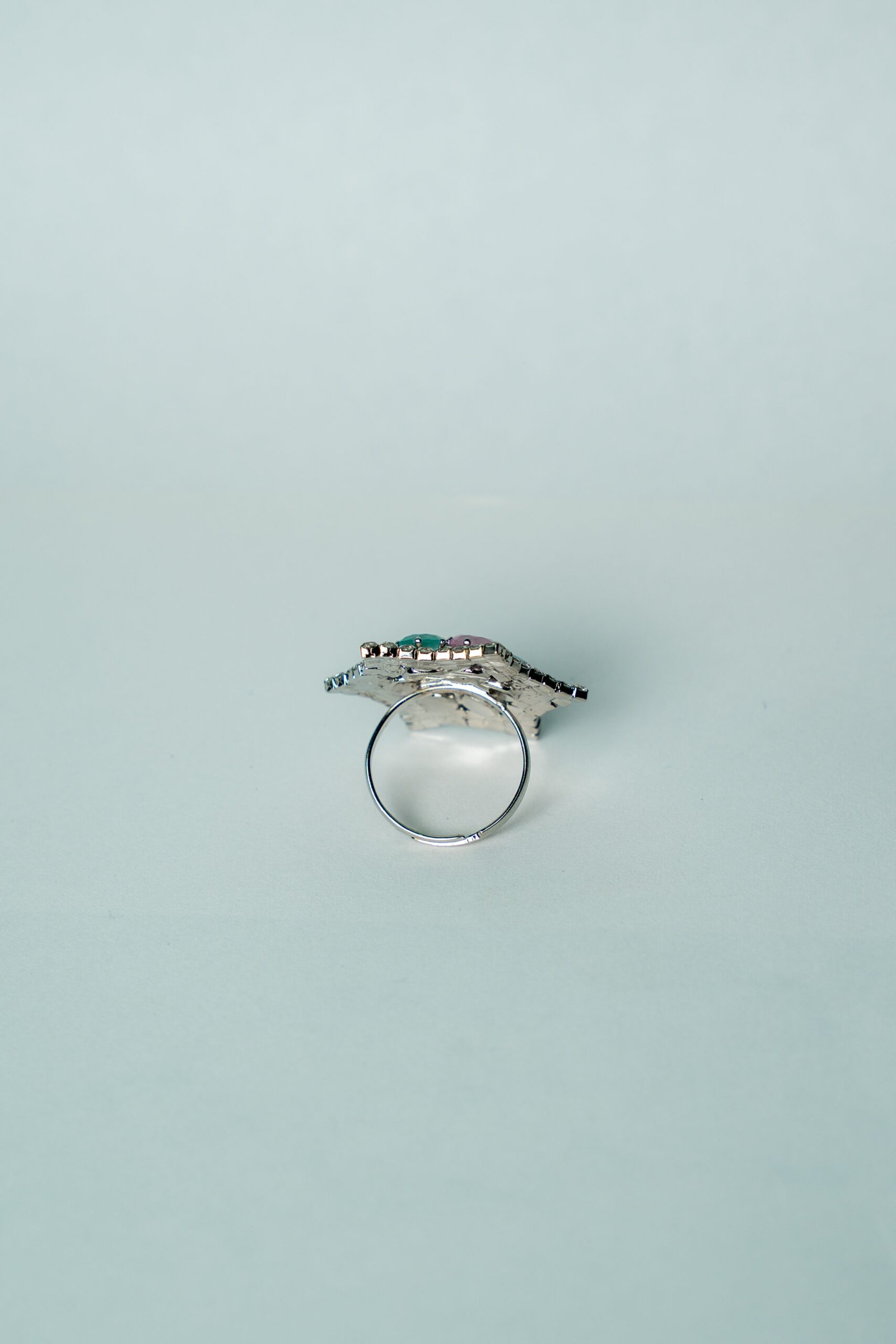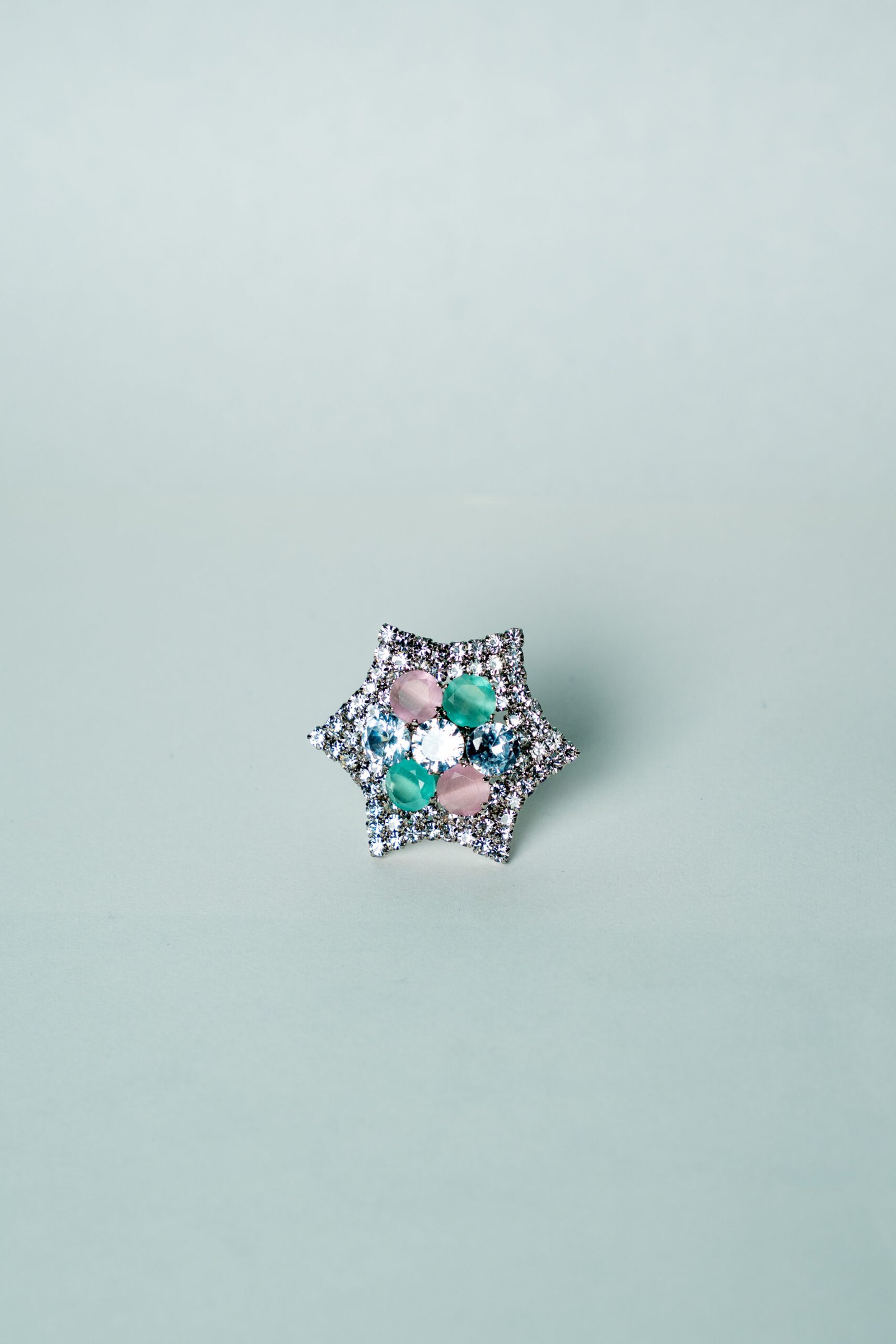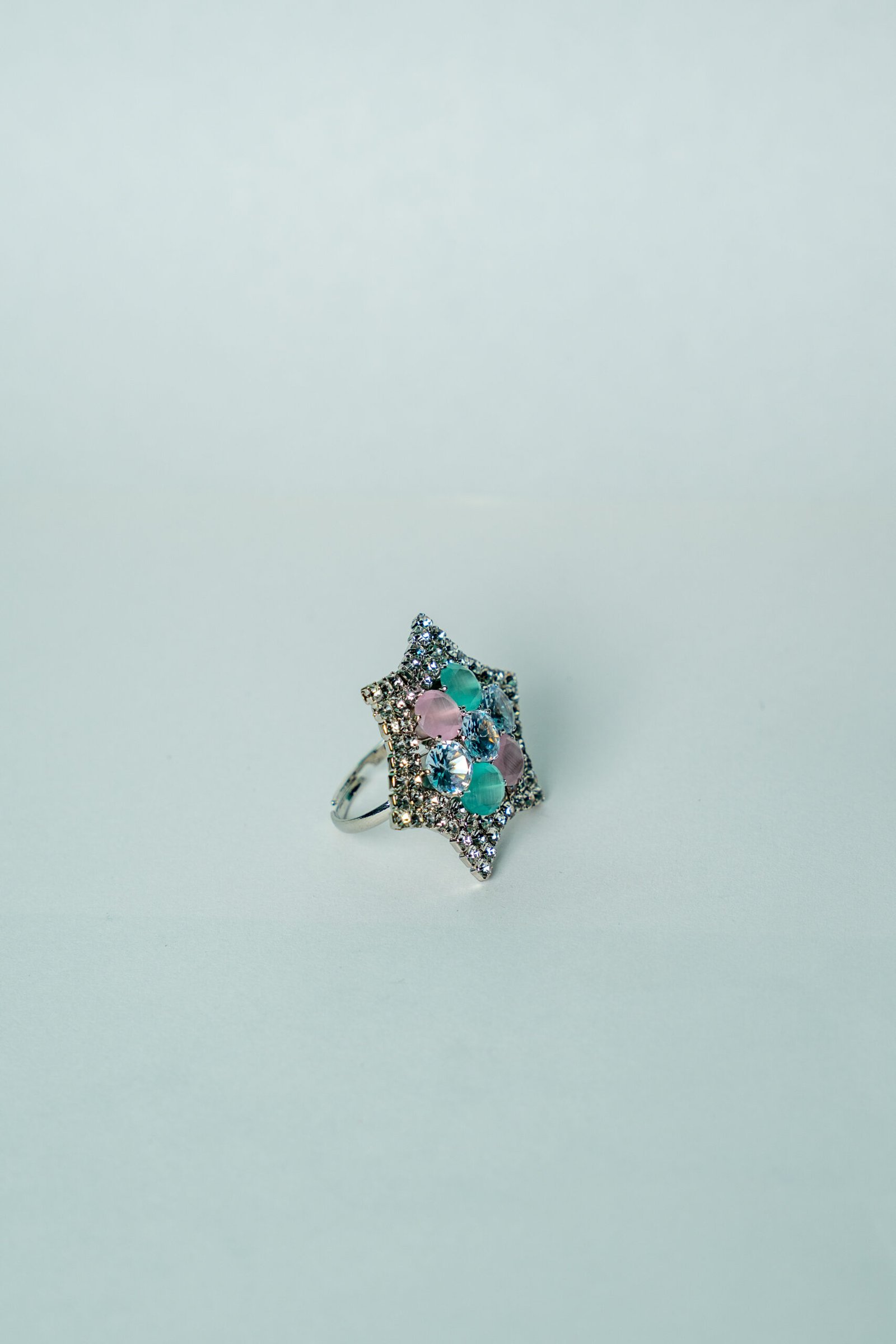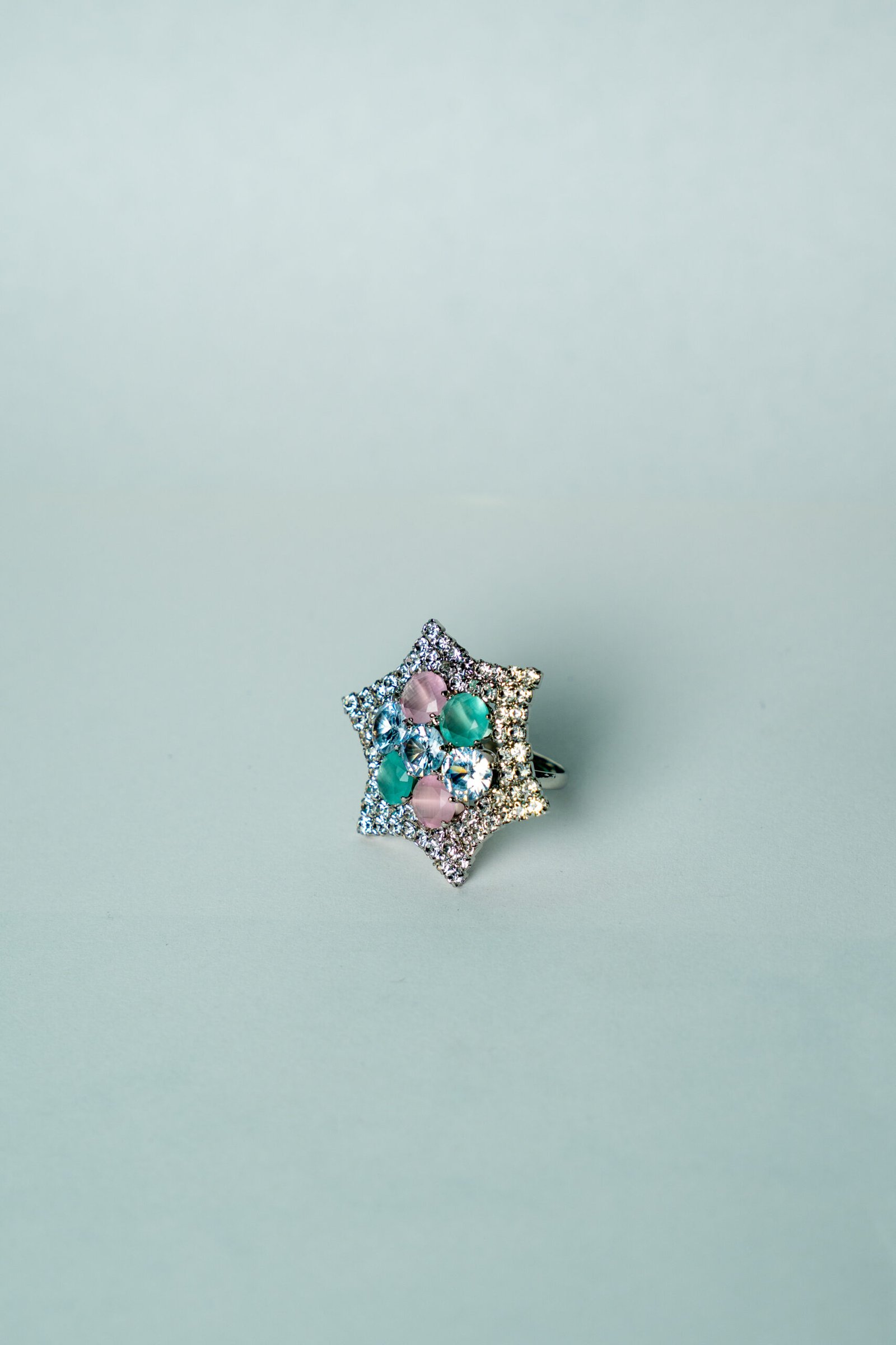 A dazzling six-point star design, this statement ring sparkles with a border of fine white crystals framing a playful arrangement of pastel gems. Soft pink and aqua-green stones, paired with icy blue accents, create a refreshing and modern color contrast. Set on a silver-toned base, this artistic piece is perfect for those who love bold, whimsical, and contemporary jewelry styles.