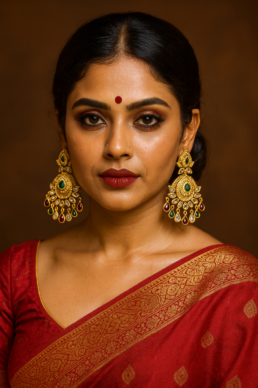 A pair of ornate handcrafted earrings designed with intricate gold work, studded with red, green, and white stones in classic Kundan style. The floral and chandelier-like design reflects elegance and heritage. Set against a backdrop of red silk, a glowing diya, and a brass idol of Lord Ganesha, the image radiates festive charm and cultural richness.